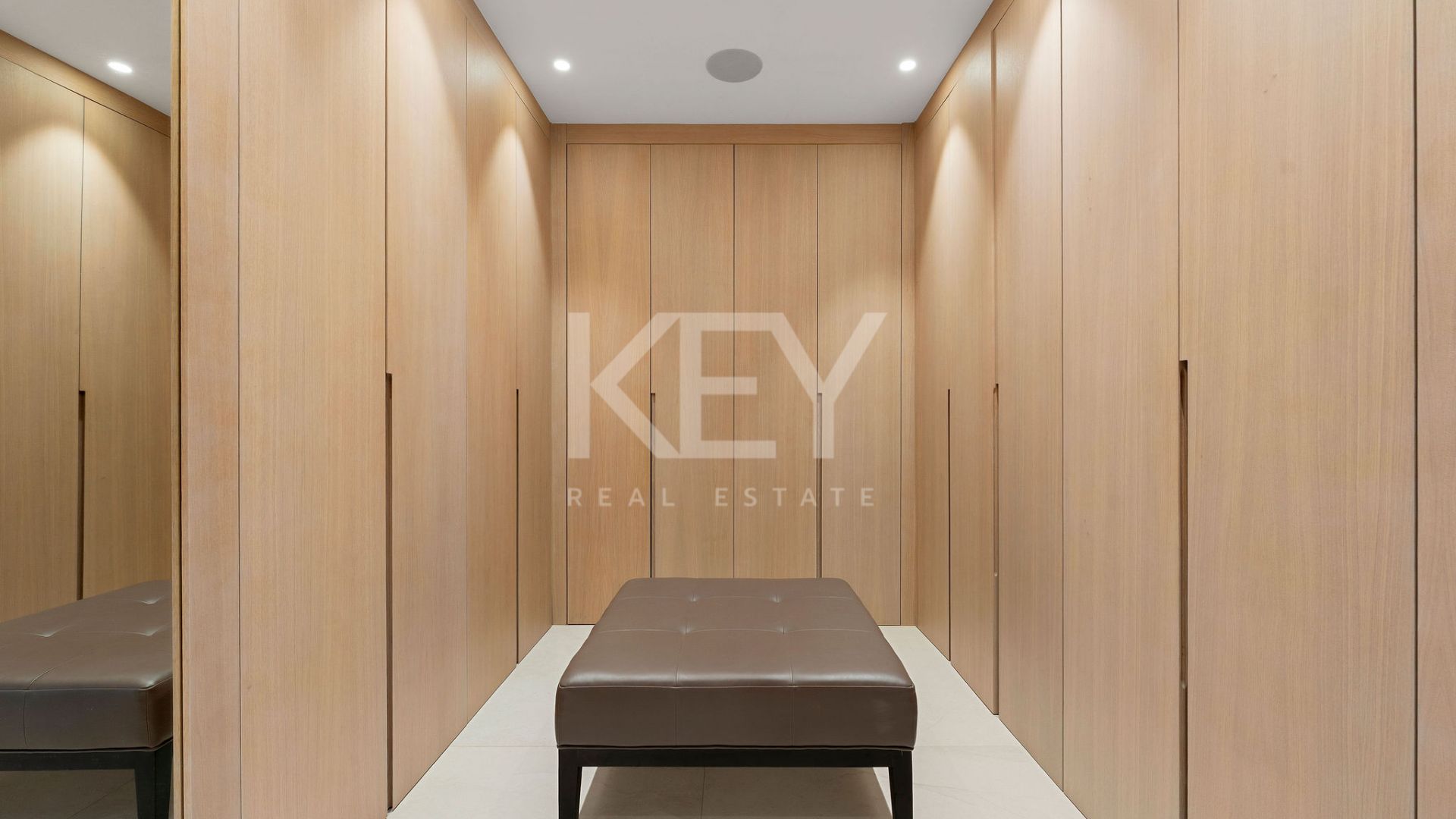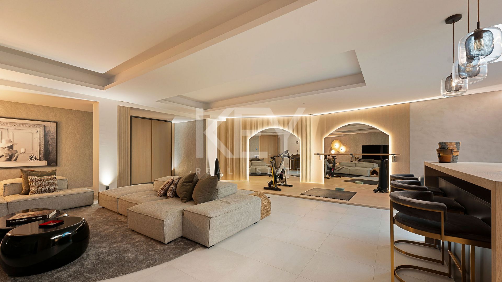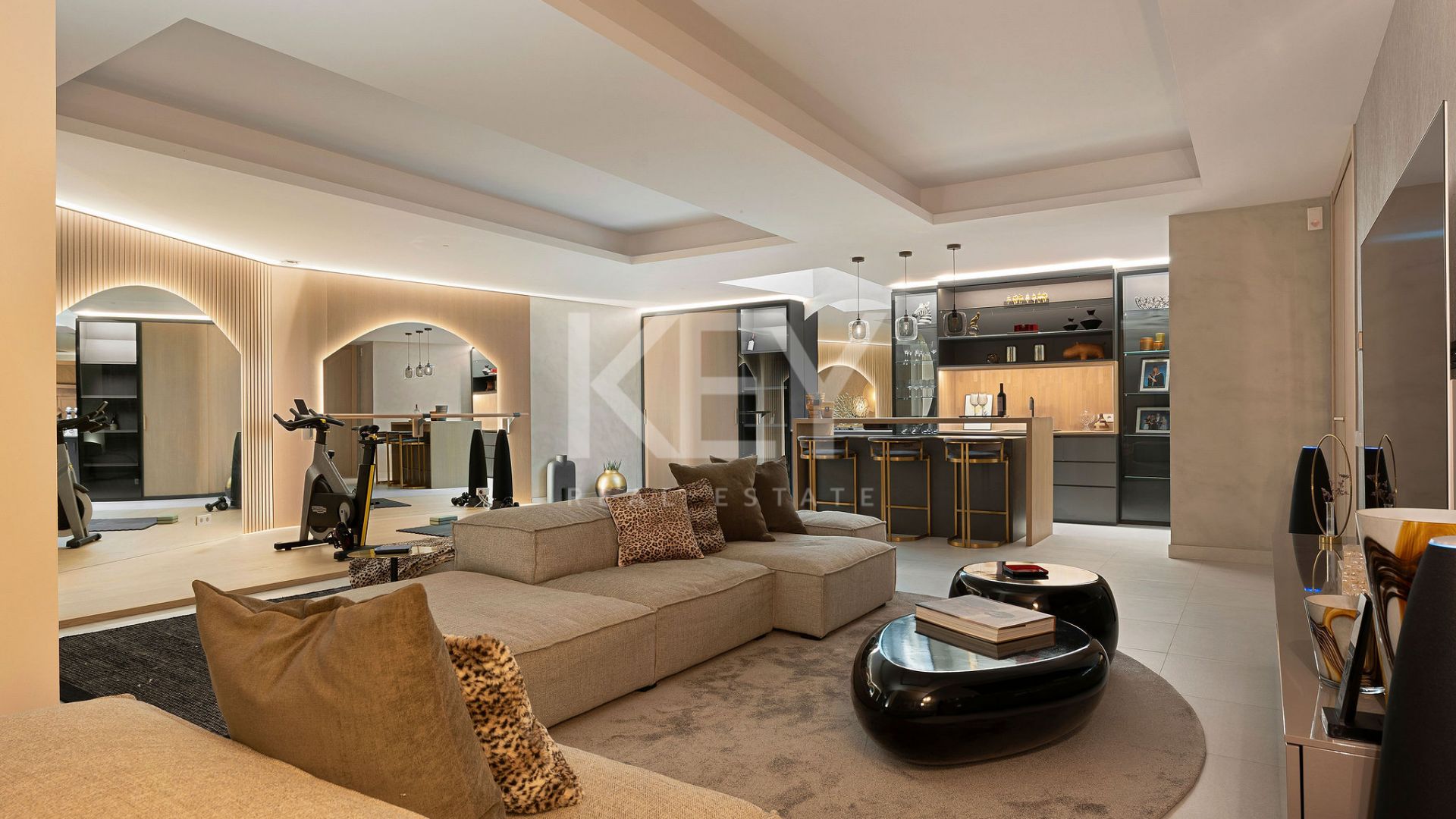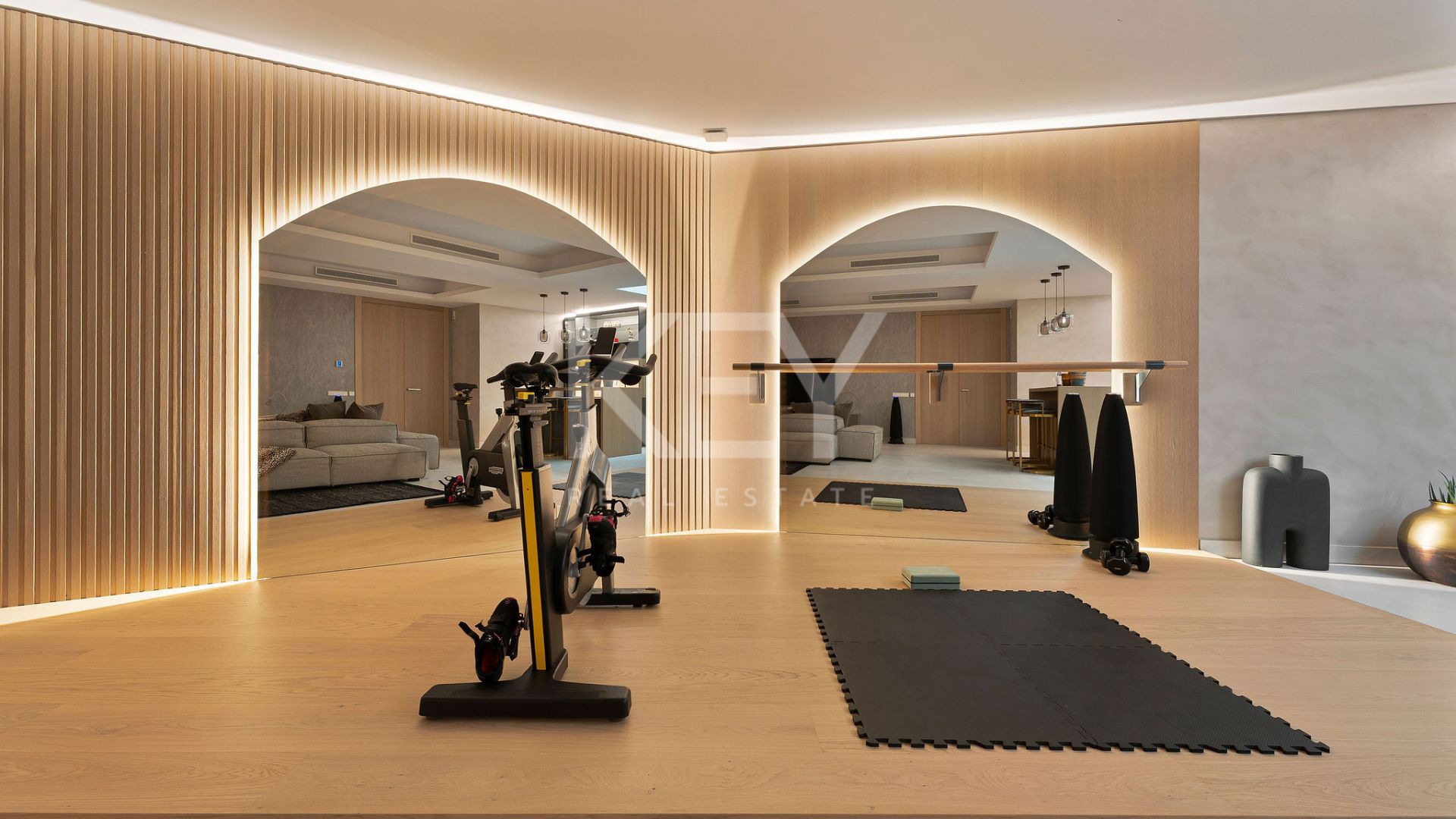 La planta inferior amplía el espacio habitable con un cuarto dormitorio, sala familiar, gimnasio, sala de cine, lavandería y trastero. Un ascensor privado conecta todos los niveles, aportando comodidad y accesibilidad.