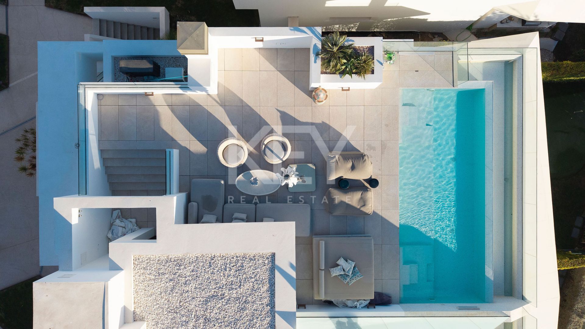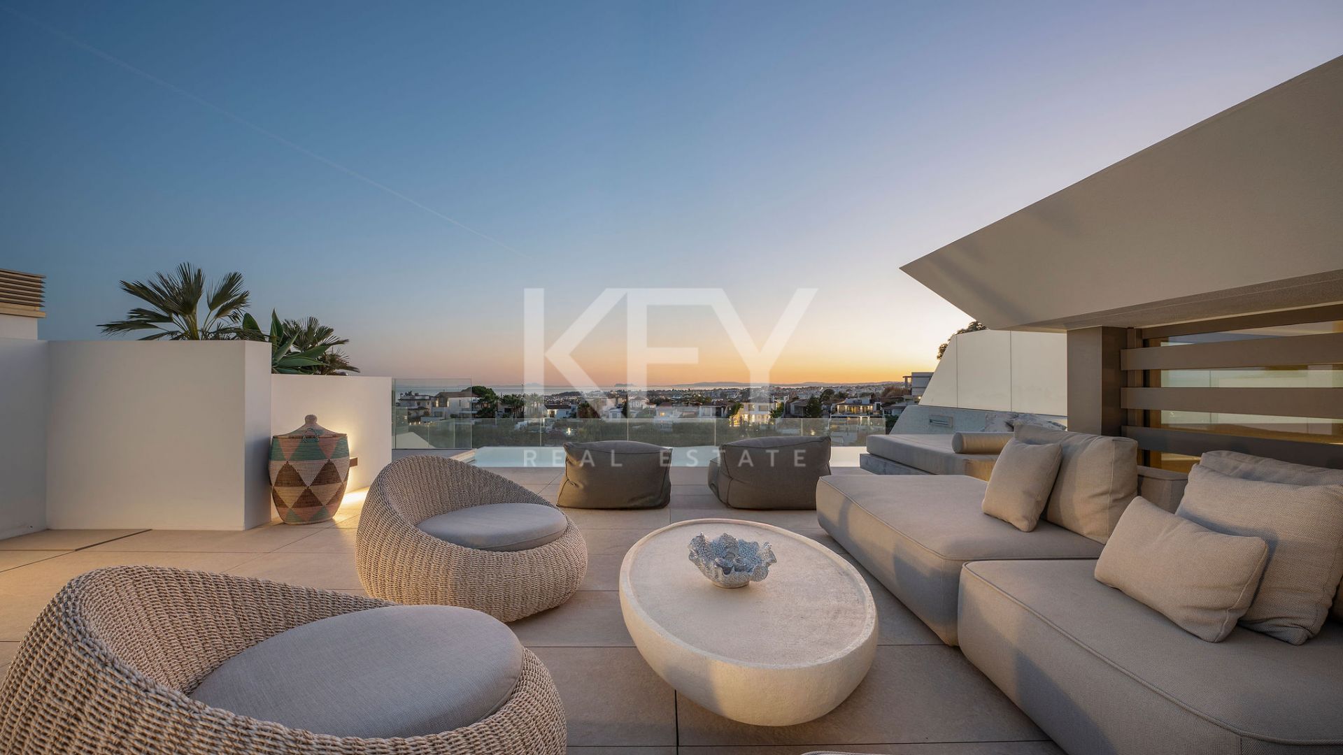 El solárium en la azotea es la joya de la villa: cuenta con piscina privada, zonas para tomar el sol y vistas panorámicas a la montaña de La Concha, el Mediterráneo, Gibraltar y África.