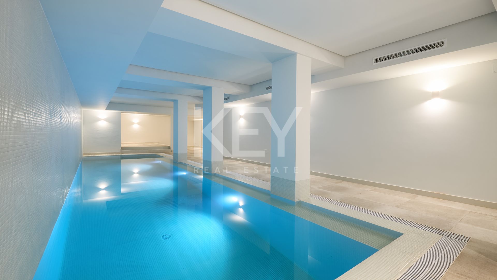 En la planta superior, la suite principal incluye una terraza privada, vestidor y un lujoso baño, acompañada de dos dormitorios adicionales en suite, cada uno con acceso a su propia terraza. La planta inferior está completamente sobre el nivel del suelo y ofrece acceso directo a la piscina, ideal tanto para el bienestar como para el entretenimiento. Incluye un spa con piscina cubierta climatizada, gimnasio, sala de masajes, cine, zona de juegos, bodega y bar.