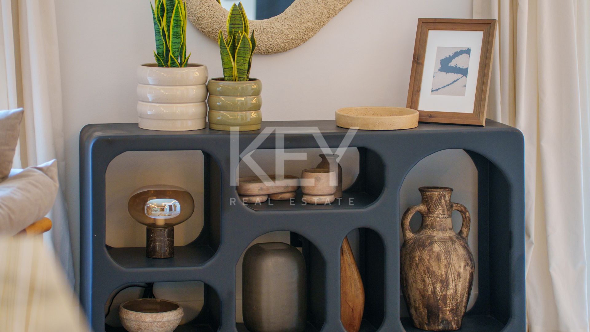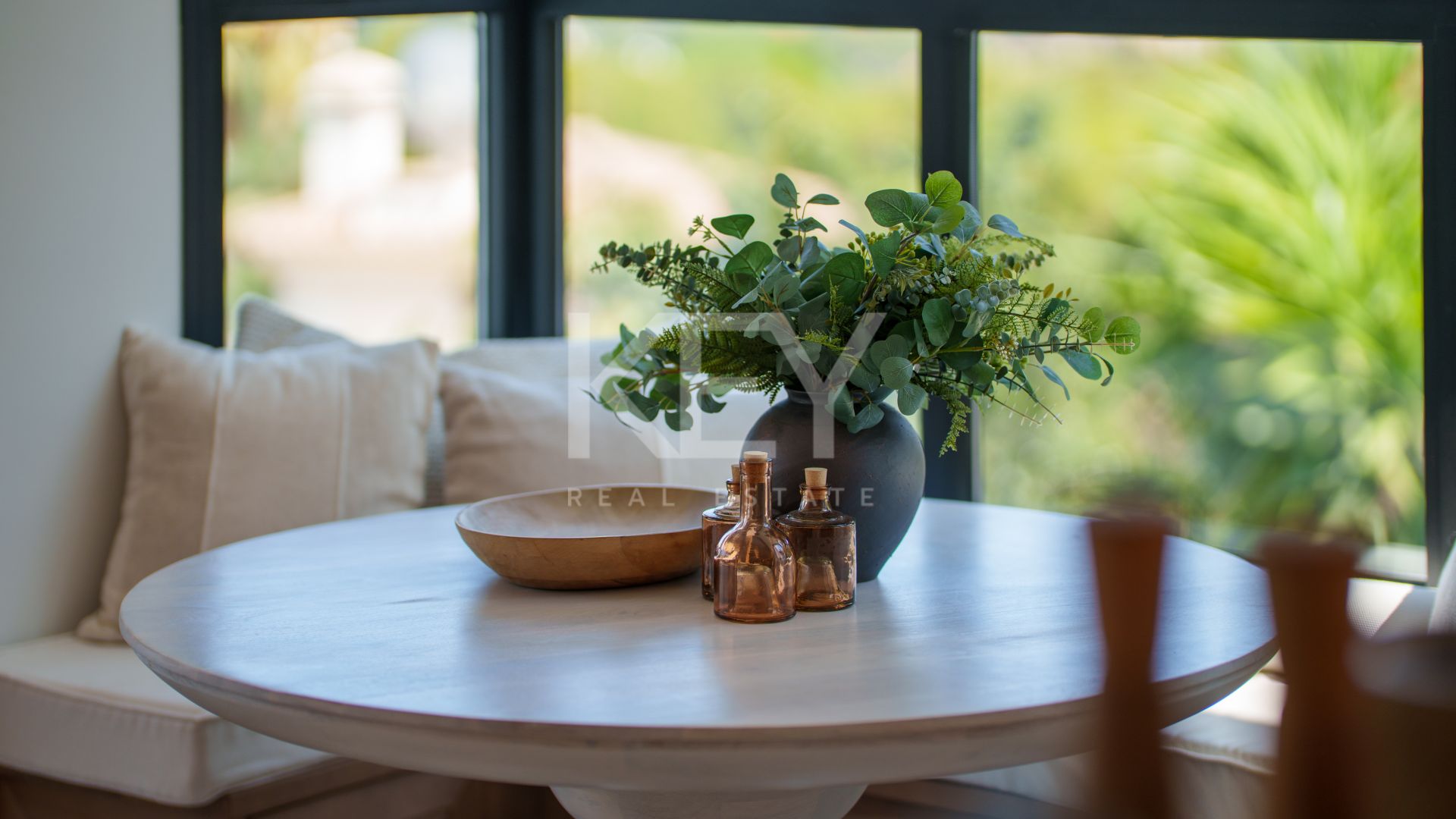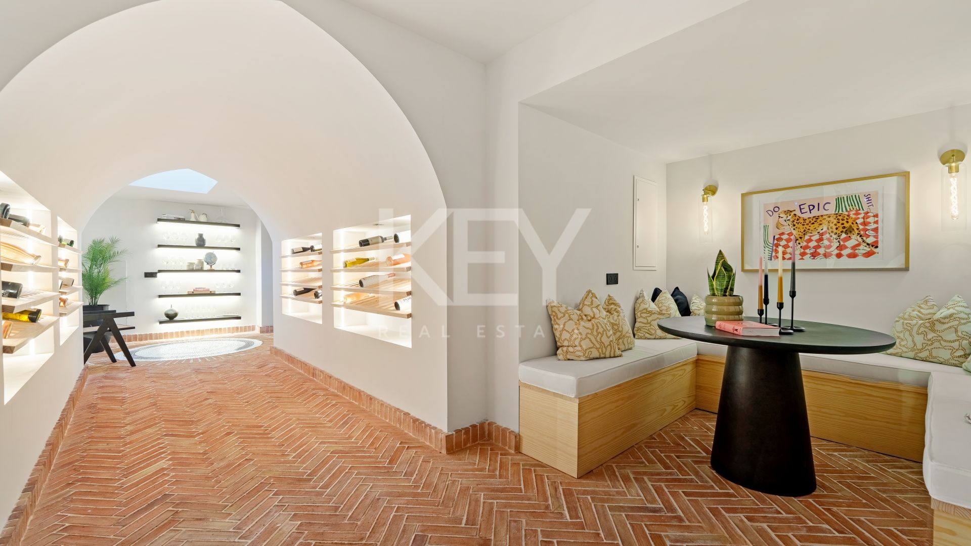 Al entrar en la villa, te recibe un gran vestíbulo que conduce a una espaciosa sala de estar y comedor. La cocina de estilo sueco, completamente equipada, cuenta con electrodomésticos de primera línea Gaggenau y cuenta con una isla de cocina. La villa también incluye una habitación para invitados, una cocina exterior, un cine y un bar, perfectos para el confort personal, completa privacidad y para alojar a visitantes.