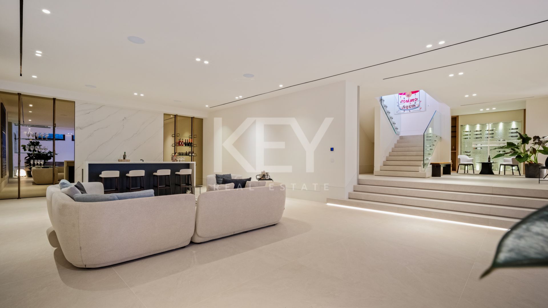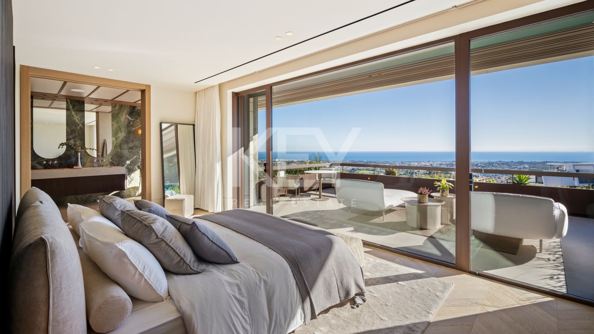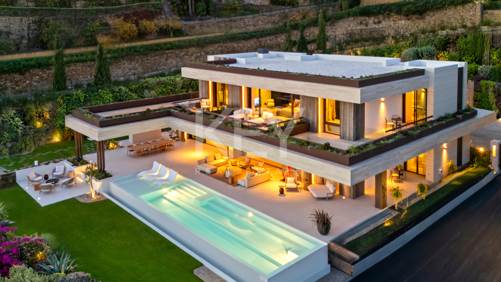 Esta villa abarca aproximadamente 869 m² y se distribuye en tres niveles. Ofrece cinco amplios dormitorios, incluida una suite principal con terraza privada, y seis baños. La sala principal es de concepto abierto, integrando una sala de estar, comedor y una cocina de diseño equipada con electrodomésticos de alta gama de Gaggenau y Miele. Cada habitación se conecta a amplias terrazas al aire libre, proporcionando un espacio ideal para relajarse y recibir invitados.