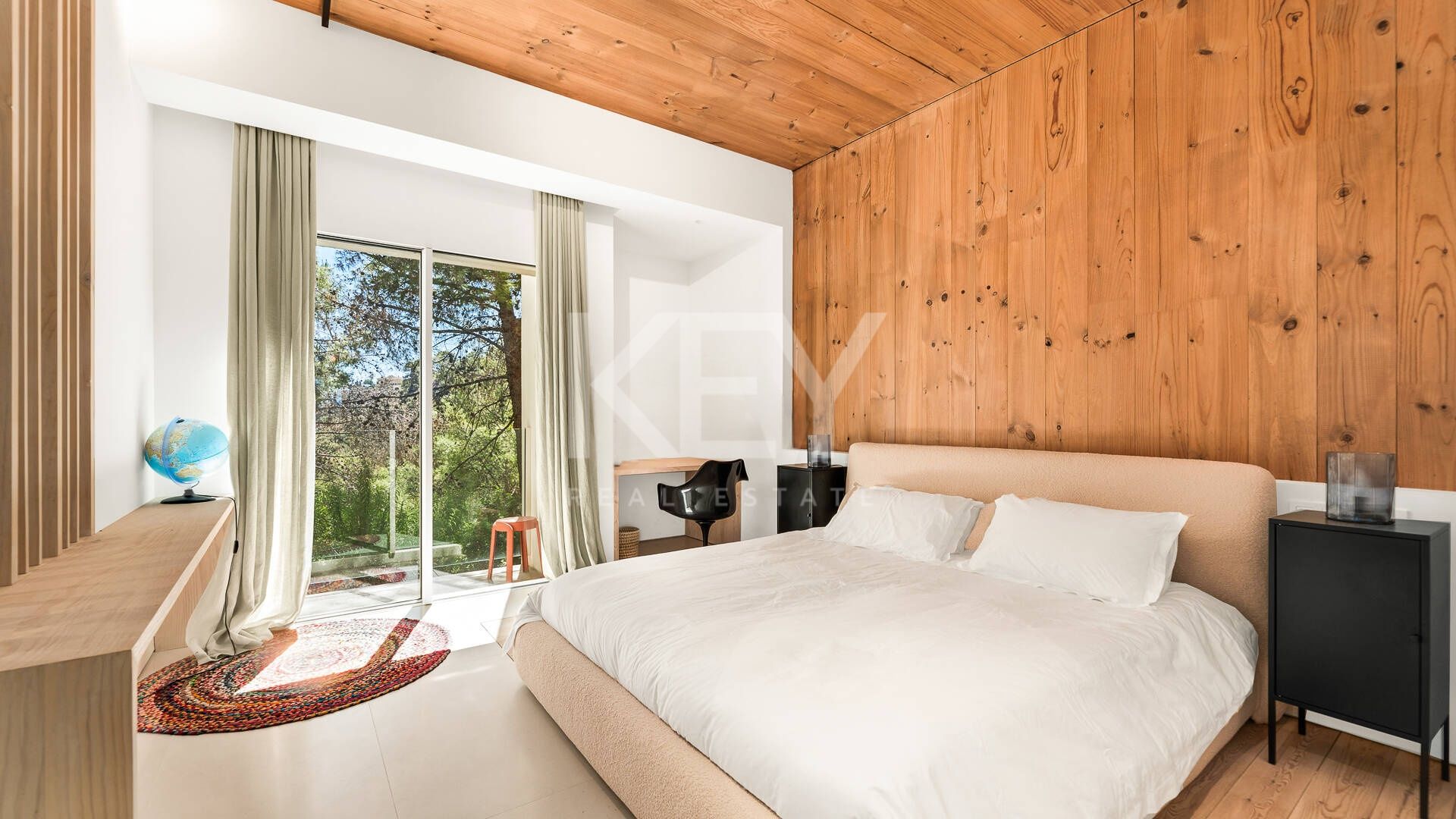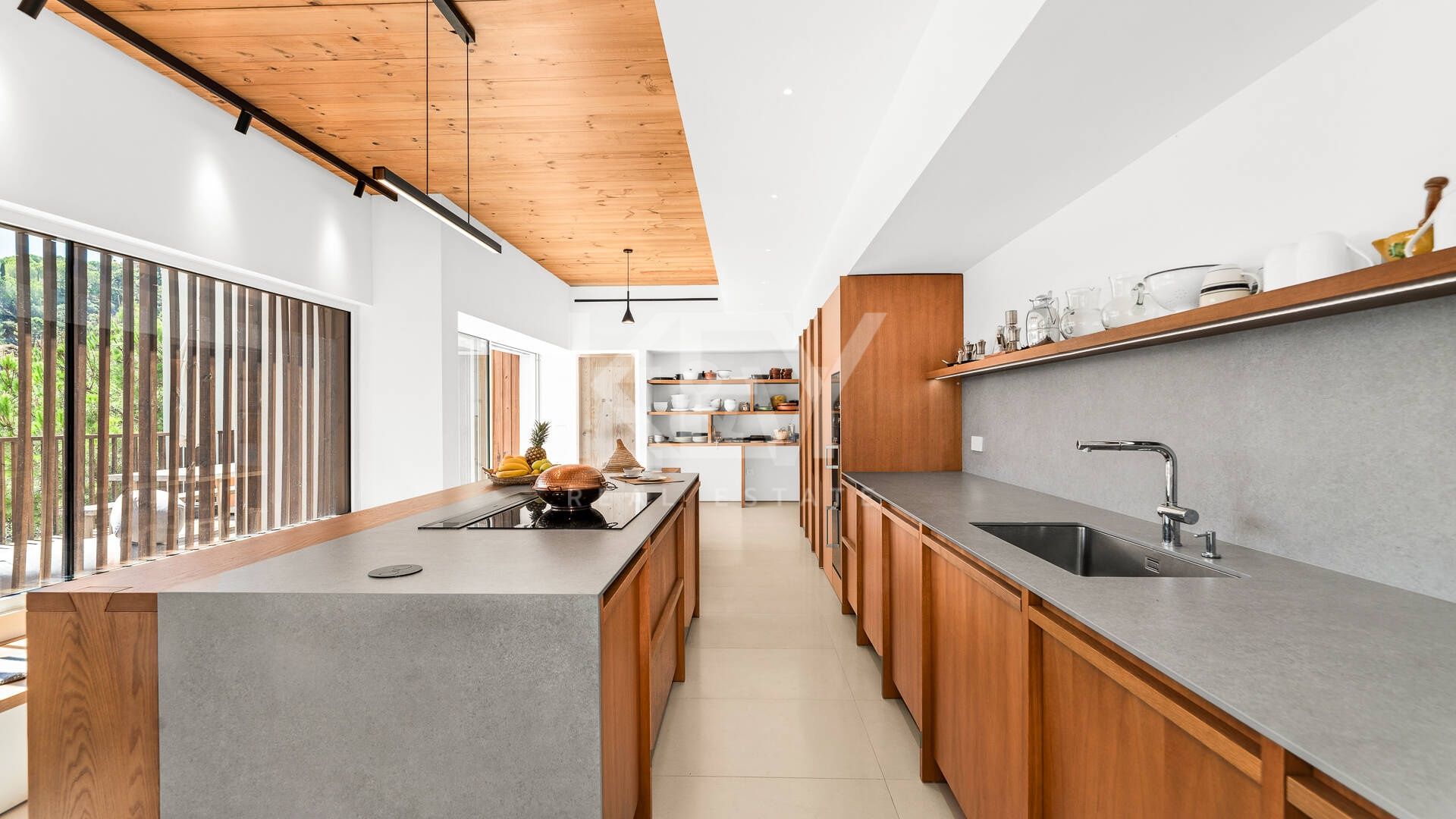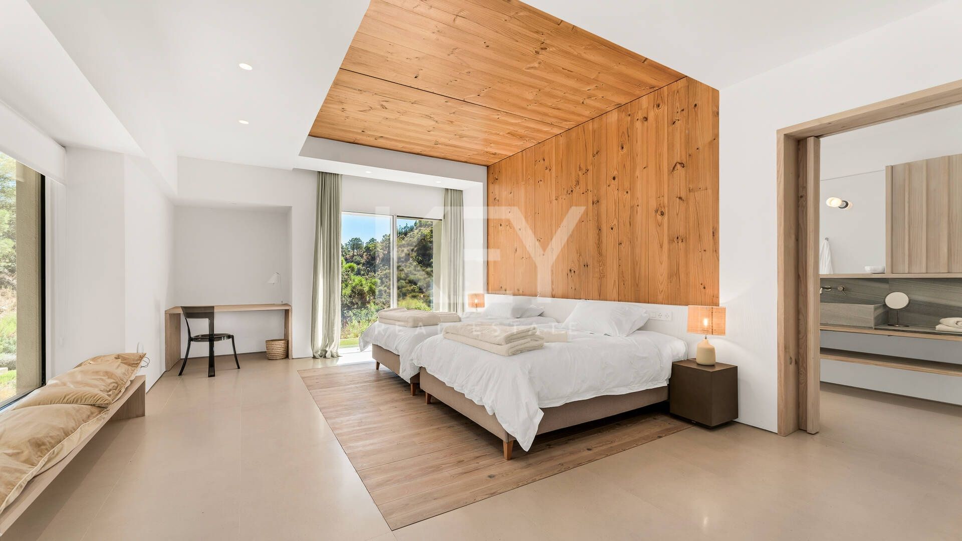 En el interior, los grandes ventanales de suelo a techo permiten la entrada de abundante luz natural y refuerzan la conexión entre los espacios interiores y las terrazas exteriores. El salón y el comedor, de concepto abierto, se complementan con una cocina moderna totalmente equipada, adecuada tanto para el día a día como para reuniones sociales. La villa dispone de cinco dormitorios, cada uno con su propio baño y acabados cuidadosamente seleccionados, ofreciendo privacidad y comodidad tanto a residentes como a invitados. La distribución ha sido diseñada para optimizar las vistas, la circulación y la funcionalidad en todas las plantas.