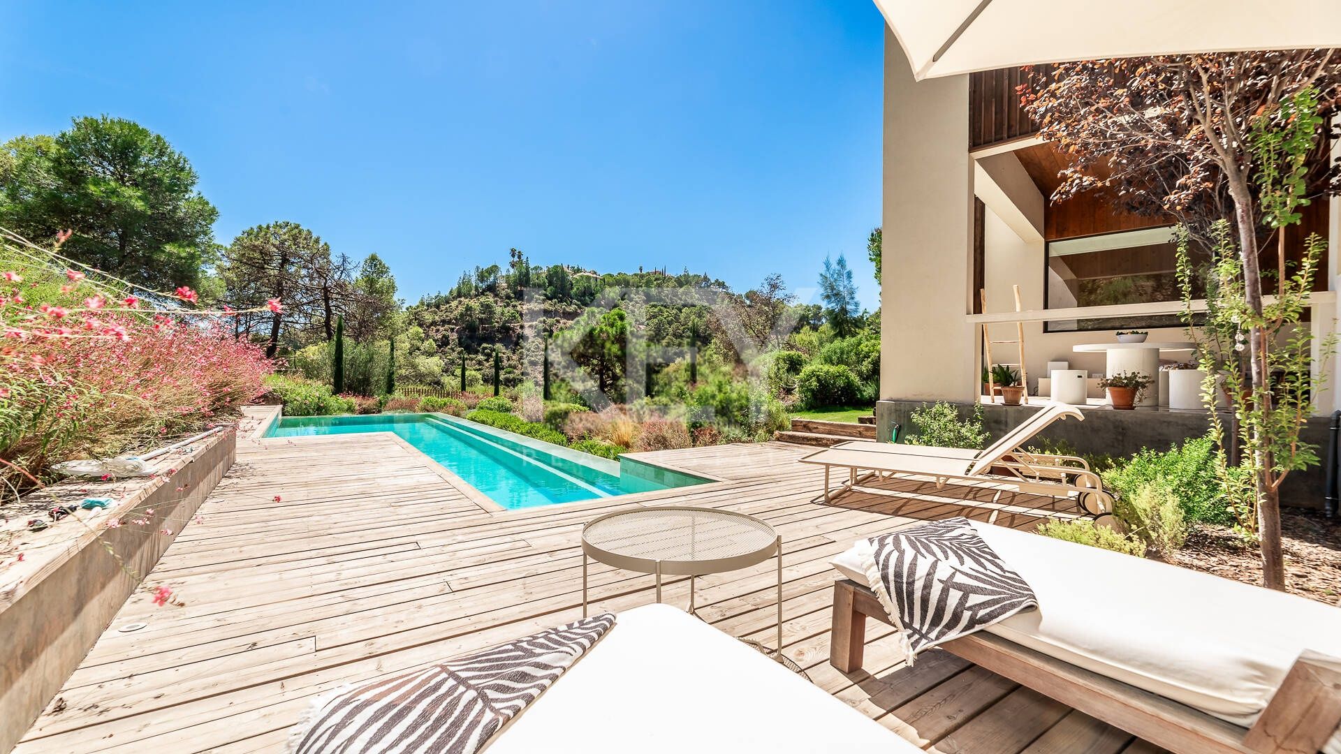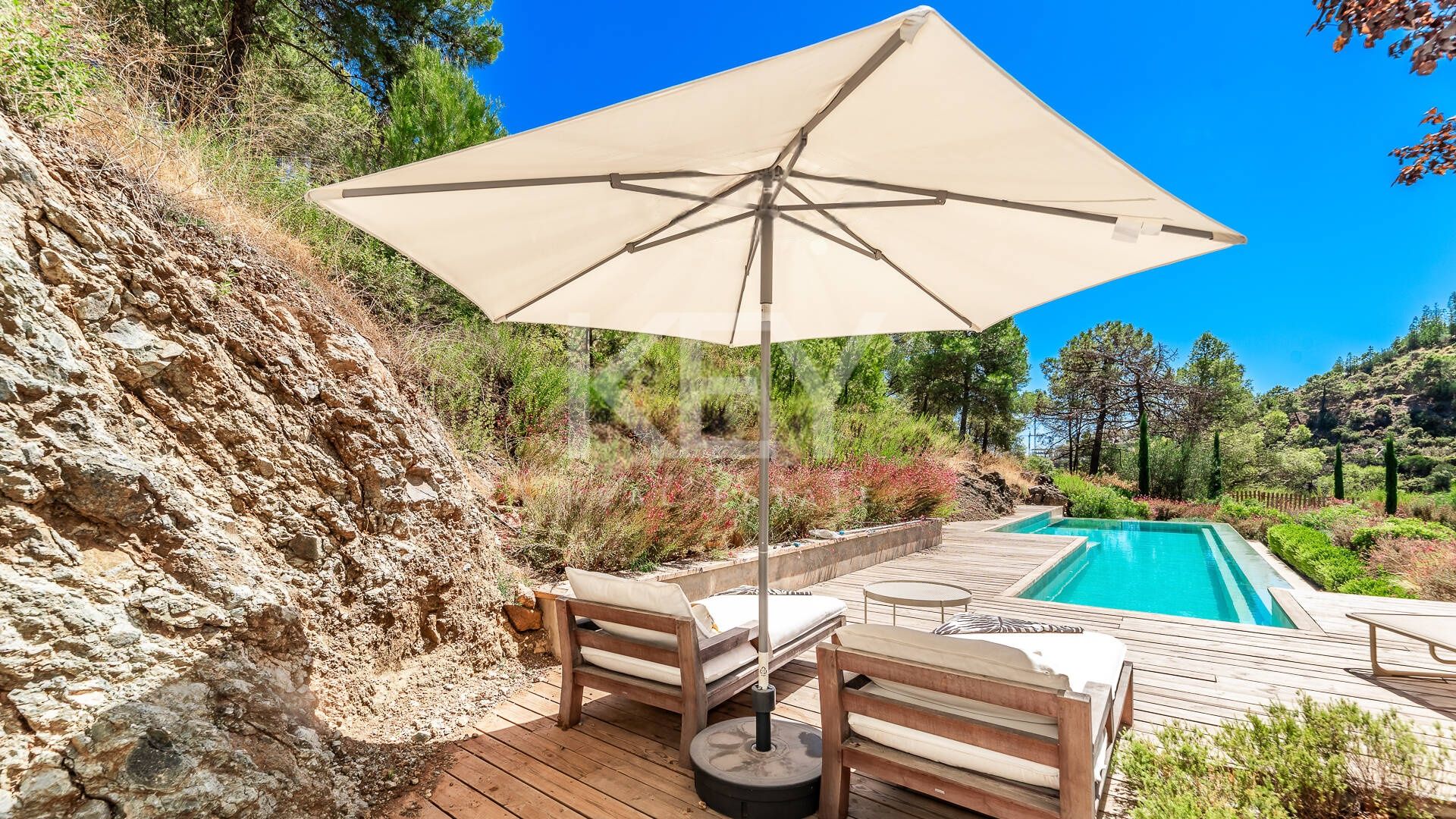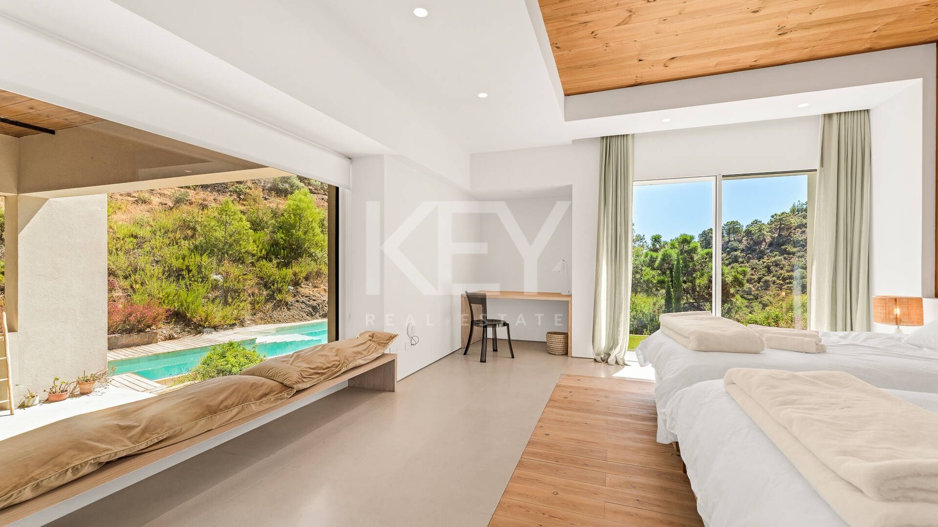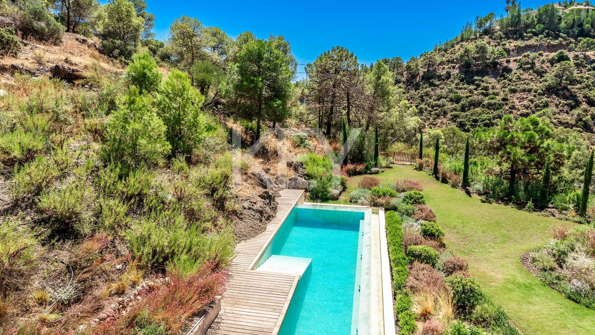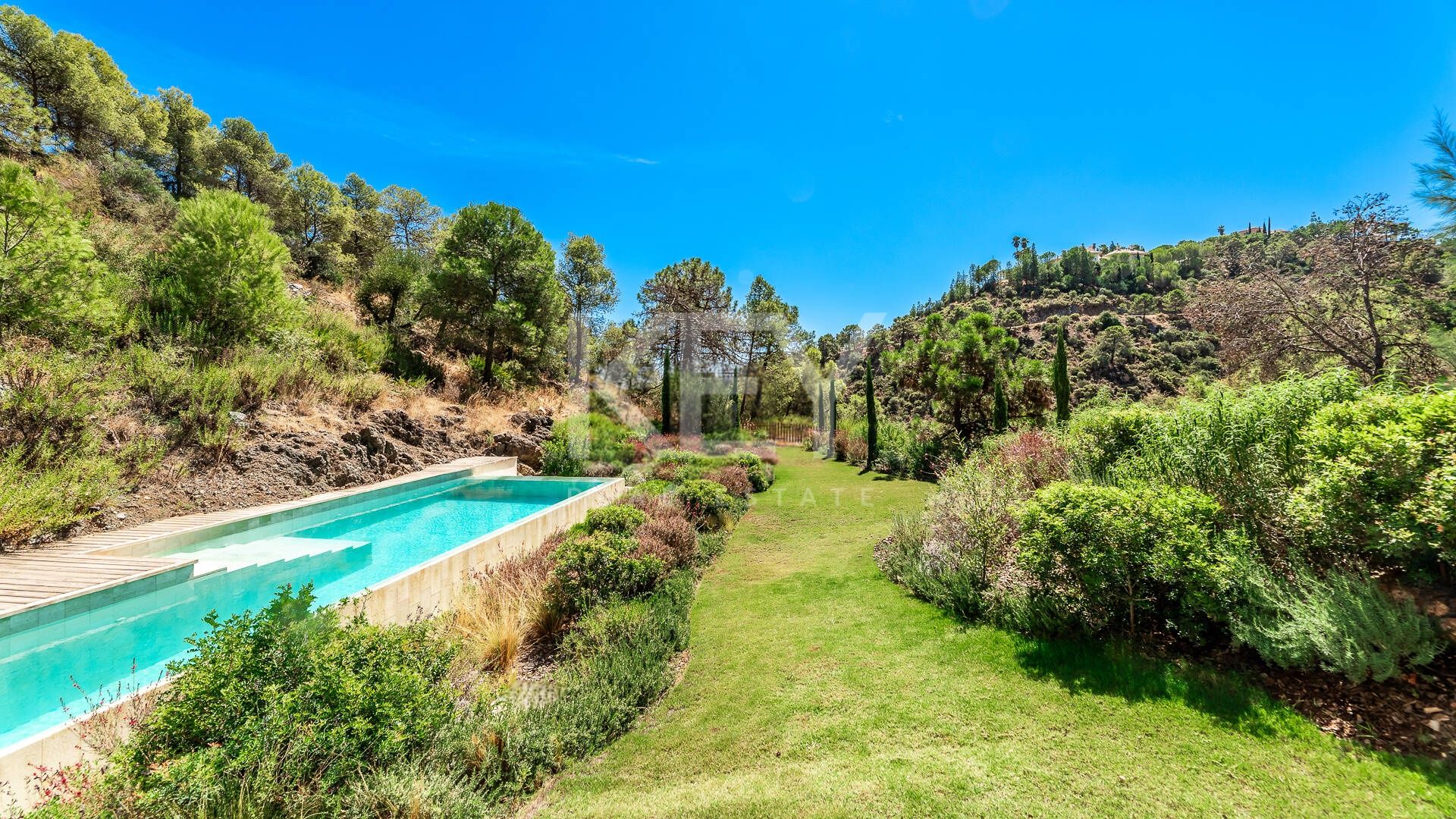 Ubicada en las colinas protegidas de El Madroñal, esta villa contemporánea en Benahavís está pensada para compradores que valoran la privacidad, la seguridad y una arquitectura moderna bien integrada en un entorno natural. Su posición elevada ofrece amplias vistas panorámicas a las colinas y valles verdes, manteniendo al mismo tiempo un acceso rápido a Marbella, Puerto Banús y la costa. Esta combinación de calma y cercanía a los principales puntos de interés convierte a El Madroñal en una de las zonas residenciales más demandadas para villas de alto nivel en Benahavís.