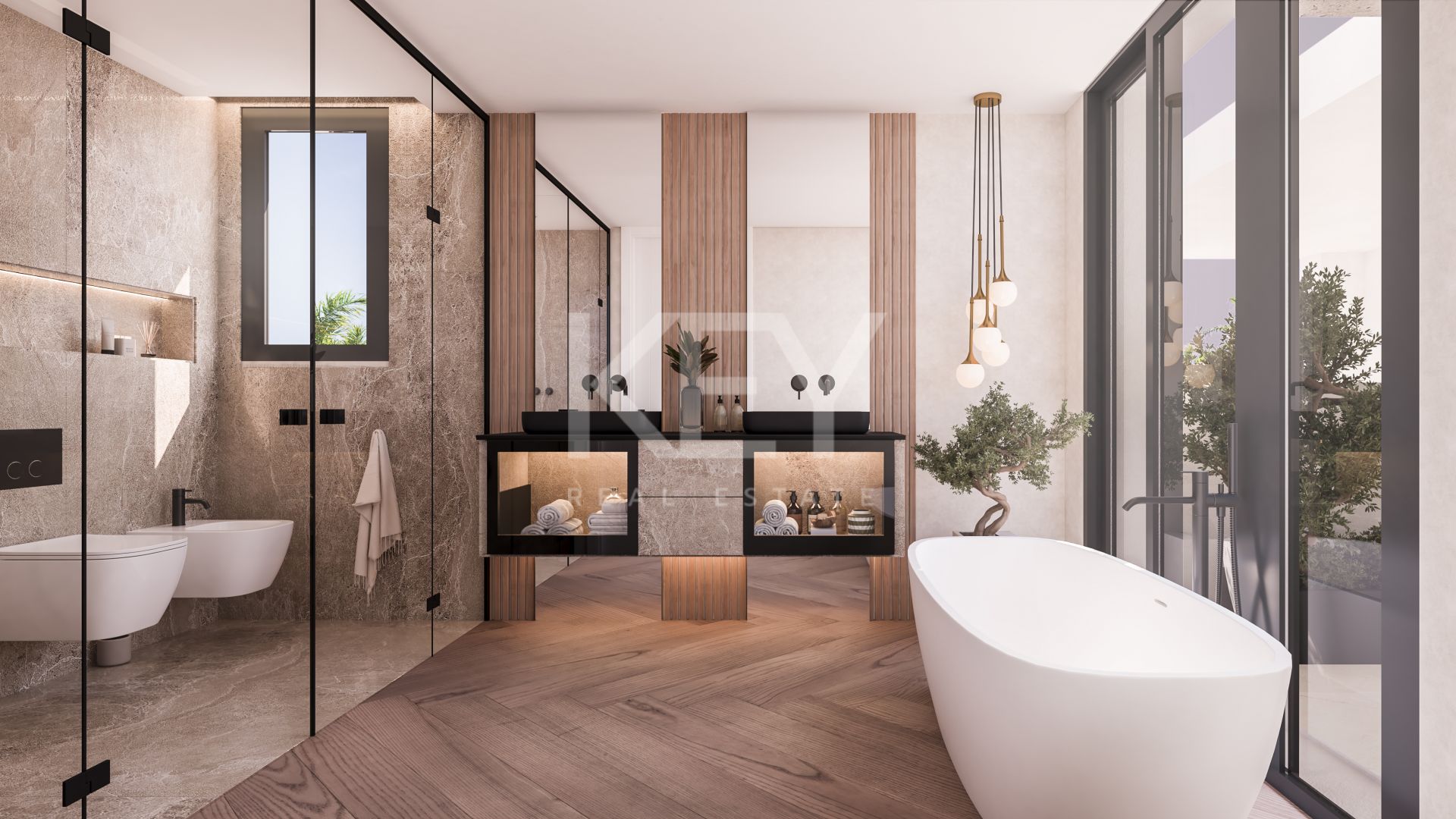 La planta baja cuenta con un luminoso vestíbulo de entrada que conduce a un espacio diáfano de salón, comedor y cocina. Los ventanales de suelo a techo de la marca Schüco inundan los interiores de luz natural y se abren completamente para conectar con la terraza y la piscina infinita privada de agua salada. La cocina de diseño, equipada con electrodomésticos Miele y grifería Gessi, incluye una isla central y amplias superficies de trabajo, lo que la hace ideal para el entretenimiento y la vida familiar. Una suite de invitados con vestidor y baño en suite completa este nivel.