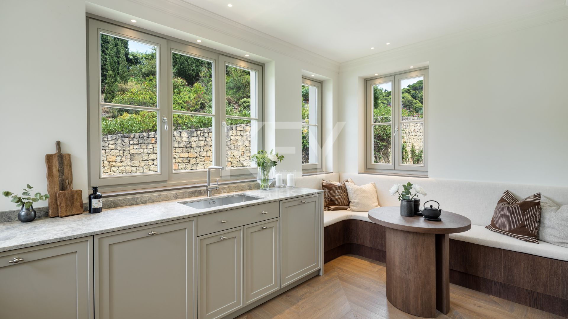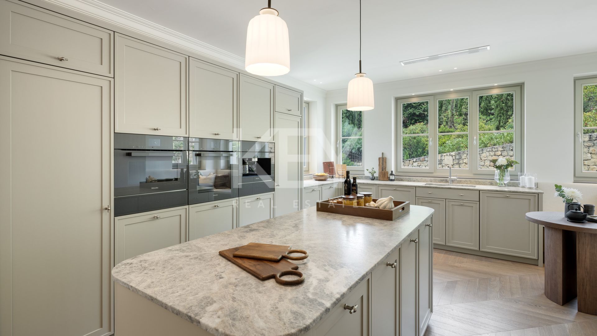 La casa le da la bienvenida con una sala de estar de doble altura, ventanas expansivas de Roman Clavero, y conexiones perfectas entre espacios interiores y exteriores. Destacan una cocina miele-equipada con rincón de desayuno, comedor al aire libre con cocina de verano, jardines ajardinados y piscina de agua salada.