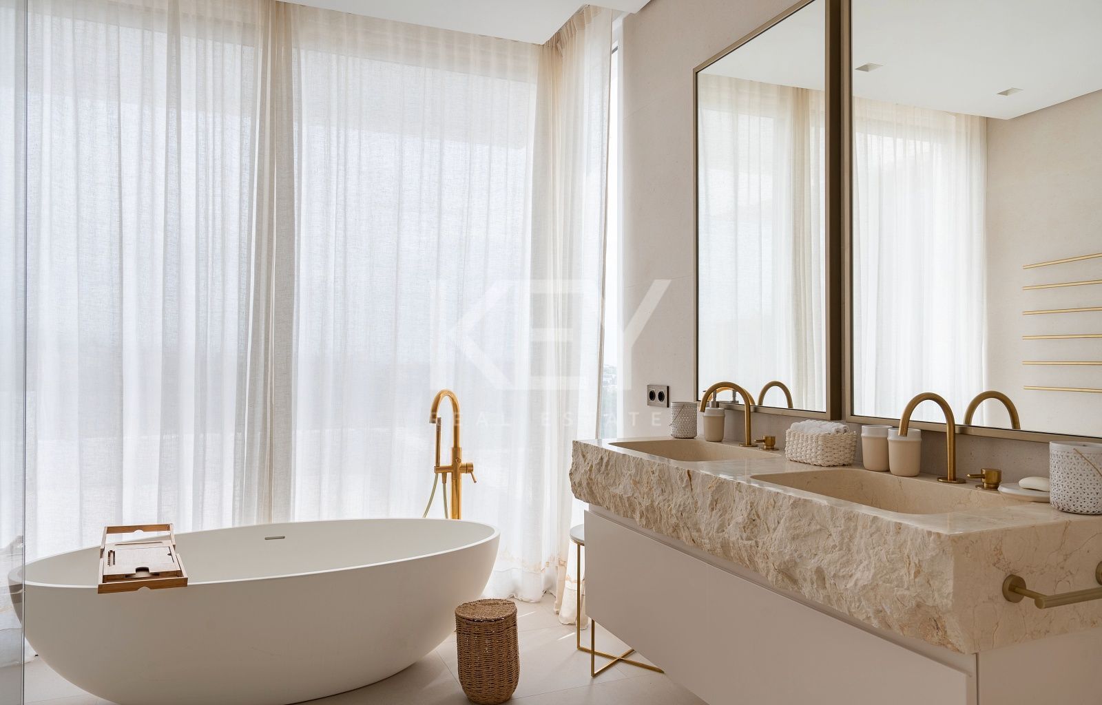 La primera planta está pensada para ofrecer privacidad y confort. Cuenta con dos dormitorios, incluido el principal, diseñado con detalles que aportan calidez y bienestar. El dormitorio principal dispone de dos vestidores y un baño con ducha amplia y bañera independiente. Ambos dormitorios tienen acceso a una terraza privada con vistas al mar, al campo de golf, a La Concha y al entorno que rodea la propiedad, ofreciendo uno de los miradores más atractivos de la vivienda.