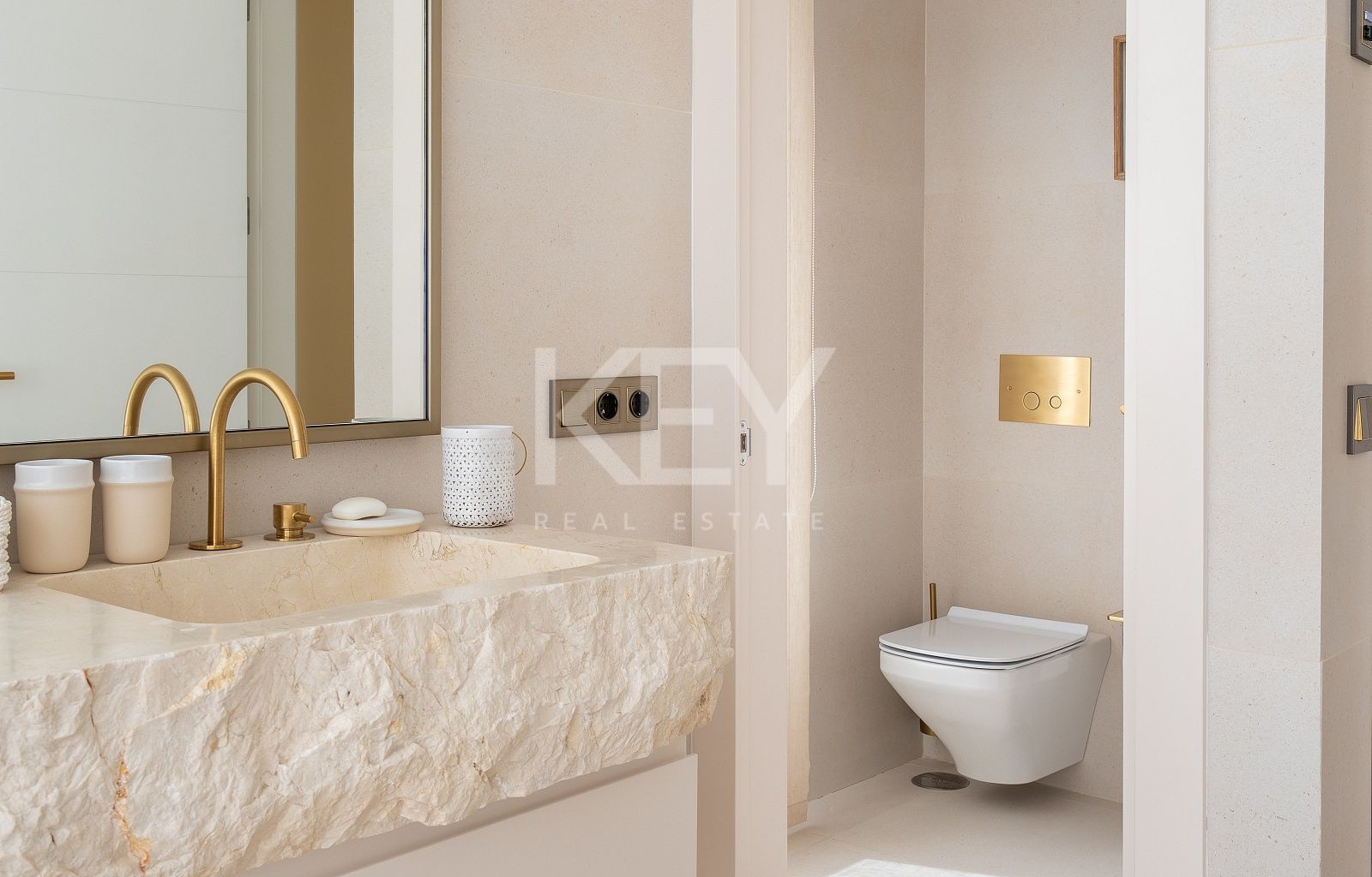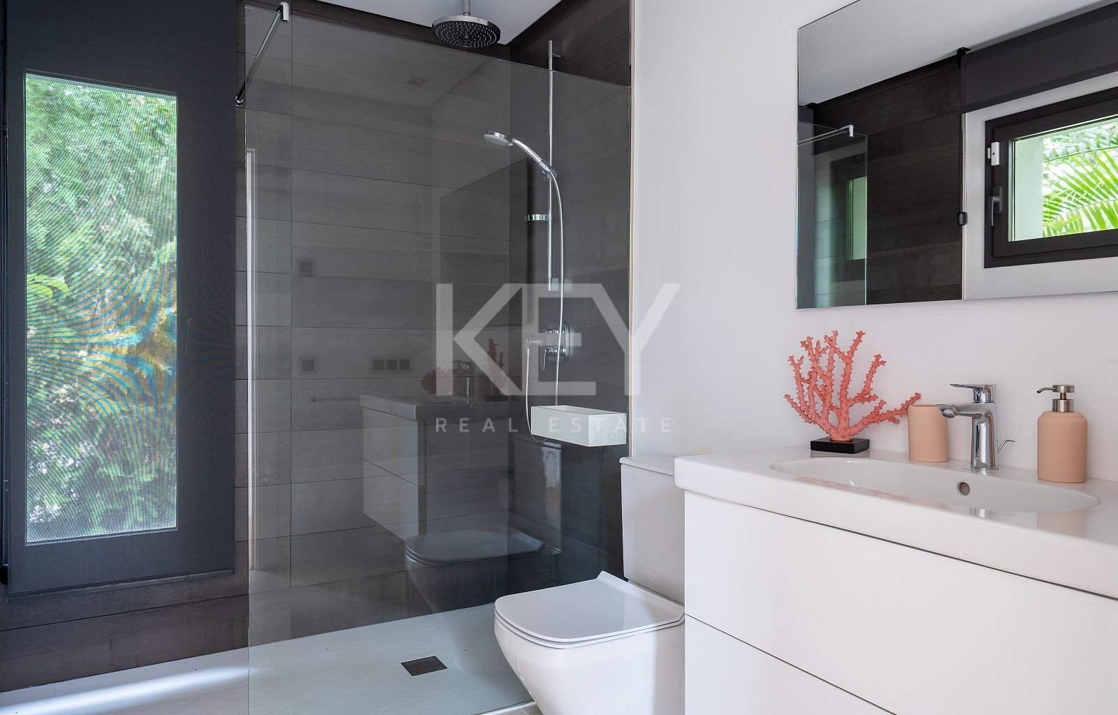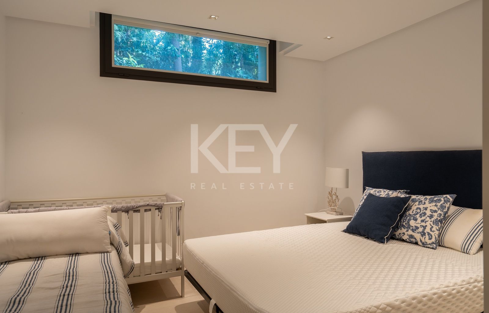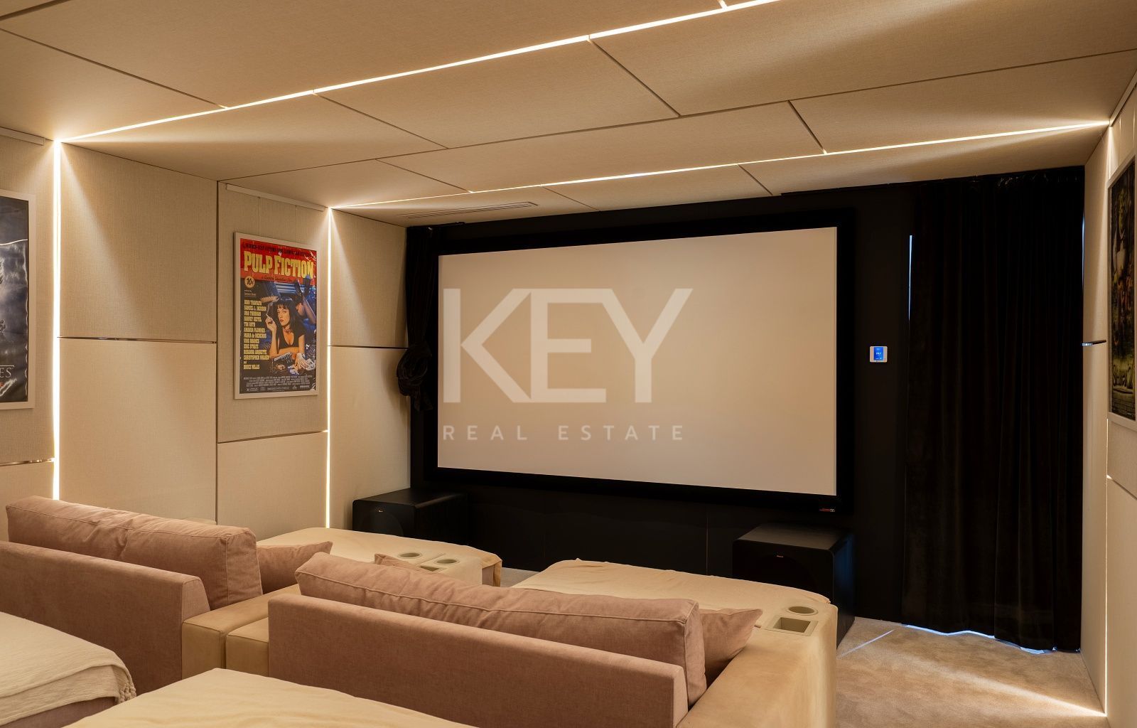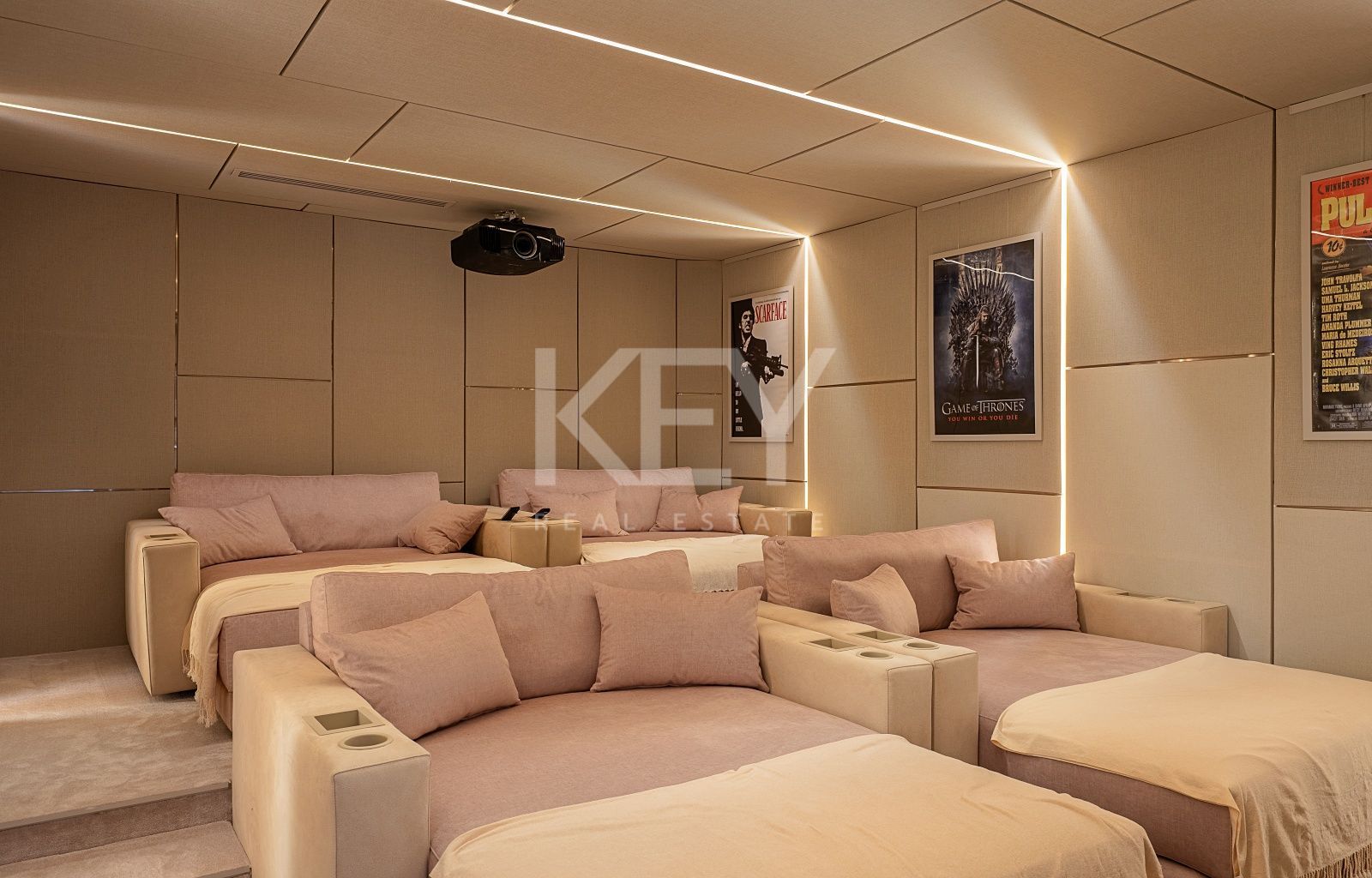 En la planta inferior, la villa continúa sorprendiendo con una distribución generosa. Un cuarto dormitorio con baño se complementa con varias zonas de ocio, creando un nivel perfecto para el entretenimiento. Incluye una sala de juegos, una bodega con un diseño muy atractivo, un cine privado y un gimnasio totalmente equipado. Ya sea para disfrutar en familia, recibir visitas o cuidar del bienestar personal, este nivel añade un valor importante al estilo de vida que propone la vivienda. Un ascensor privado conecta las tres plantas para mayor comodidad.