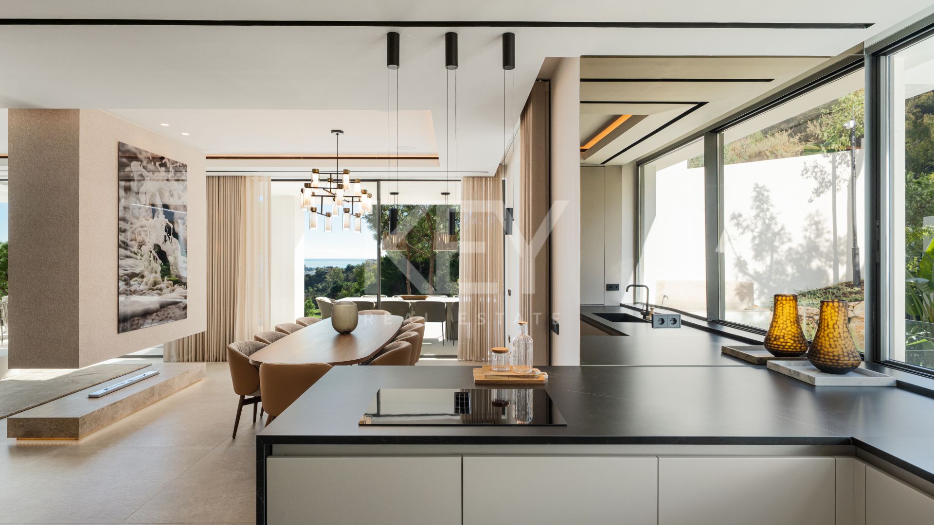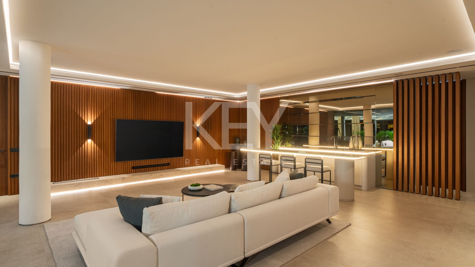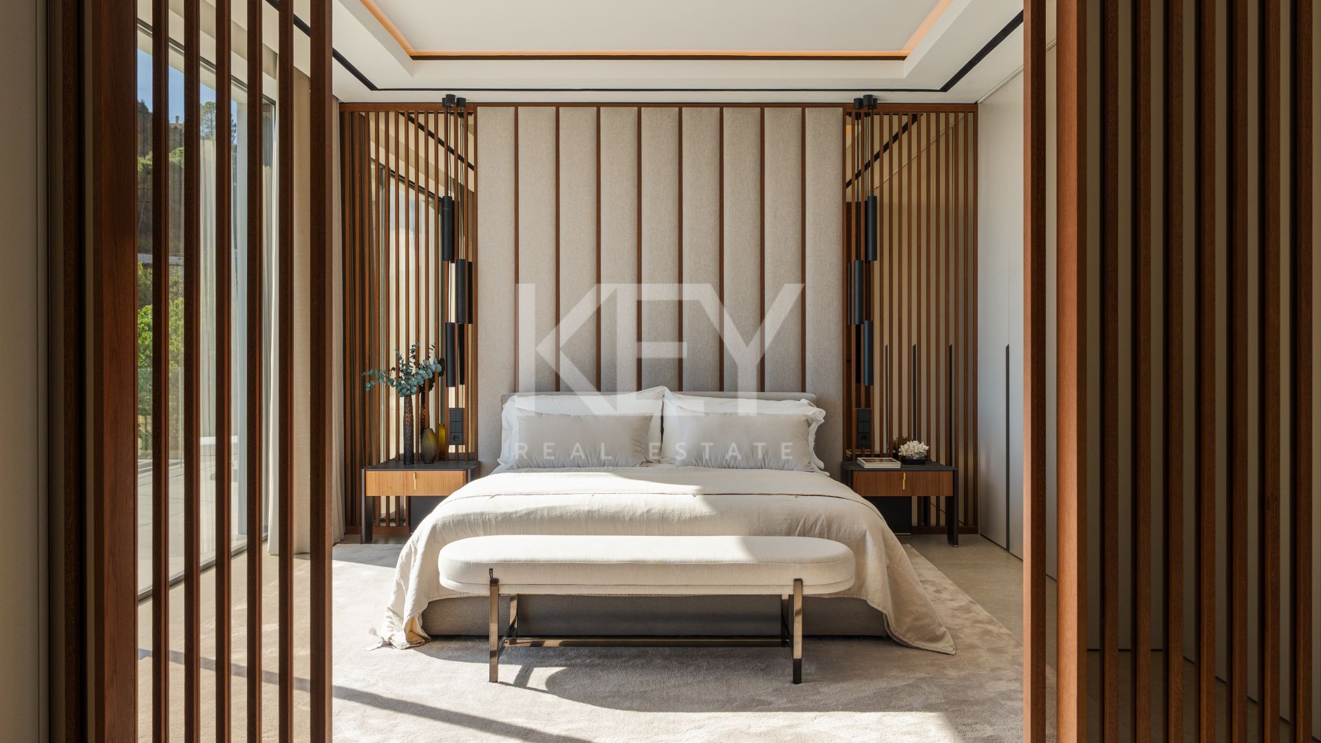 En el interior, la villa ha sido diseñada por Aalto Exclusive Design, reconocido por crear ambientes modernos y acogedores con materiales de alta calidad y tonos naturales. La zona principal de estar cuenta con grandes paneles correderos que se abren por completo hacia la terraza, permitiendo que la luz natural y la brisa definan el ambiente a lo largo del día. Cada detalle se ha estudiado cuidadosamente: desde la iluminación que realza cada espacio hasta las texturas seleccionadas y los elementos a medida que aportan carácter propio a la vivienda.