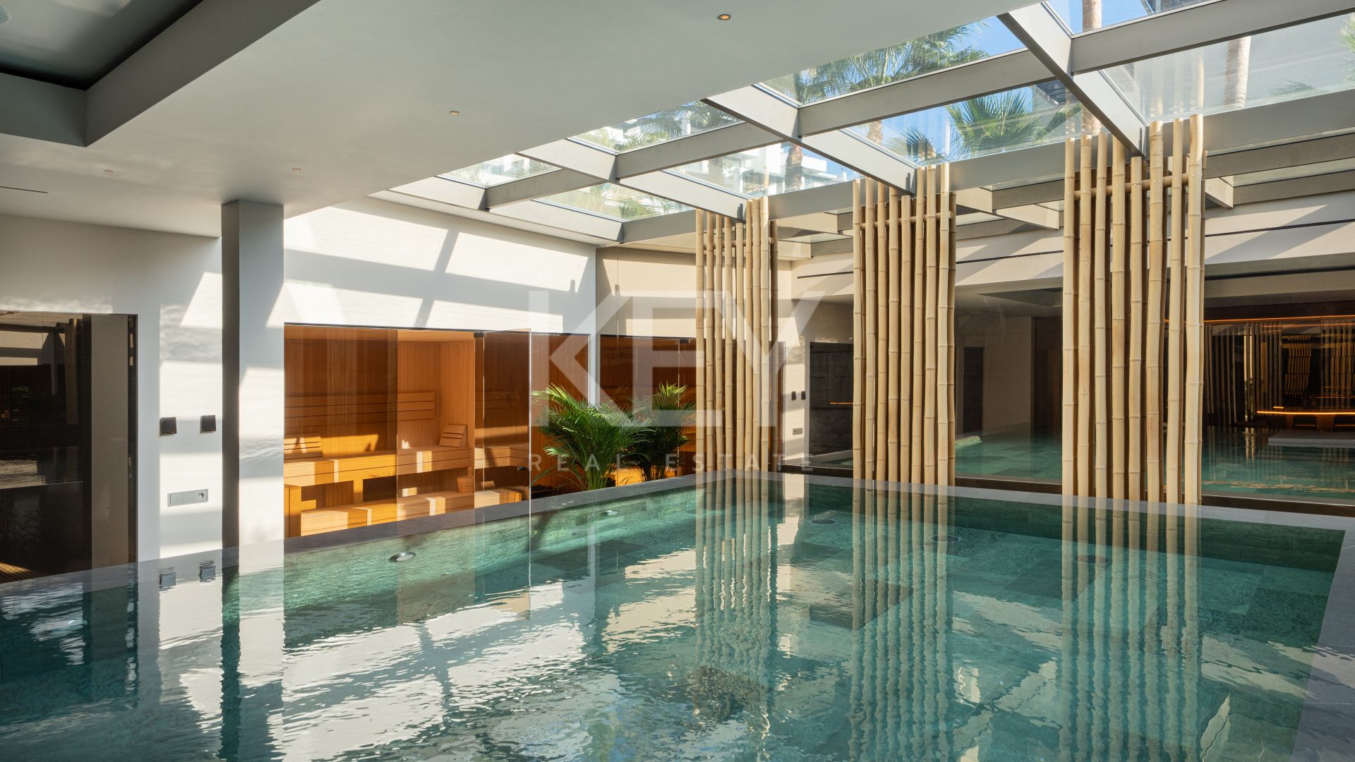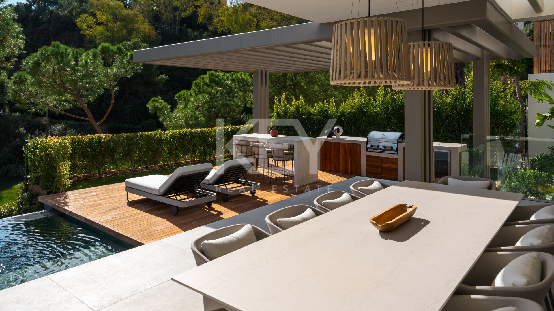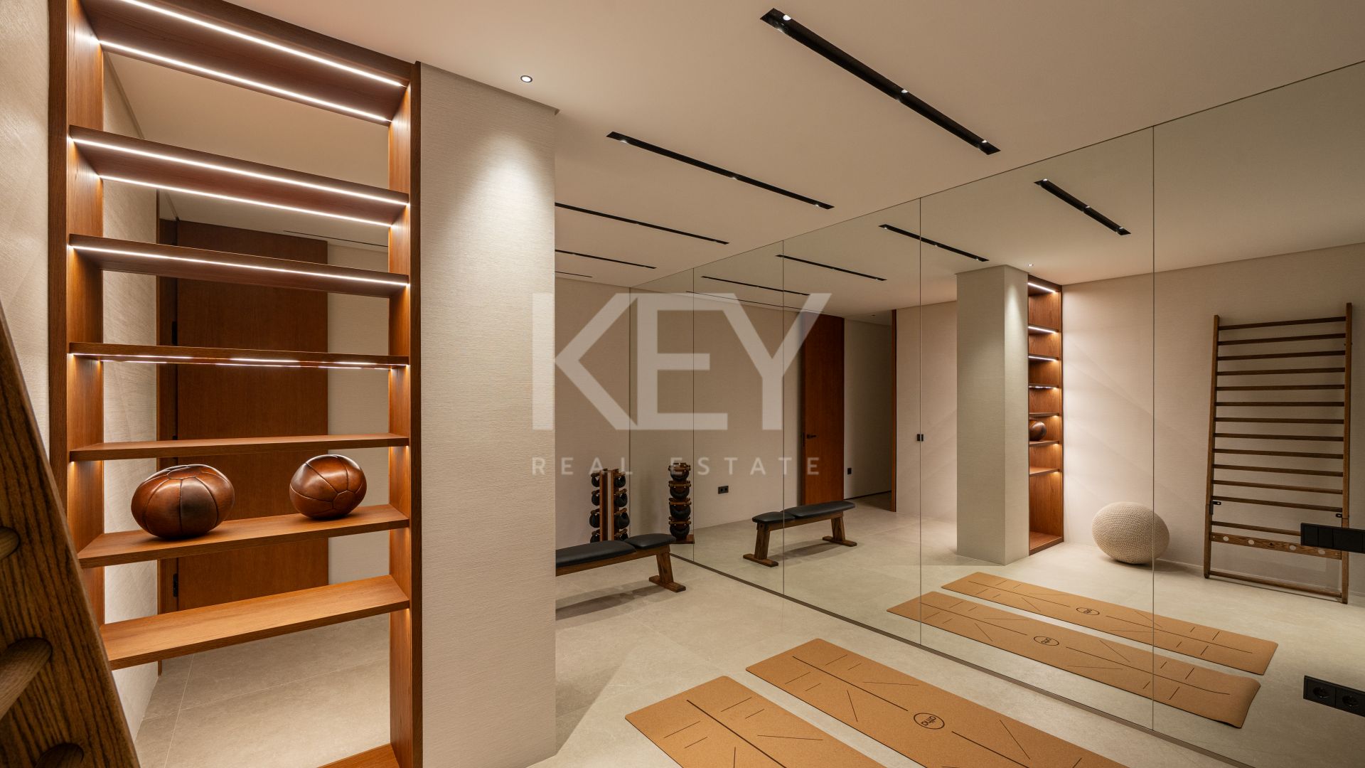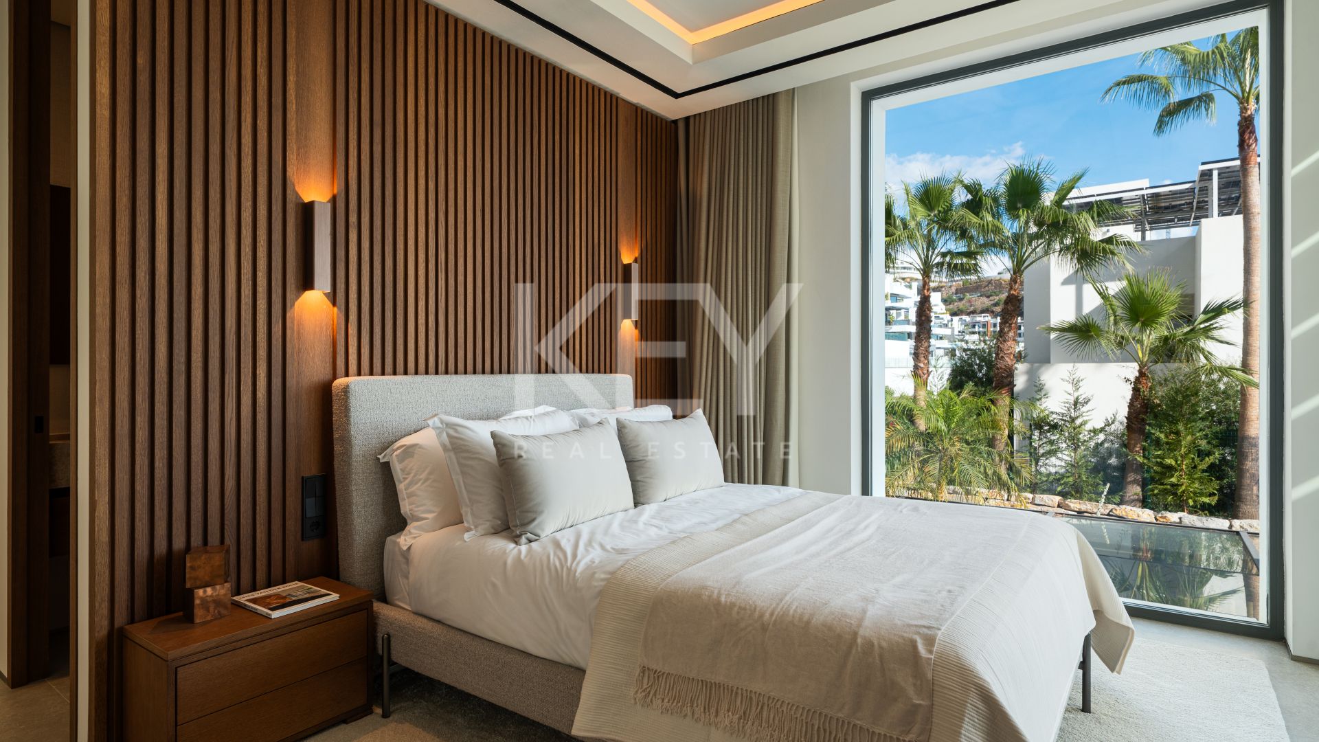 En el interior, la villa ha sido diseñada por Aalto Exclusive Design, reconocido por crear ambientes modernos y acogedores con materiales de alta calidad y tonos naturales. La zona principal de estar cuenta con grandes paneles correderos que se abren por completo hacia la terraza, permitiendo que la luz natural y la brisa definan el ambiente a lo largo del día. Cada detalle se ha estudiado cuidadosamente: desde la iluminación que realza cada espacio hasta las texturas seleccionadas y los elementos a medida que aportan carácter propio a la vivienda.
