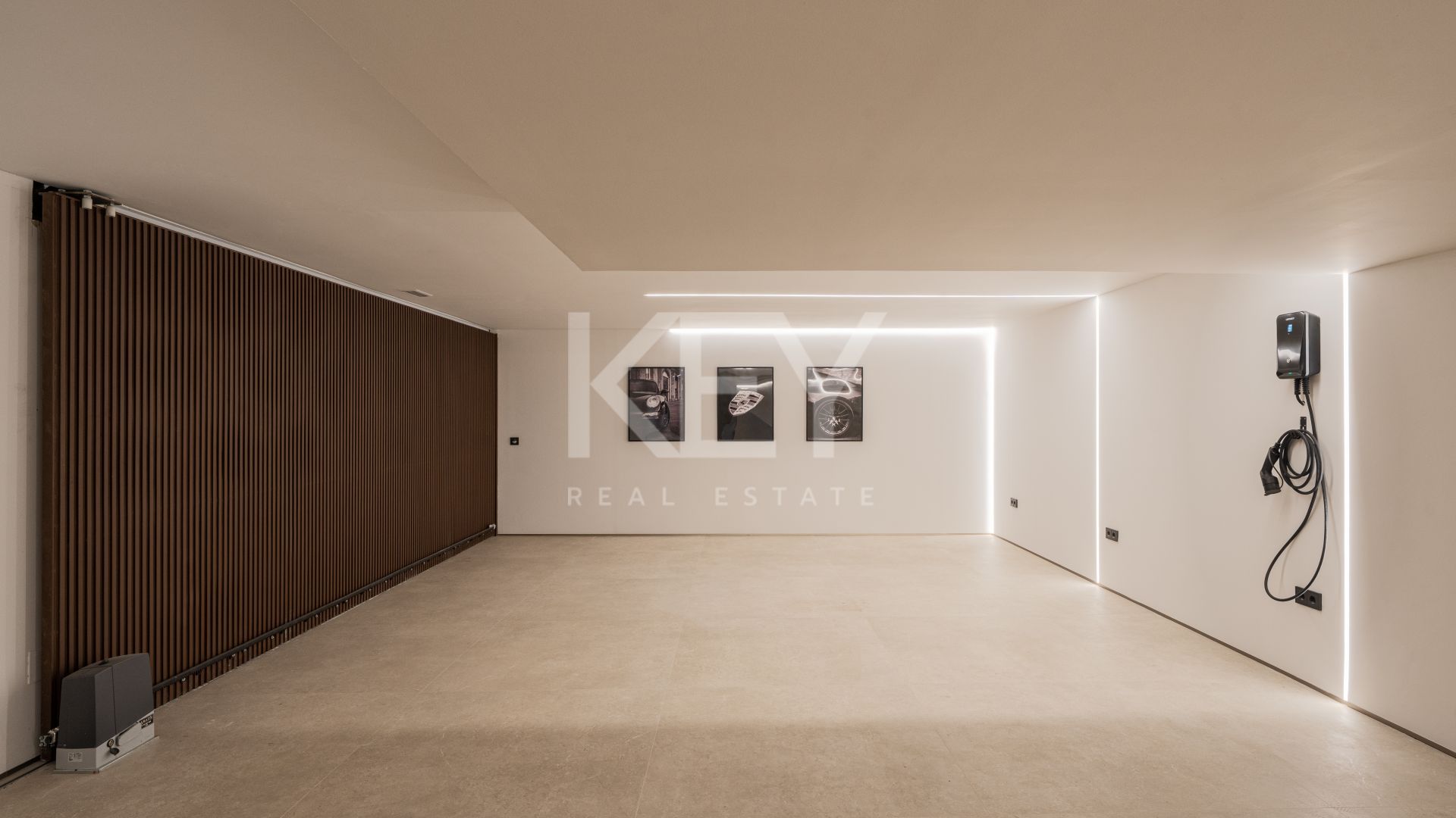 La planta inferior está destinada por completo al ocio y al bienestar. Incluye una sala de entretenimiento con barra, un spa con piscina interior y sauna, además de un gimnasio privado. La vivienda también dispone de un garaje seguro equipado con punto de carga para vehículos eléctricos.