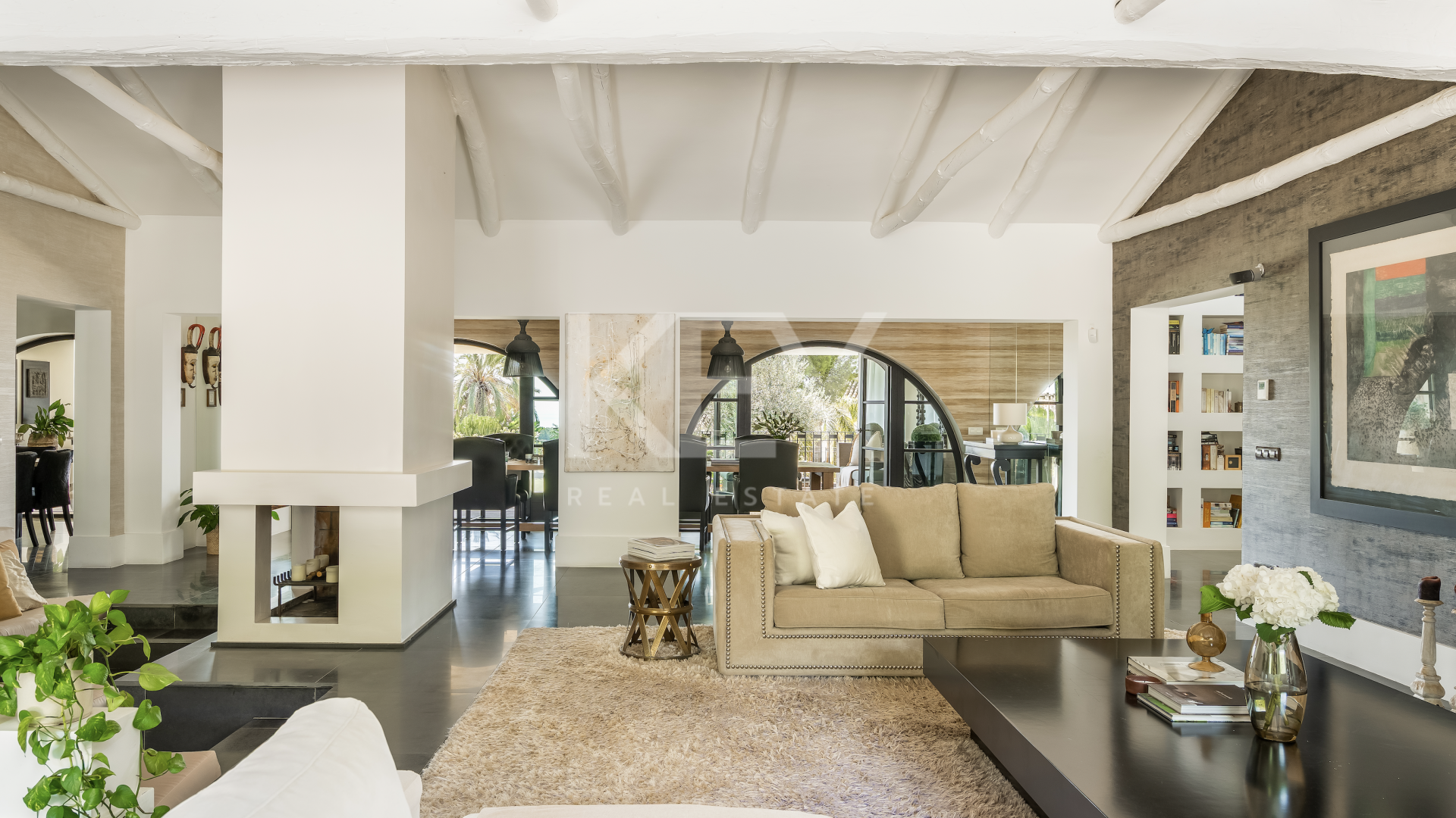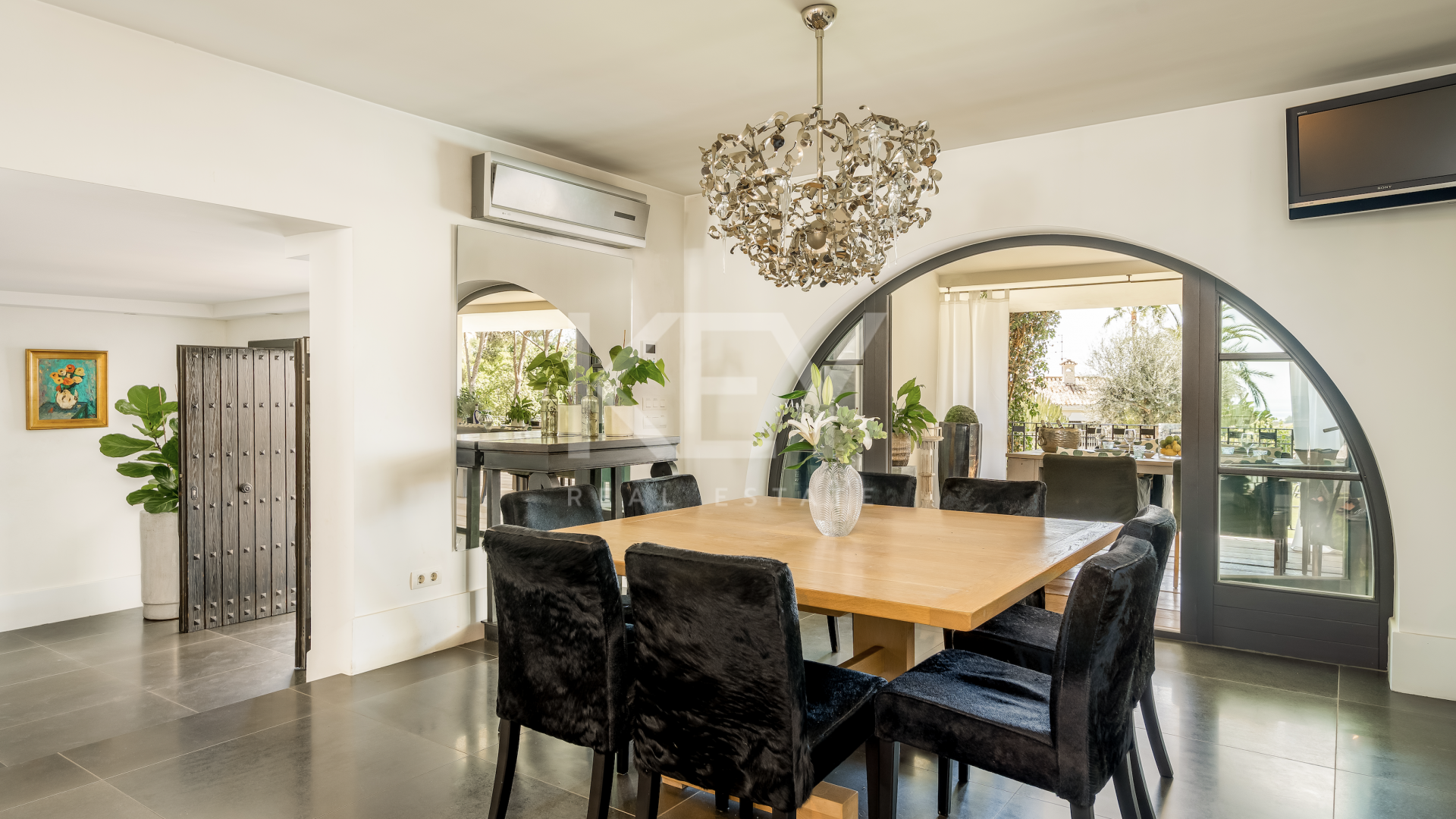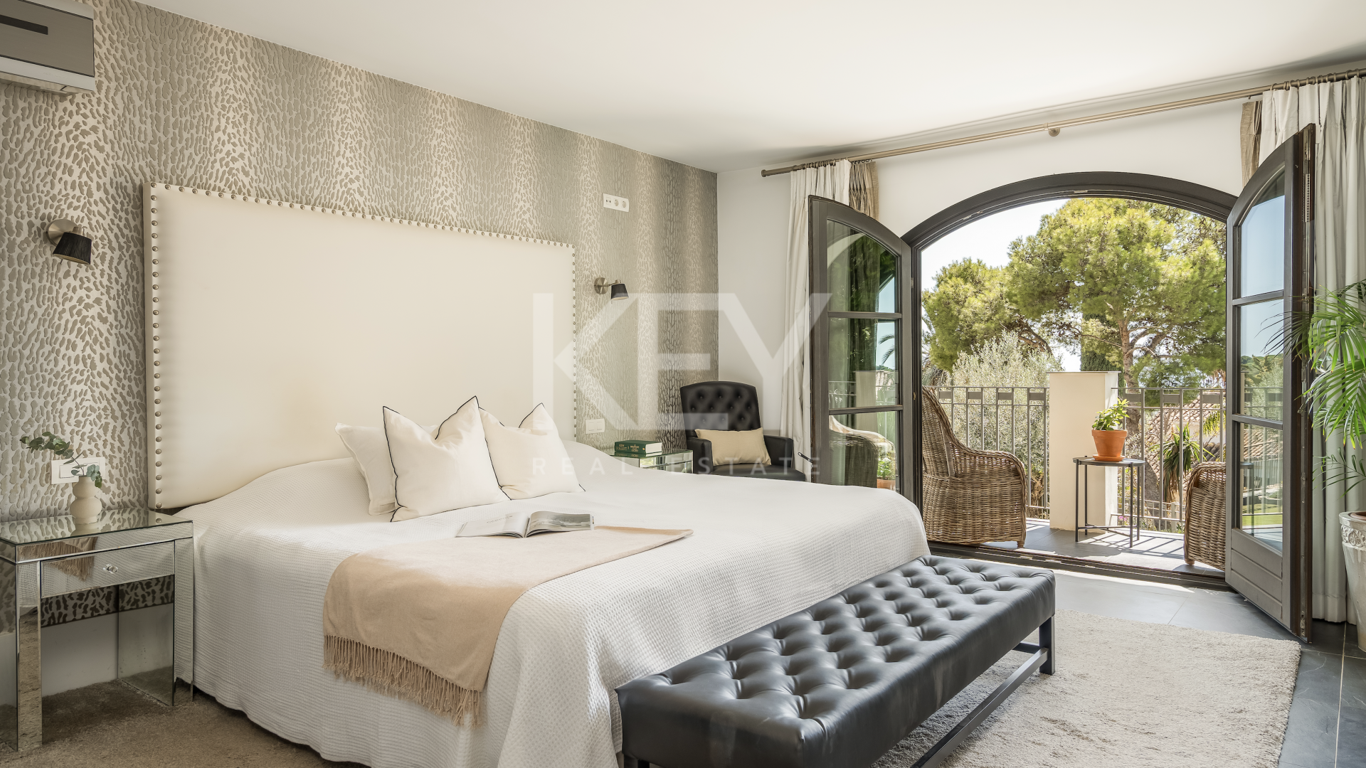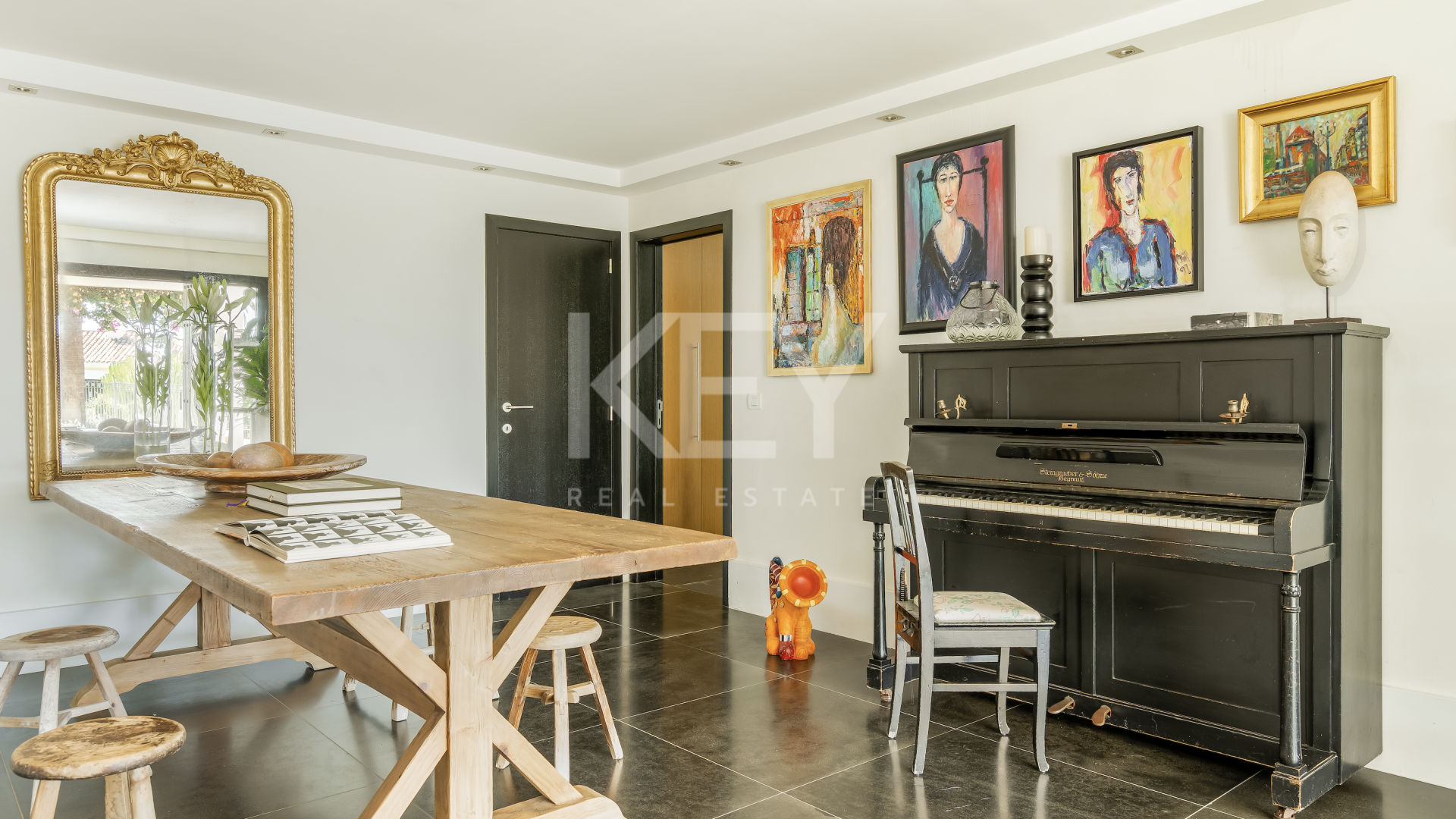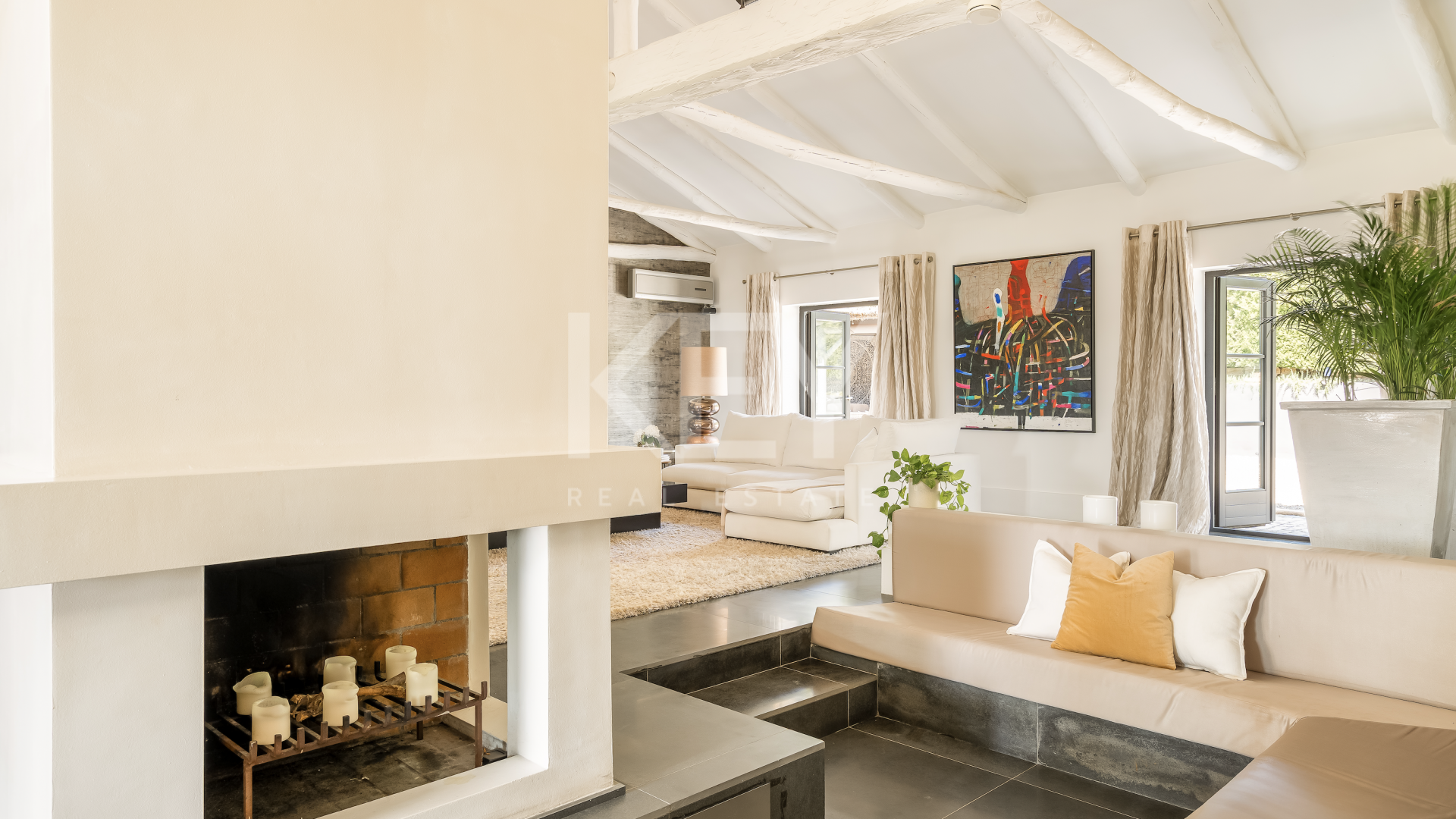 Renovada en 2006, la villa ha sido cuidadosamente mantenida y mejorada para ofrecer un estilo de vida cómodo y funcional, respetando su carácter original. La planta principal cuenta con una amplia cocina de concepto abierto con dos islas centrales, zona de lavadero independiente y acceso directo a las terrazas y al jardín. Los espacios de salón y comedor son amplios y luminosos, realzados por dos chimeneas, una de ellas de doble cara que aporta carácter y calidez. Las carpinterías de alta calidad de Roman Clavero conectan el interior con la terraza principal, creando una transición fluida entre los espacios interiores y exteriores. Los techos altos abuhardillados con vigas de madera aportan una sensación acogedora y una presencia arquitectónica muy atractiva.