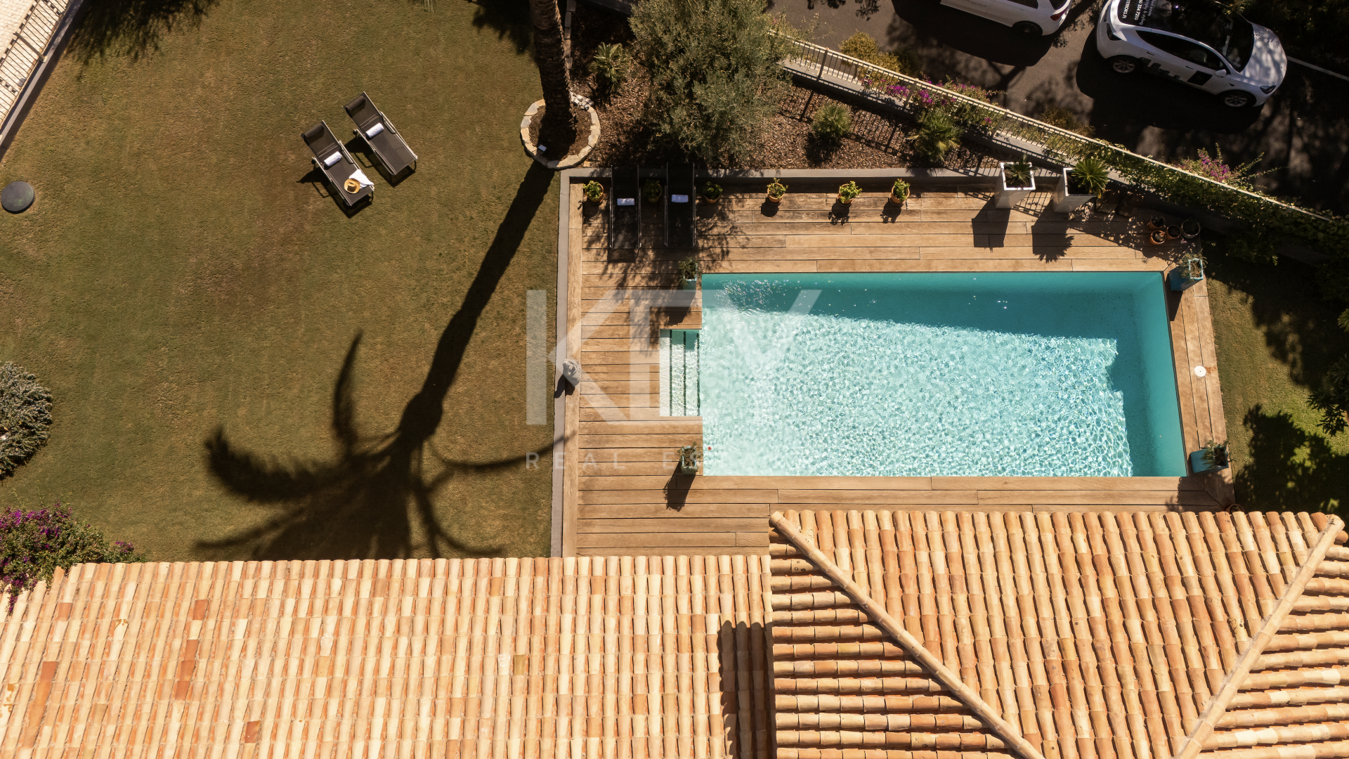 La villa se asienta sobre una parcela de 1.600 m² con jardines maduros, árboles frutales, varias terrazas y zonas de estar cubiertas, pensadas para disfrutar del sol y la sombra a lo largo del día. Una piscina de buen tamaño completa el exterior, creando un entorno ideal para disfrutar del estilo de vida mediterráneo.