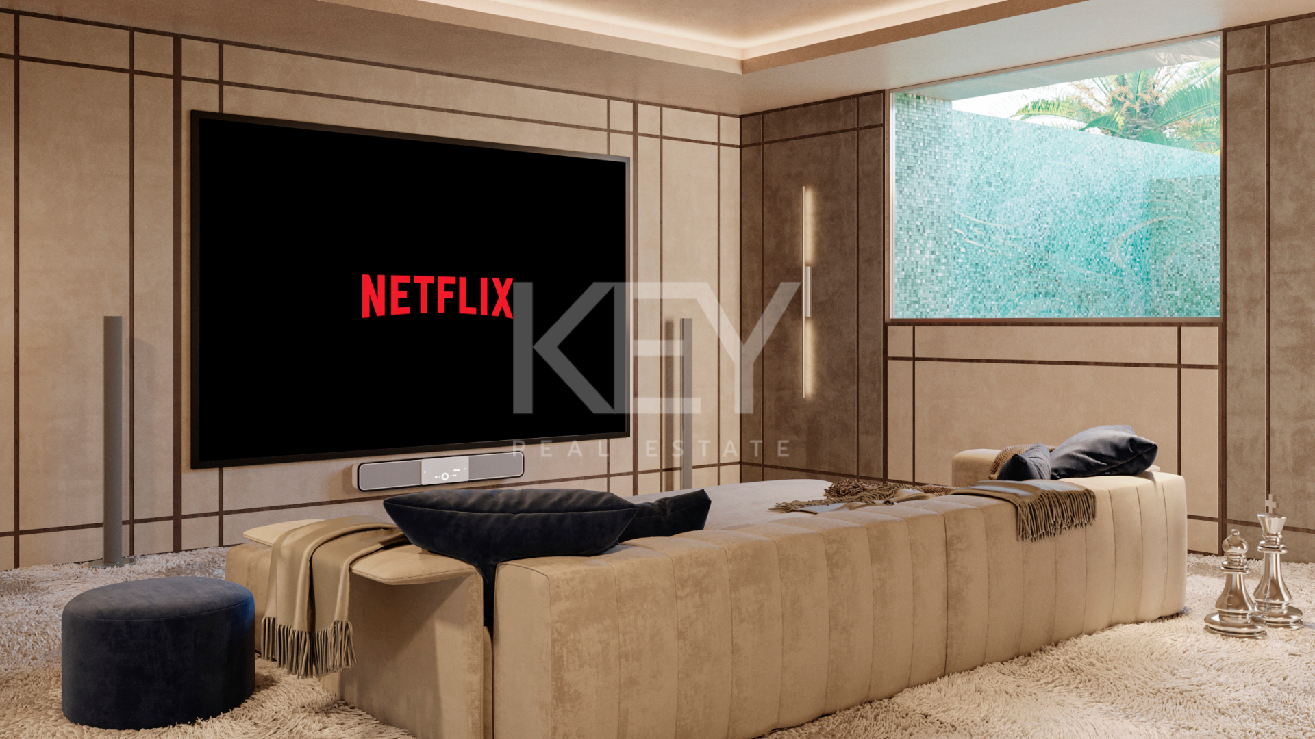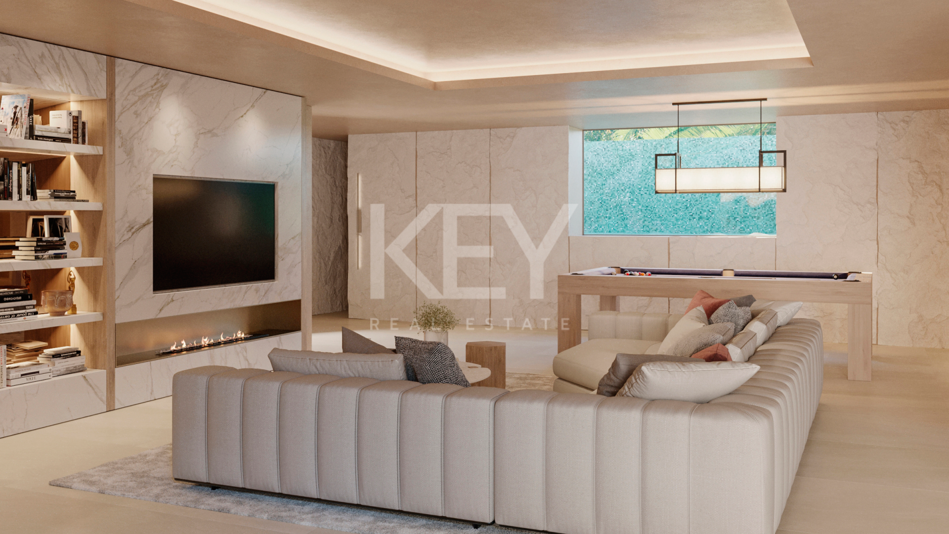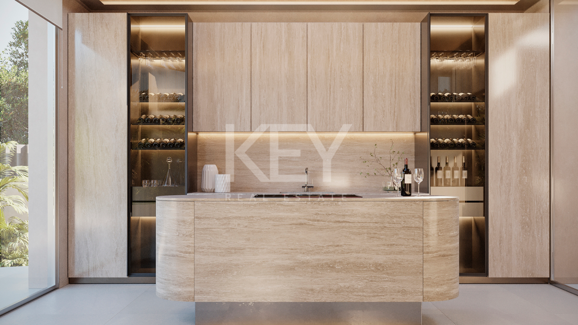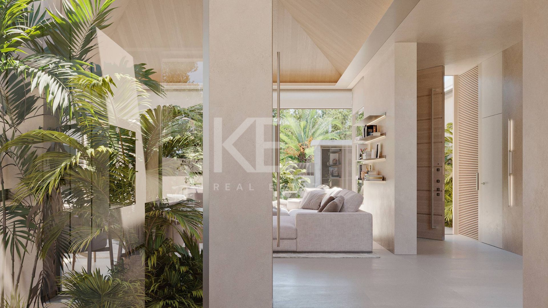 La villa ha sido cuidadosamente diseñada para priorizar la luz natural, la amplitud y la comodidad en el día a día. Grandes ventanales de suelo a techo y puertas correderas conectan el interior con las terrazas y el jardín, creando una transición fluida entre los espacios interiores y exteriores. La zona de estar de concepto abierto integra salón, comedor y cocina en un entorno equilibrado, adecuado tanto para la vida diaria como para recibir invitados. Los materiales de alta calidad, las líneas limpias y los acabados neutros definen el interior y permiten que la arquitectura sea la verdadera protagonista.