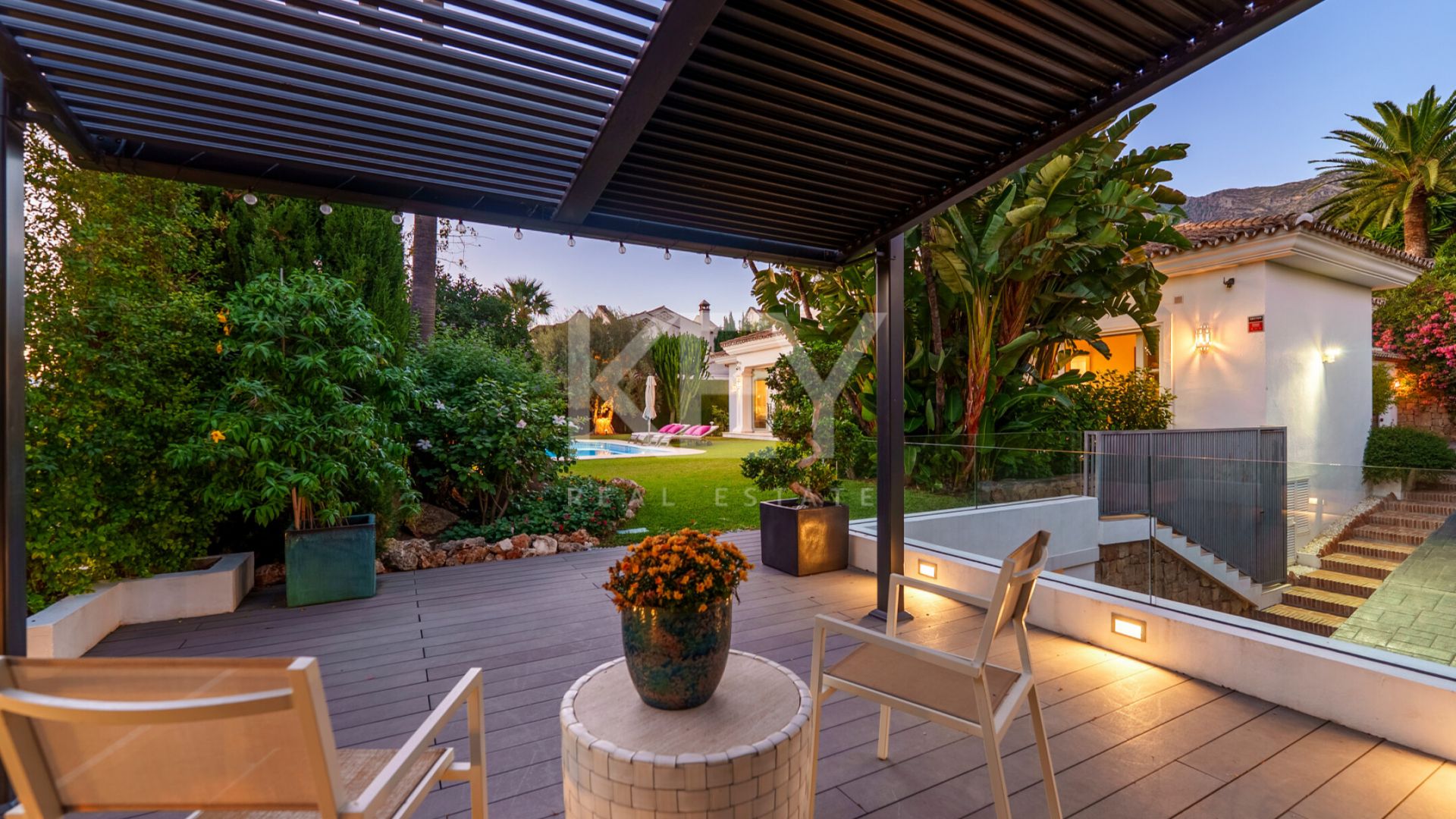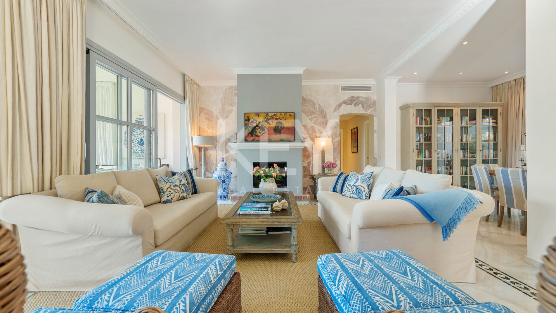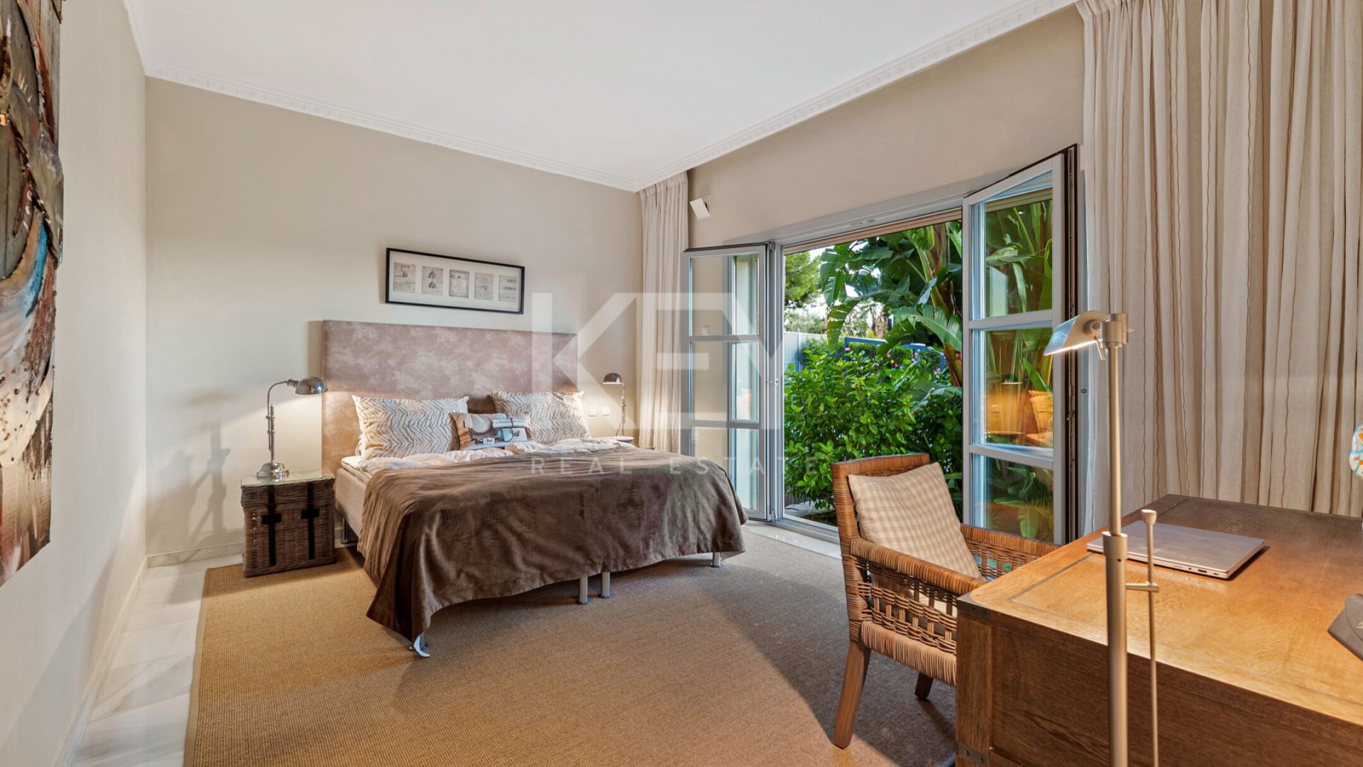 Los espacios interiores destacan por su luminosidad y sensación acogedora, con una conexión natural entre el salón, el comedor y las terrazas exteriores. Los grandes ventanales permiten la entrada de luz durante todo el día, generando un ambiente cálido y relajado. El diseño de concepto abierto conecta directamente con una terraza cubierta que da paso a un jardín cuidado y a la piscina privada. La cocina está completamente equipada con electrodomésticos actuales, combinando funcionalidad con un estilo clásico. Además, cuenta con una zona de desayuno con acceso directo al exterior, lo que la convierte en un espacio práctico y cómodo para el uso diario.