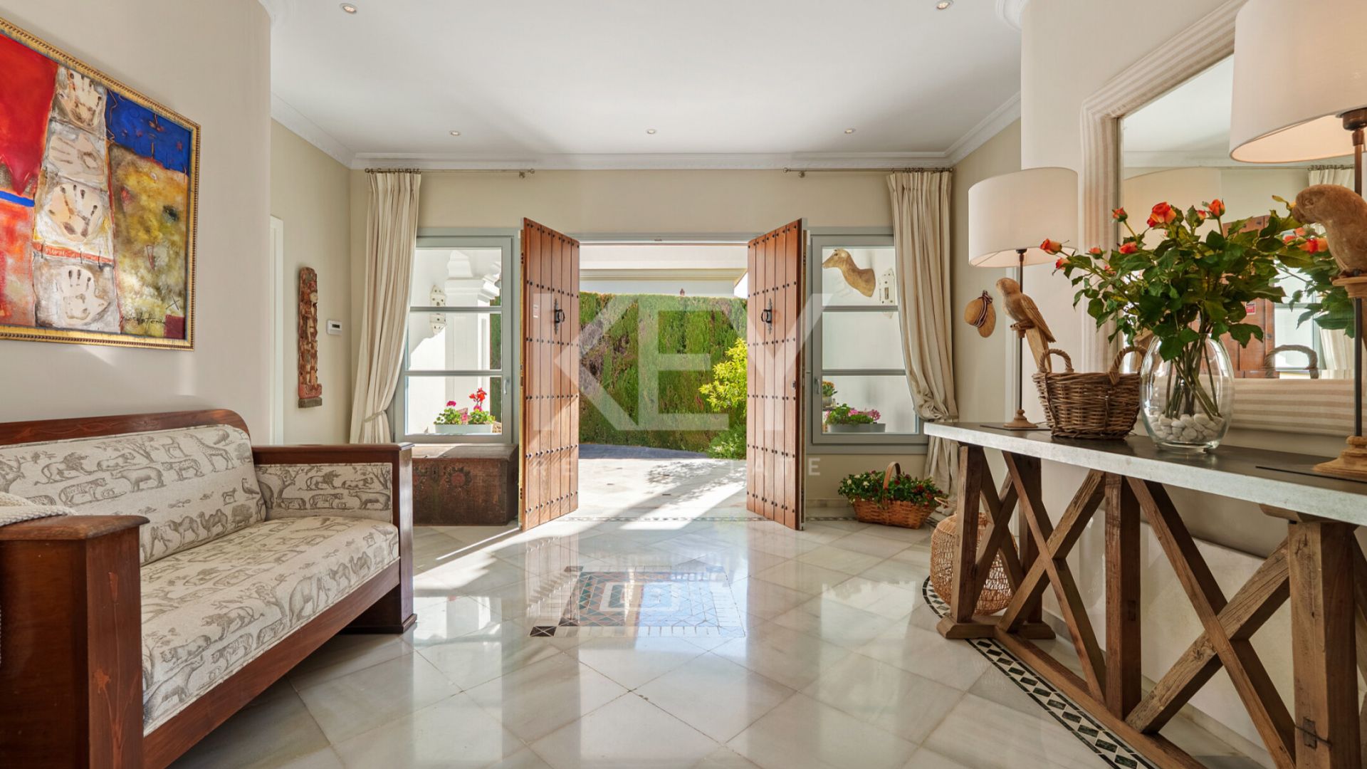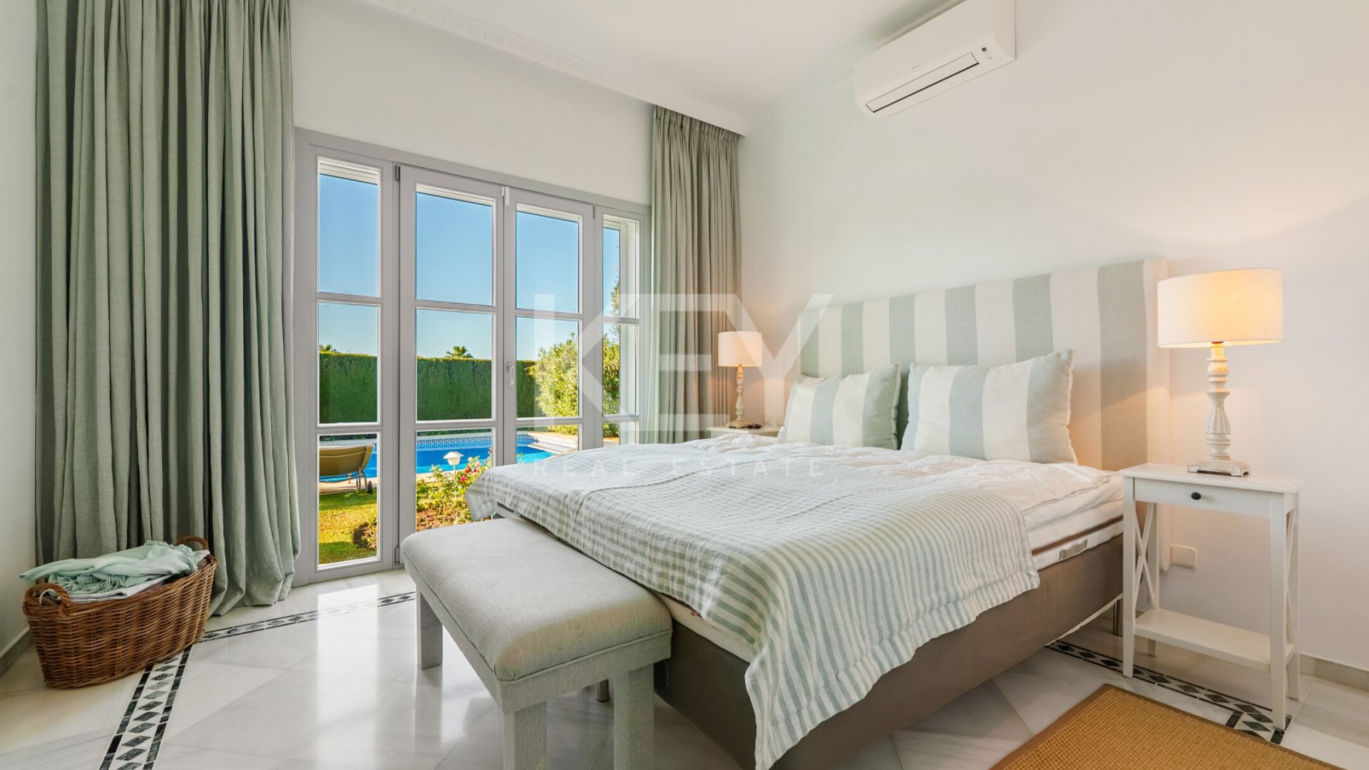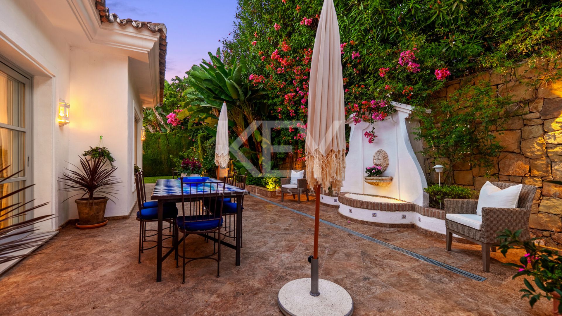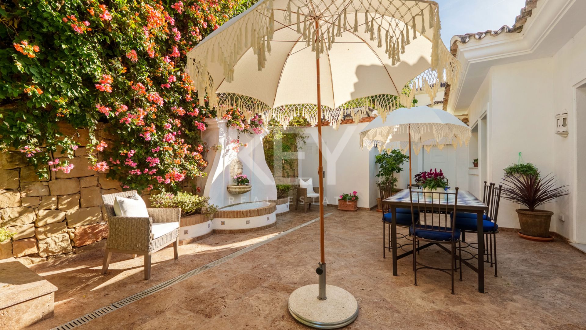 Los espacios interiores destacan por su luminosidad y sensación acogedora, con una conexión natural entre el salón, el comedor y las terrazas exteriores. Los grandes ventanales permiten la entrada de luz durante todo el día, generando un ambiente cálido y relajado. El diseño de concepto abierto conecta directamente con una terraza cubierta que da paso a un jardín cuidado y a la piscina privada. La cocina está completamente equipada con electrodomésticos actuales, combinando funcionalidad con un estilo clásico. Además, cuenta con una zona de desayuno con acceso directo al exterior, lo que la convierte en un espacio práctico y cómodo para el uso diario.
