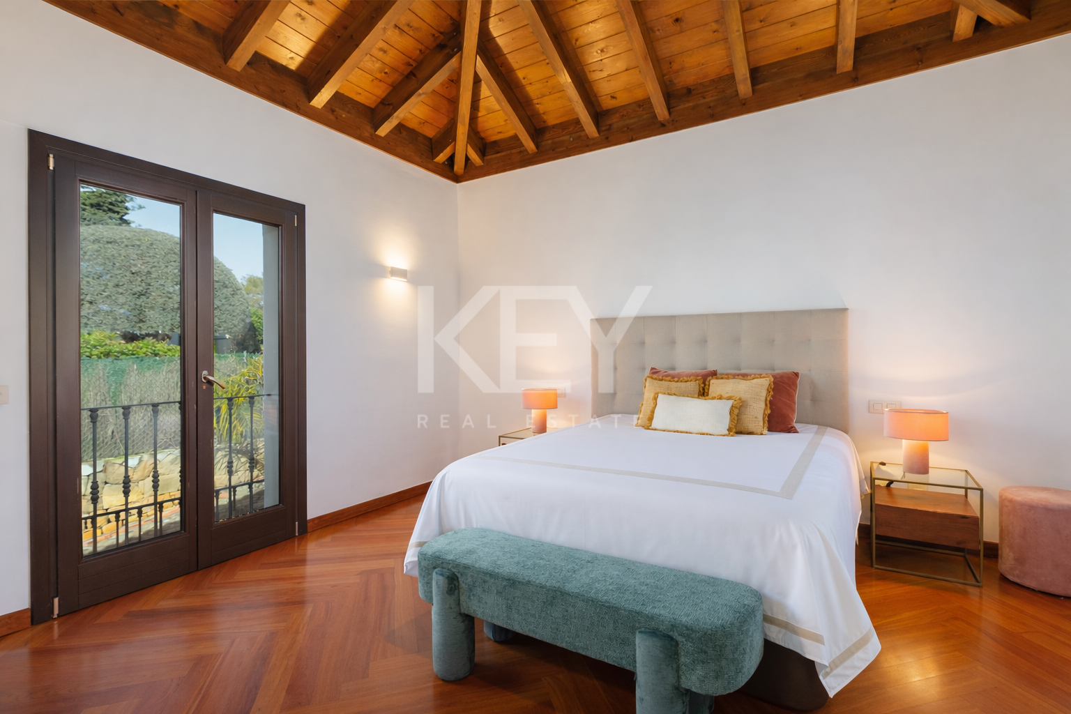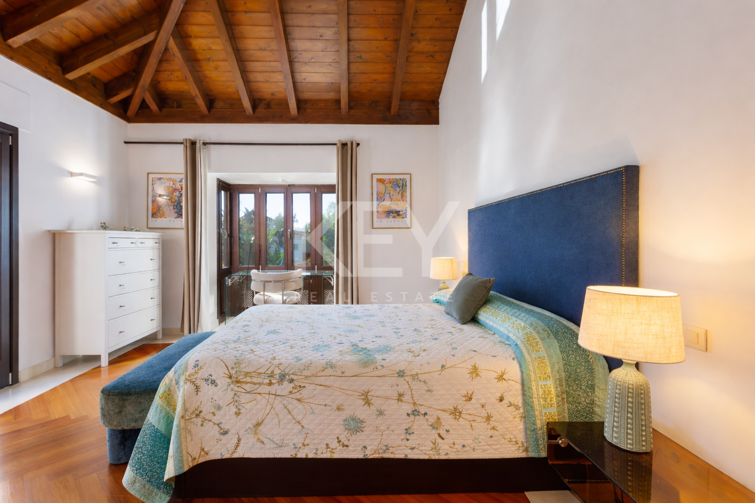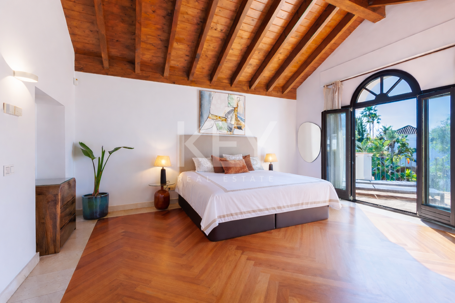All bedrooms and bathrooms are spacious and bright with large windows, a contemporary and elegant style with wooden parquet floors, vaulted ceilings with wooden beams and fitted wardrobes. The master bedroom leads out onto a large south facing terrace overlooking the garden and swimming pool.
