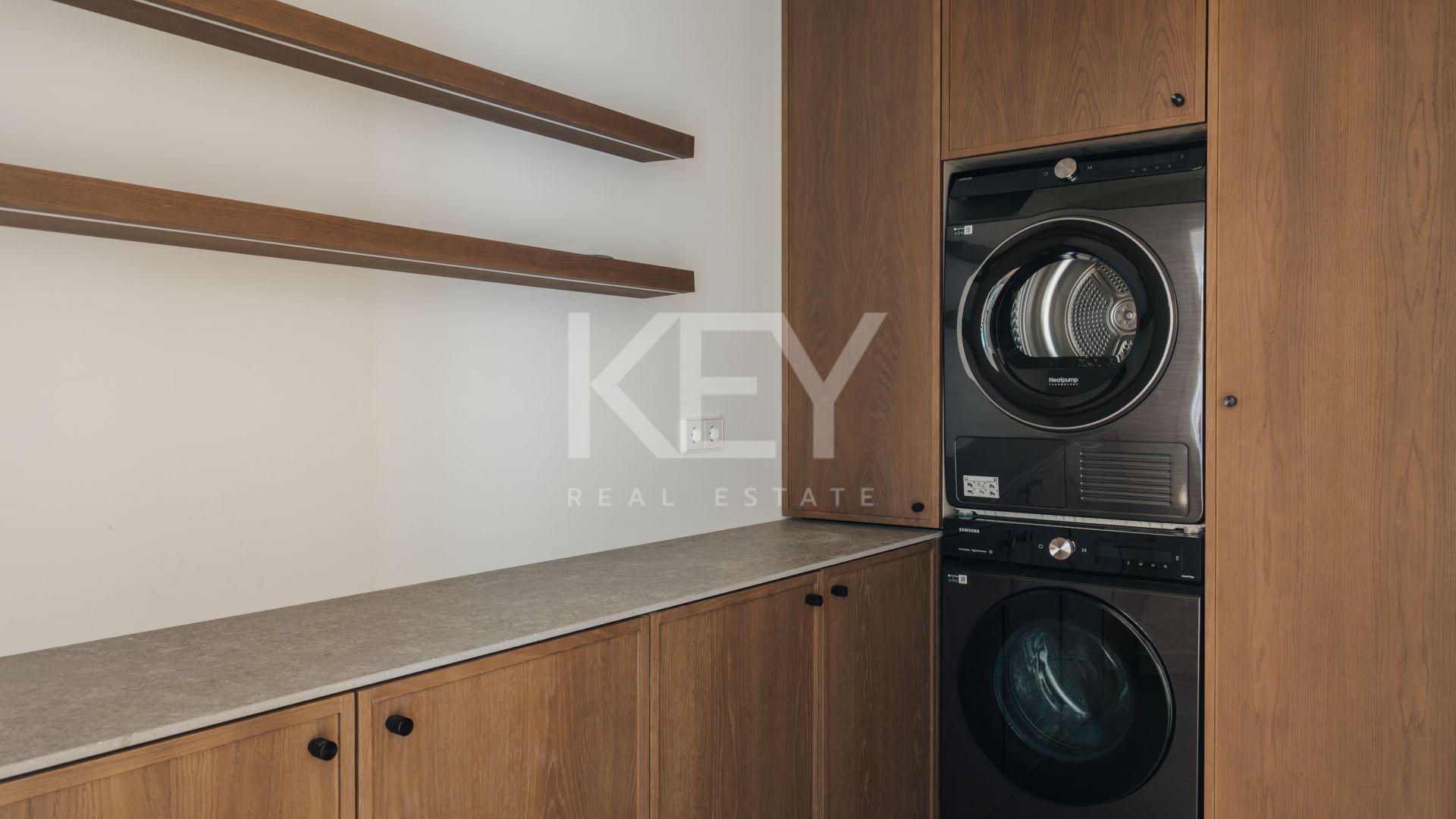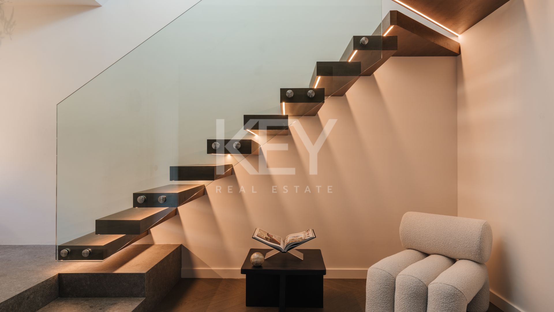 Spread across two floors, the penthouse features four spacious en-suite bedrooms, each with bespoke walk-in wardrobes and stylish integrated bathrooms. The master suite enjoys direct access to a private terrace with an outdoor shower—perfect for relaxing under the sun. A floating staircase with glass railings leads to the upper level, where an open-plan kitchen, dining, and living space opens to the large terrace, complete with an outdoor kitchen and chill-out area ideal for entertaining.