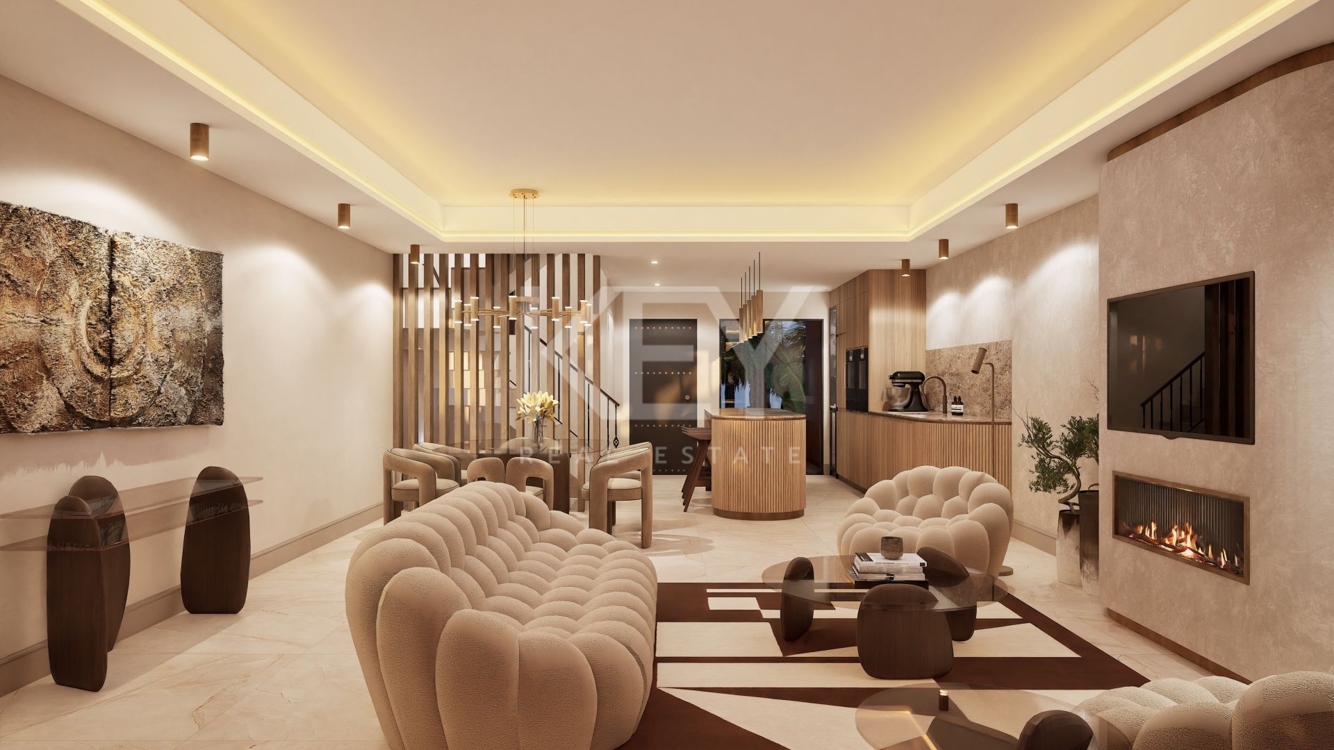 The home spans three floors plus a rooftop solarium and has been completely redesigned by BOHER, featuring clean architectural lines and top-quality materials throughout. The ground floor welcomes you with a bright, open-plan living area and a fully equipped kitchen with premium Siemens appliances. A bio-ethanol fireplace adds warmth to the lounge, which flows out to a covered terrace and private garden.
