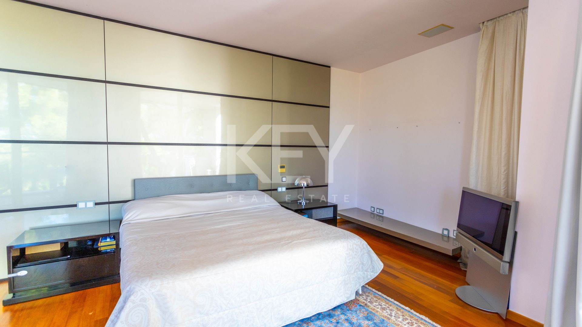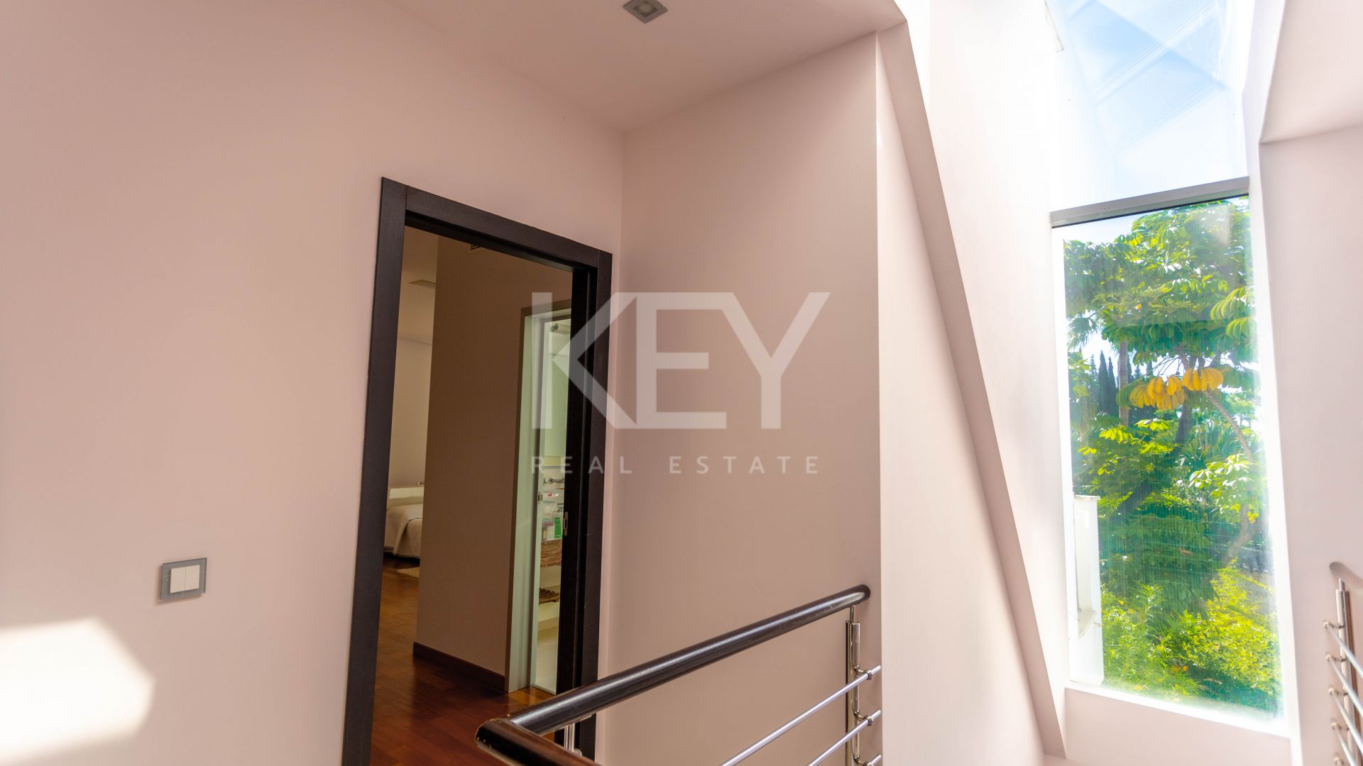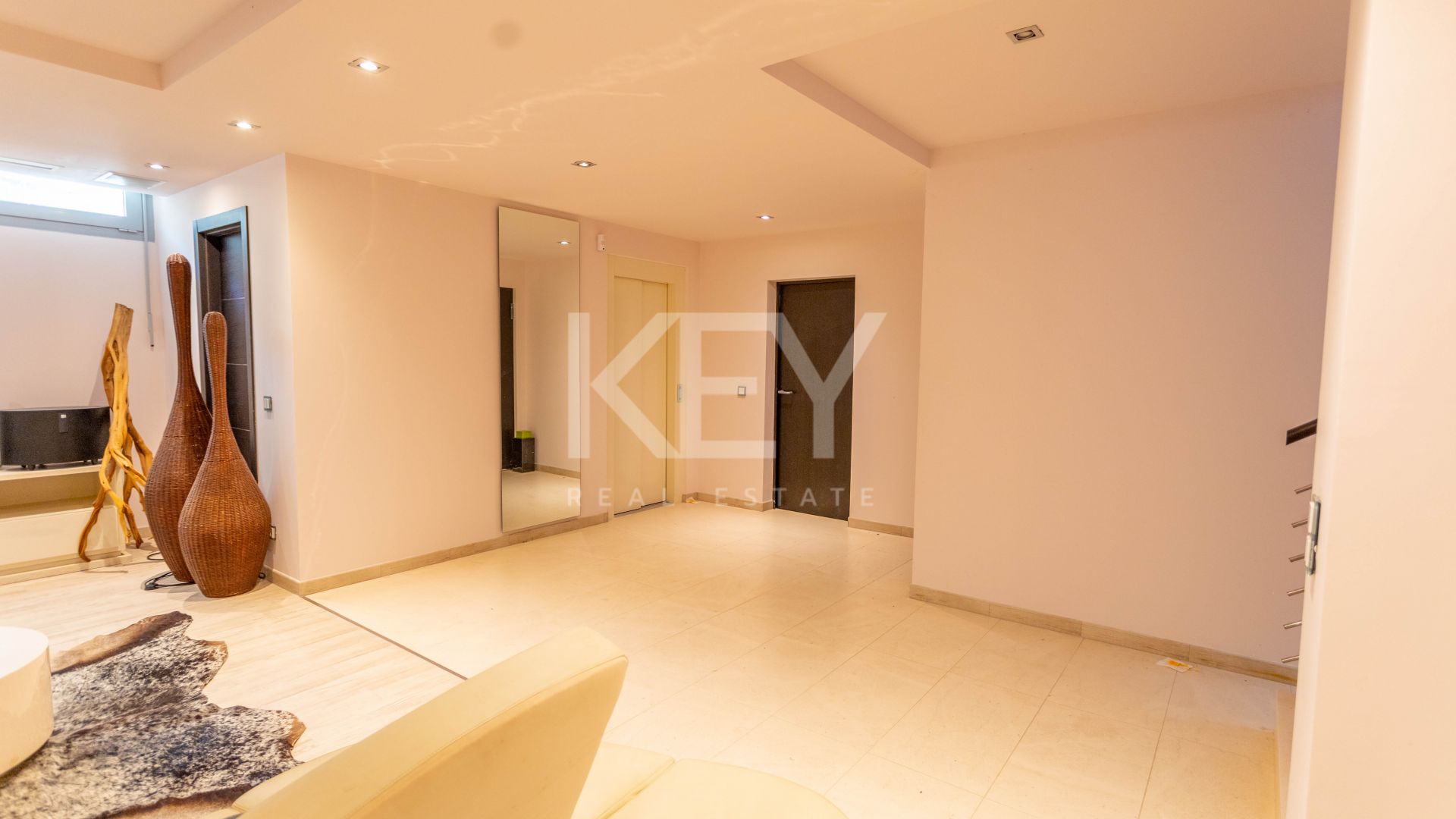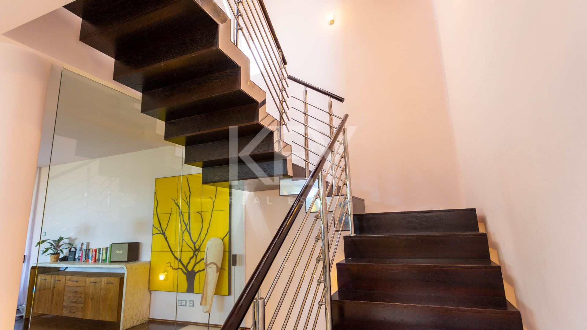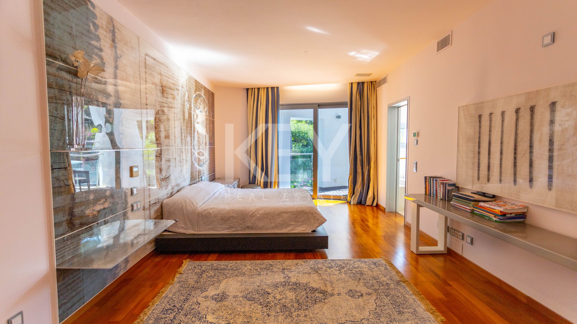 The interiors have been thoughtfully designed to create a seamless connection between indoor and outdoor living. Large windows frame the panoramic views, while the open-plan layout enhances the sense of space and flow. The villa also includes a private lift for added convenience and accessibility.