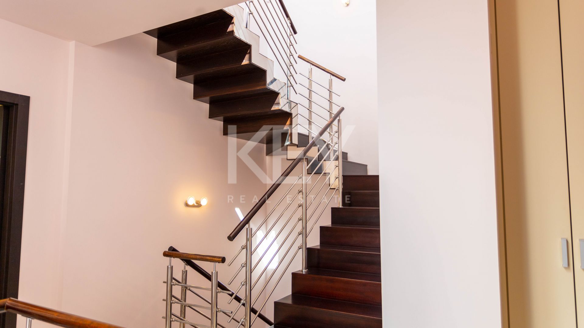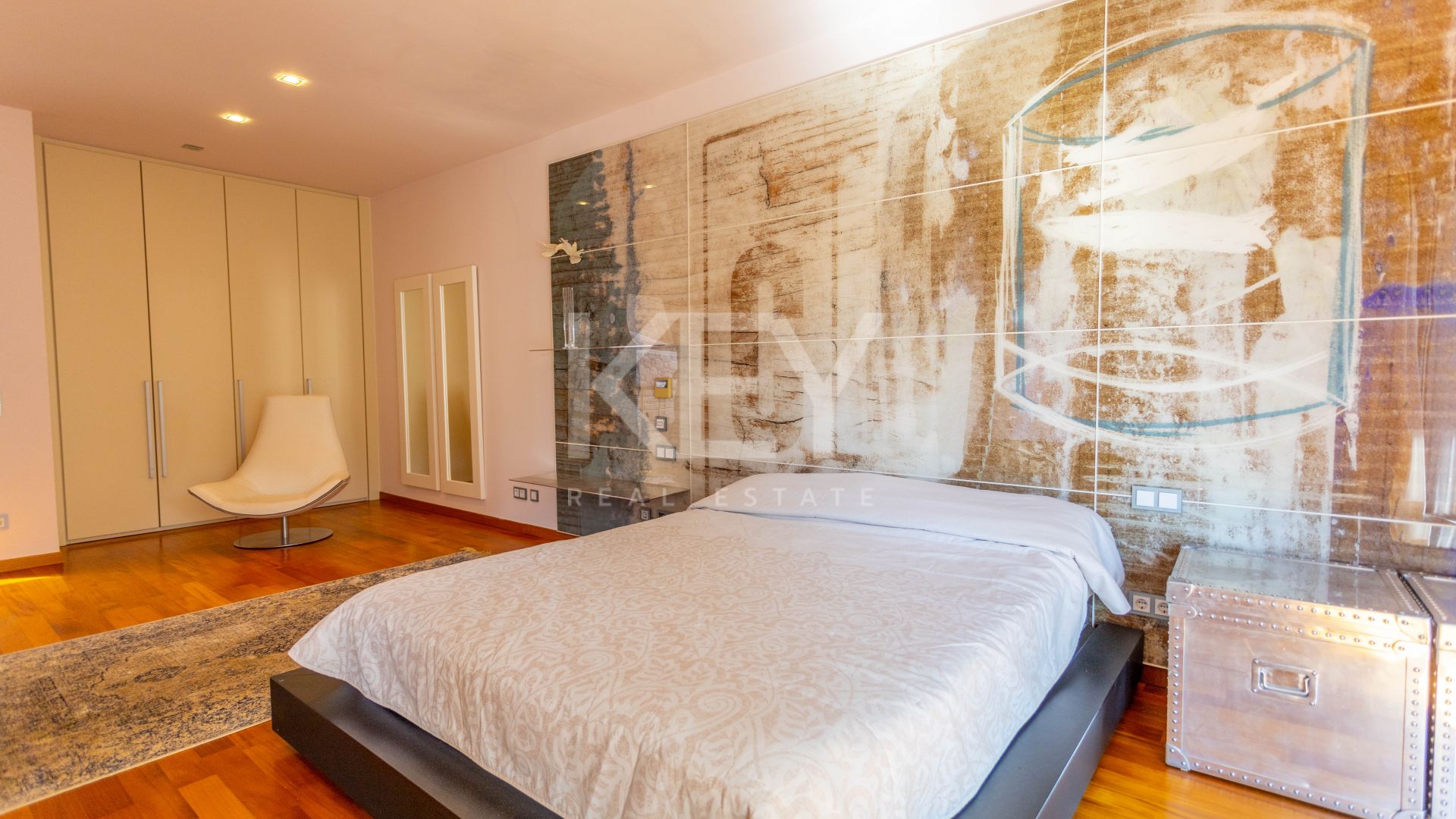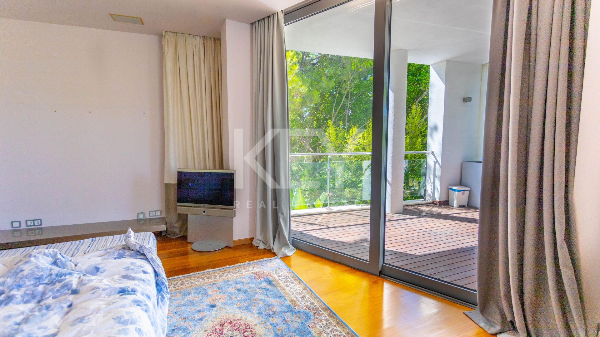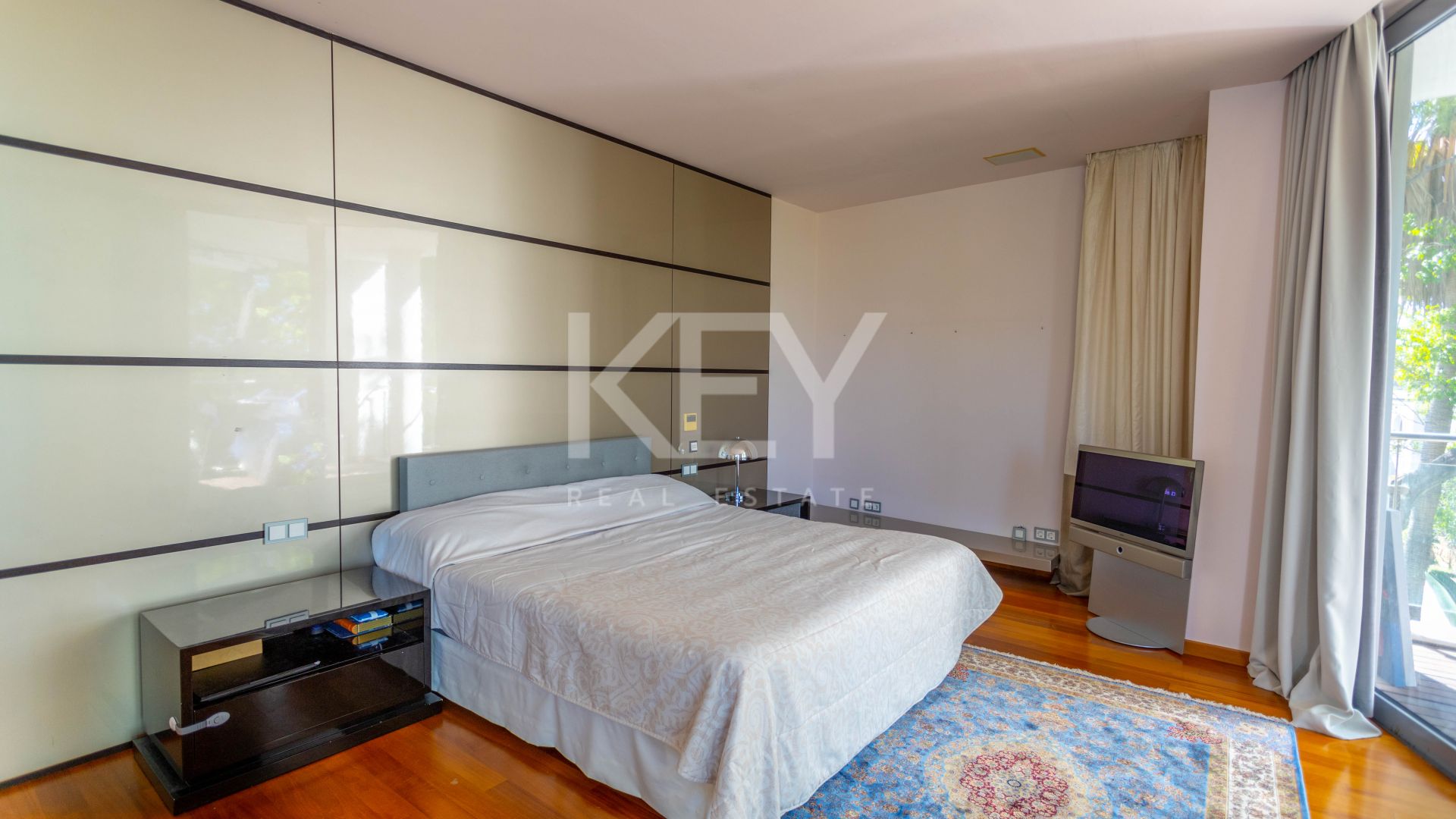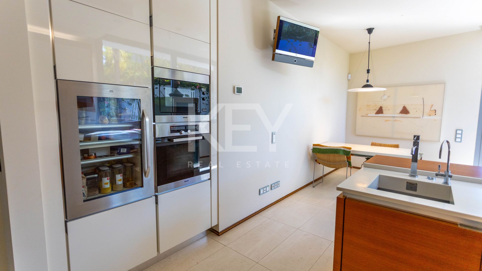 The interiors have been thoughtfully designed to create a seamless connection between indoor and outdoor living. Large windows frame the panoramic views, while the open-plan layout enhances the sense of space and flow. The villa also includes a private lift for added convenience and accessibility.