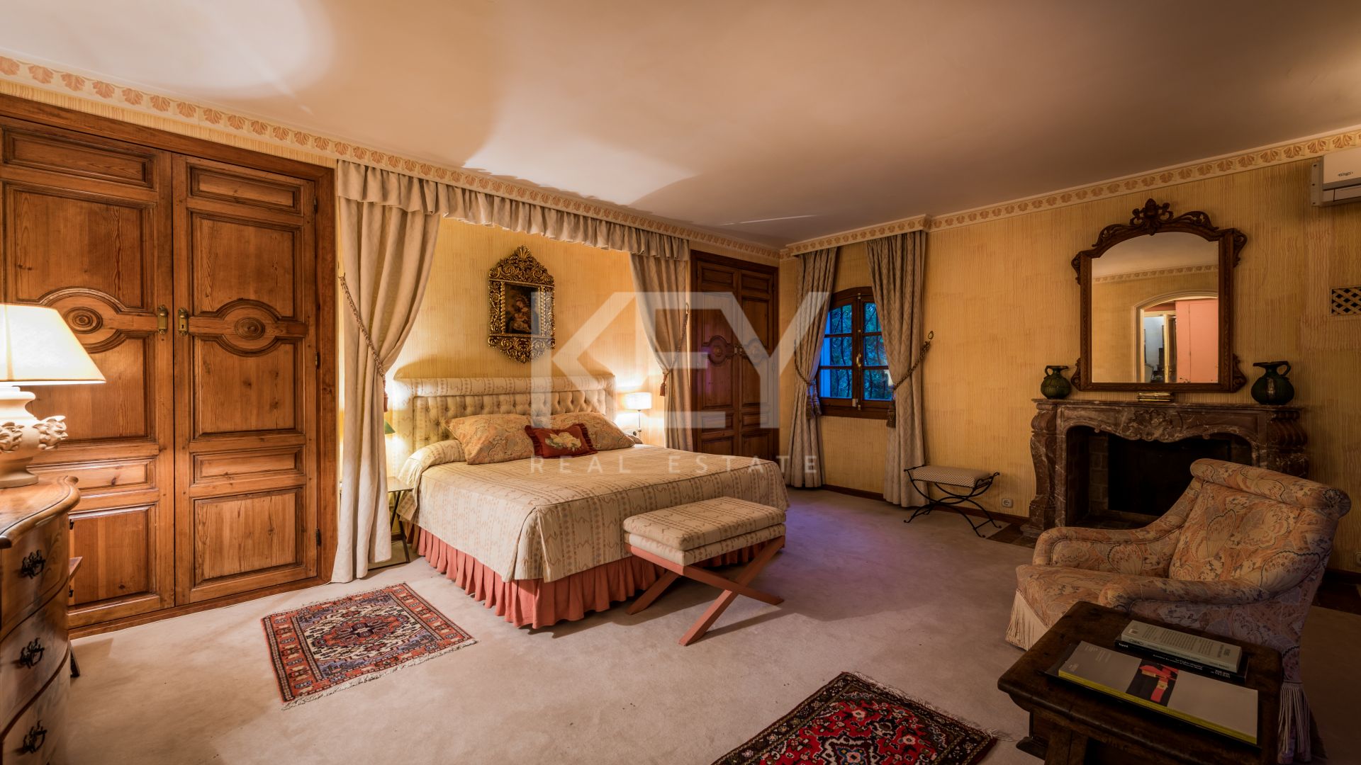 Stepping outside, the property opens to gardens that extend over more than 10,000 m². Mature trees, quiet corners, and natural pathways shape the landscape, offering countless possibilities for redesign and enhancement. The pool area enjoys one of the best viewpoints on the plot — embracing open views of the lake and the surrounding hills — while terraces and shaded seating areas make it easy to enjoy outdoor living throughout the year. Although the grounds would benefit from dedicated refurbishment, they hold the structure and beauty needed to transform them into a remarkable setting.