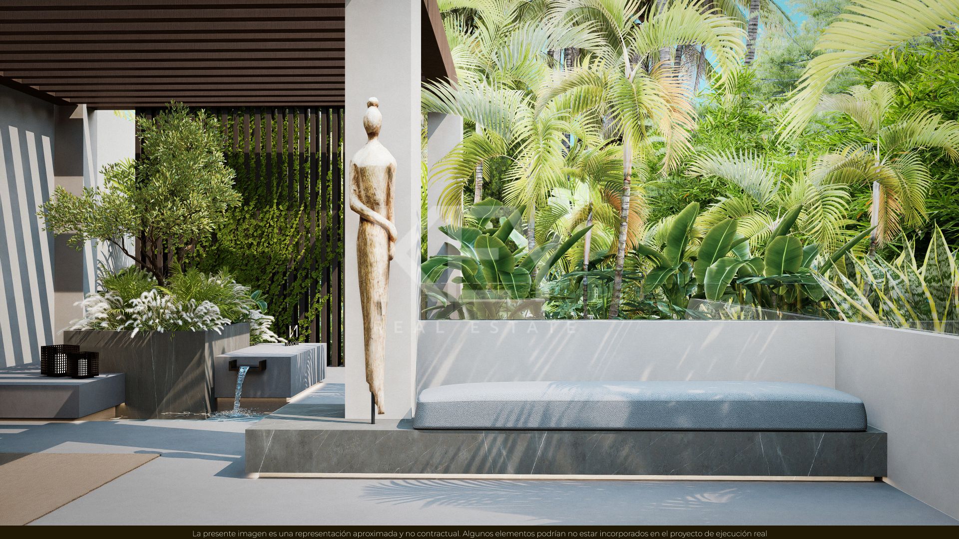 The exterior spaces are one of the highlights of the villa. A sleek infinity-edge pool stretches along the main terrace, creating a beautiful visual extension of the living area. Multiple terraces on different levels allow future owners to enjoy the Mediterranean climate throughout the day—whether it’s morning coffee, outdoor dining, or quiet afternoons by the pool. Garden lounges framed by tropical planting offer peaceful corners for reading, resting, or hosting guests in complete privacy.