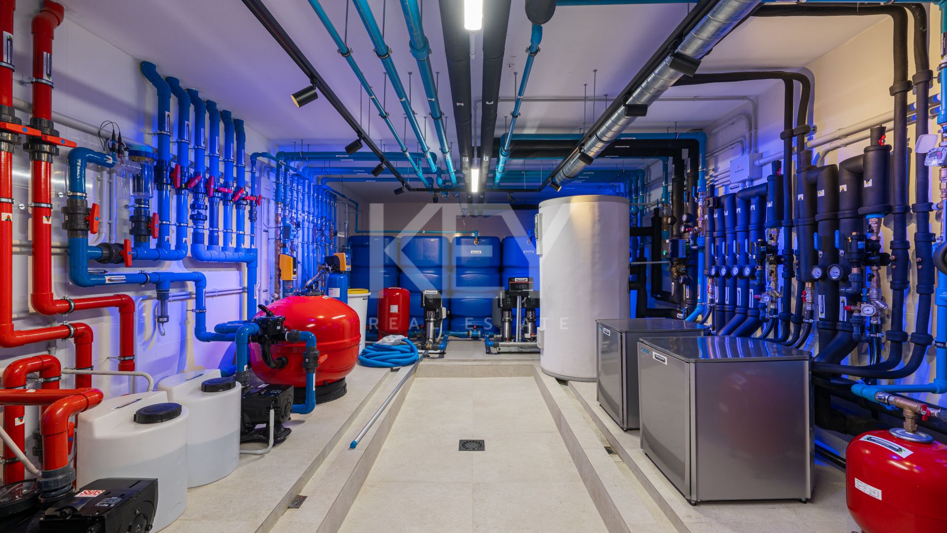 The lower level is dedicated to well-being and entertainment. Here, you will find a comfortable guest bedroom, a utility area, and a lounge designed for social moments, complete with a custom bar. A full spa anchors this floor, featuring an indoor heated pool, sauna, and a private gym—ideal for year-round wellness. A sophisticated machine room highlights the villa’s technical quality and the effort put into ensuring smooth day-to-day living.