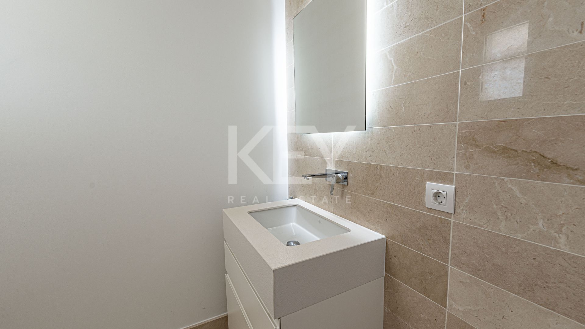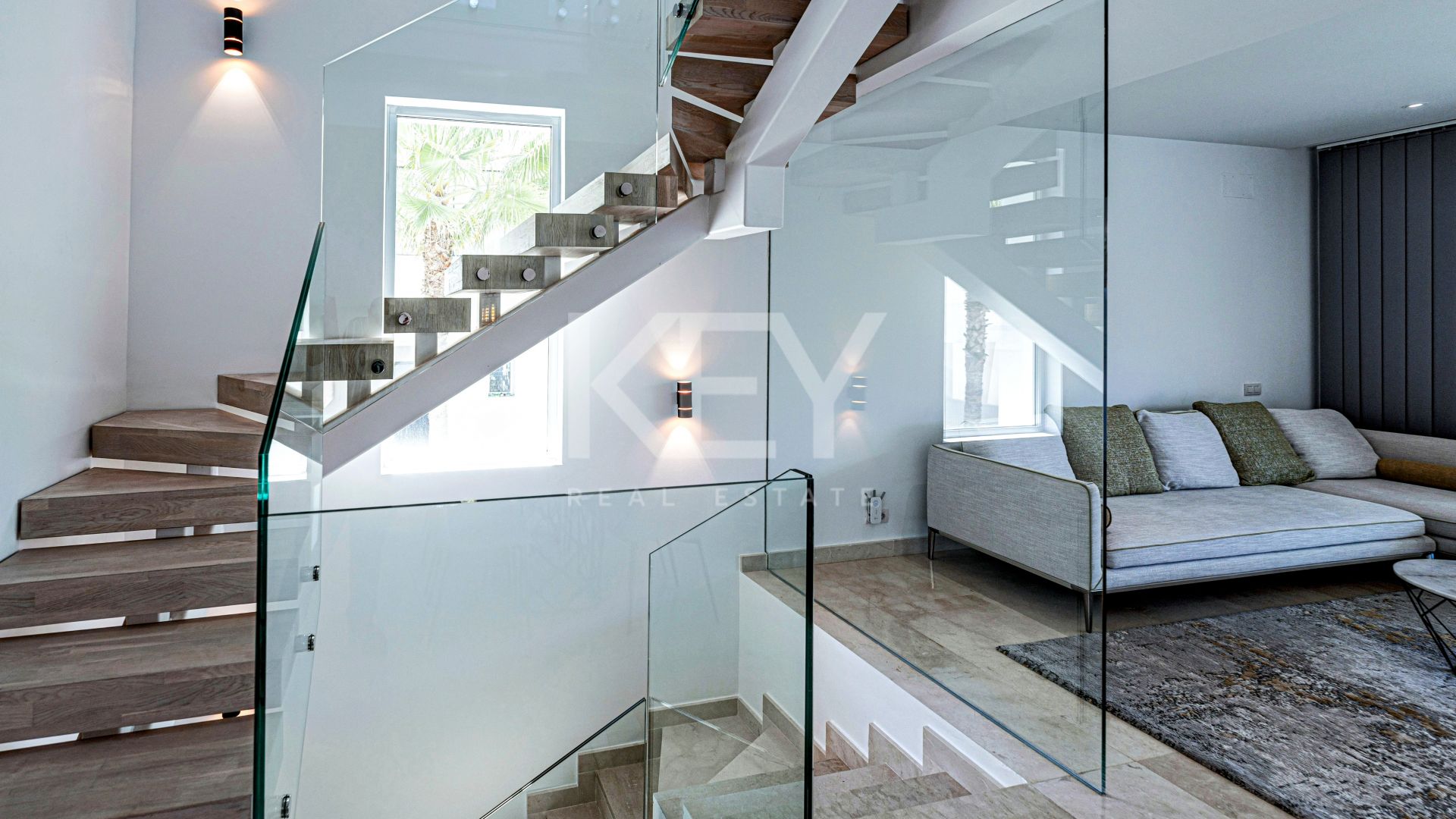 The upper floor features a master bedroom with an en-suite bathroom, fitted wardrobes, and direct access to a private terrace with sea views. Two further bedrooms share a well-designed bathroom, making the layout suitable for families, guests, or flexible use as a home office. From here, the property continues upward to a private rooftop solarium, offering open views towards the Mediterranean and surrounding greenery. This level includes a private swimming pool and generous outdoor areas for relaxing or entertaining.