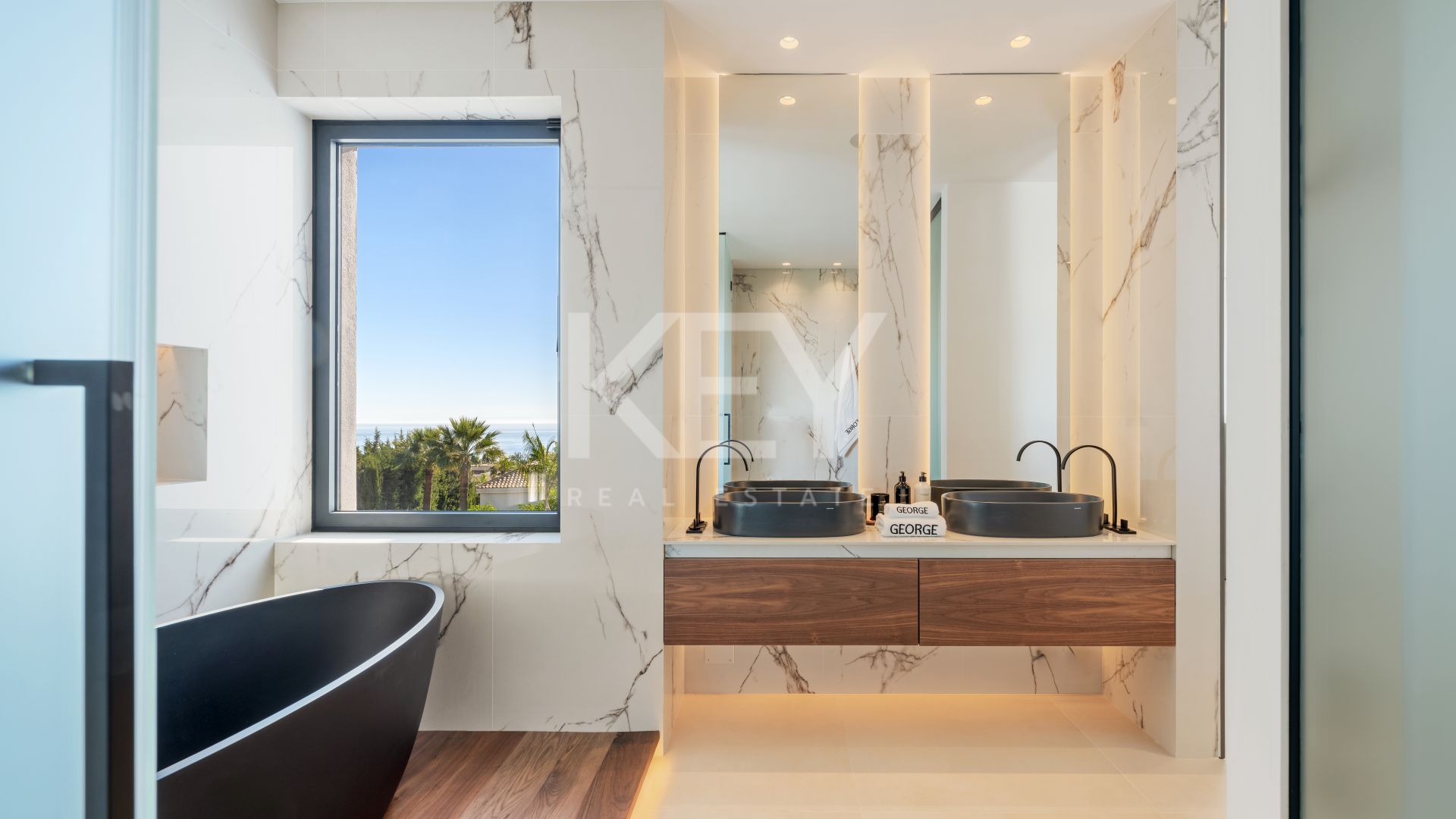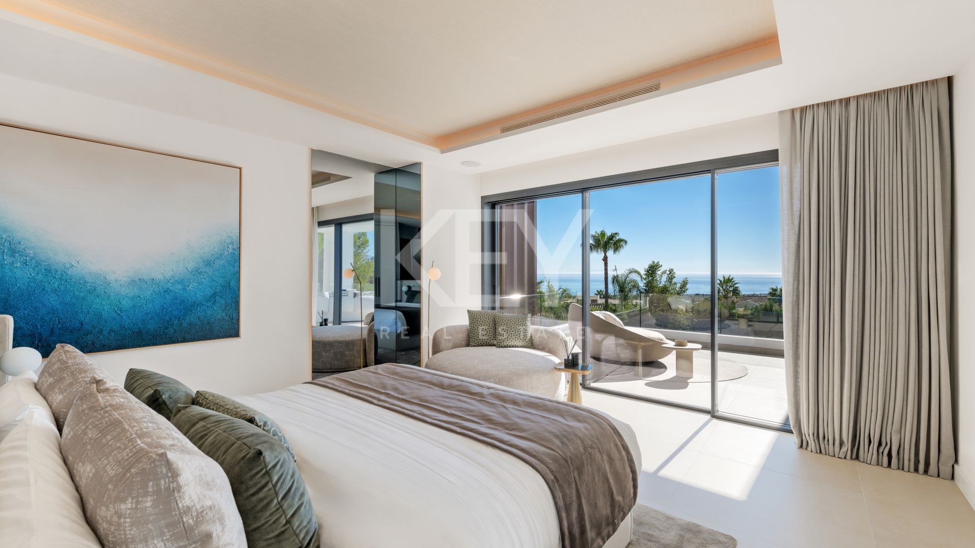 The upper level features three bedrooms with access to an expansive terrace overlooking the Mediterranean coastline. From this vantage point, panoramic views extend across Marbella, the sea, and, on clear days, as far as Gibraltar and North Africa. The principal suite includes a private bathroom and a refined, calm atmosphere.