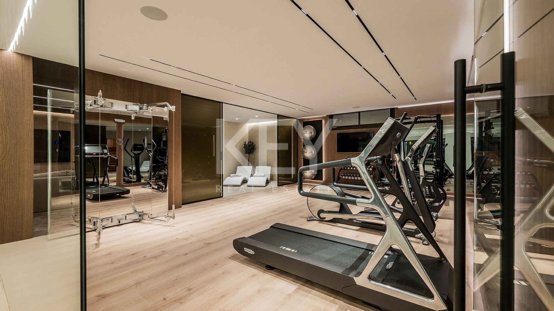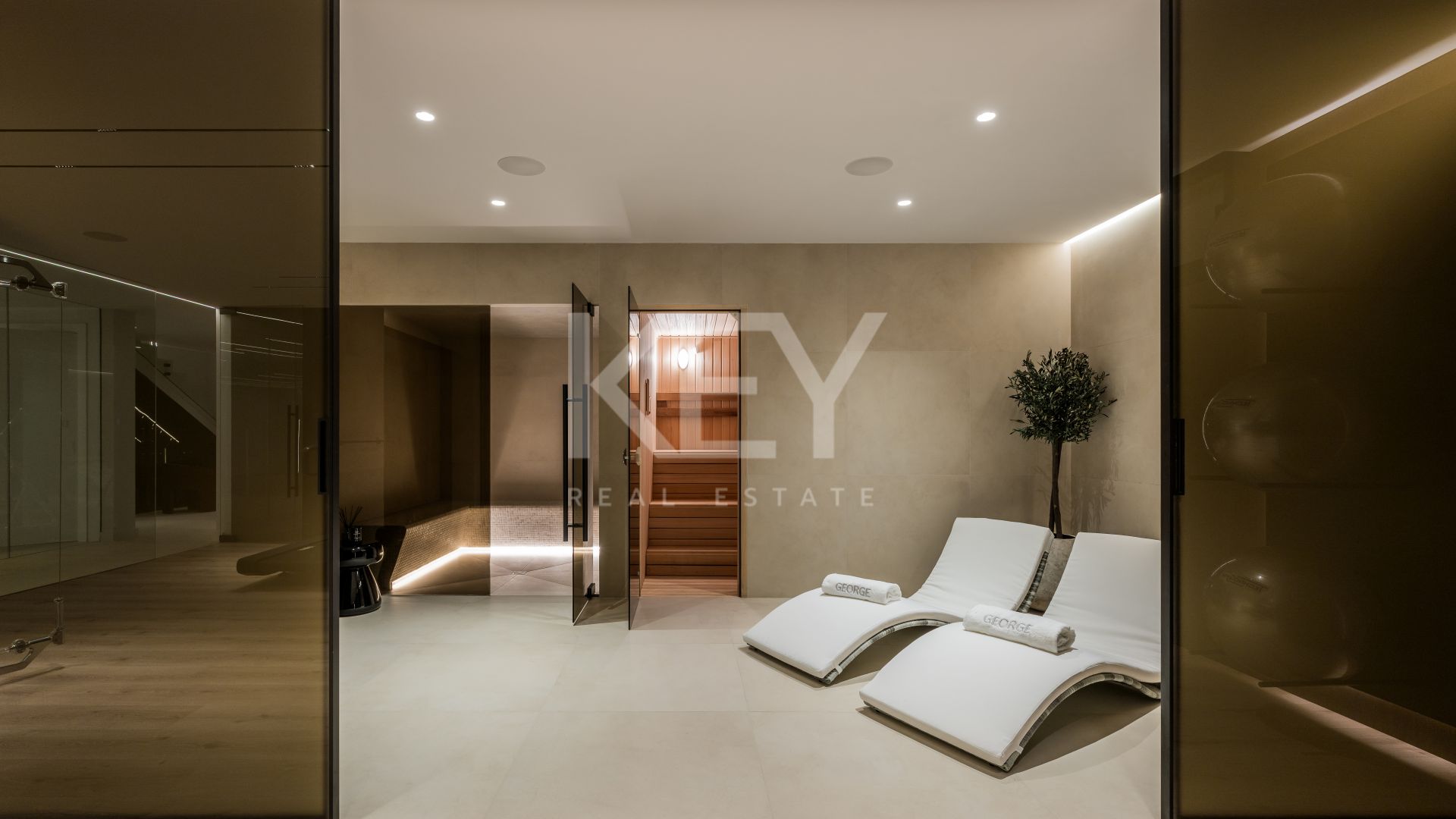 The lower level is dedicated to wellness and leisure, offering a gym, sauna, hammam, wine storage, an additional guest bedroom with bathroom, and a garage designed to receive natural light through a glass-fronted entrance.