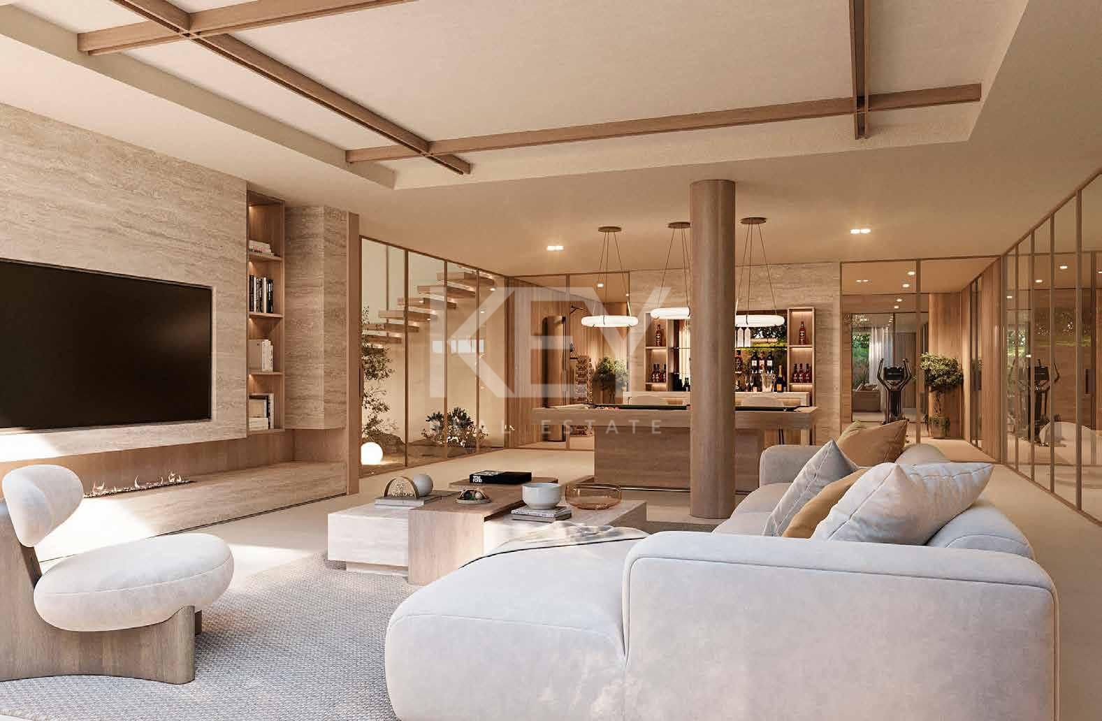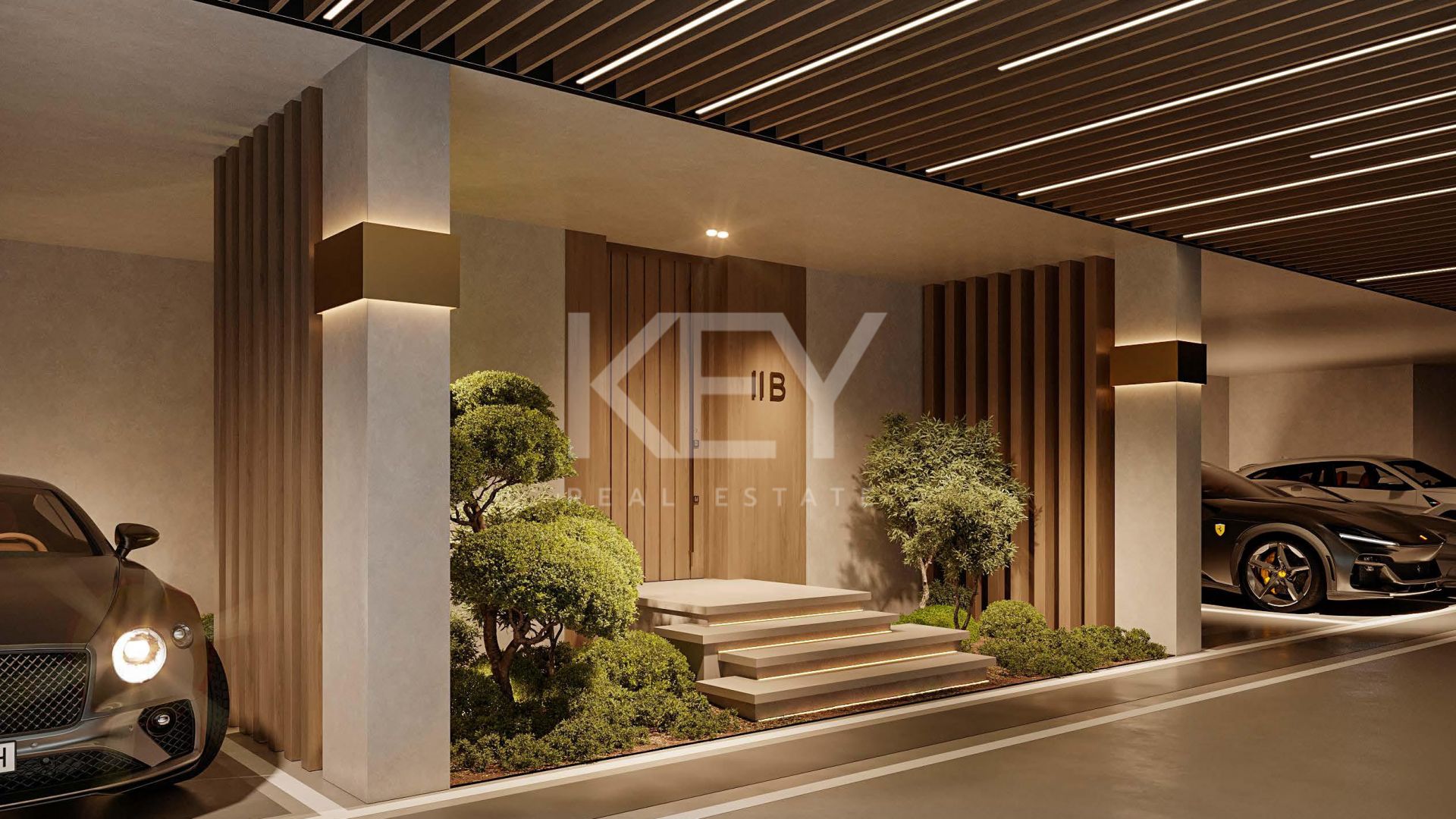 Inside, design intent focuses on light, transparency, and spatial fluidity. Floor-to-ceiling glazing connects living areas with outdoor gardens, inviting natural brightness and Mediterranean breezes throughout. The open-plan living room flows effortlessly onto the garden and terrace, forming an ideal setting for entertaining or quiet family time. Bedrooms are all en-suite and designed with comfort and privacy in mind, while a dedicated lift connects all floors for easy mobility.