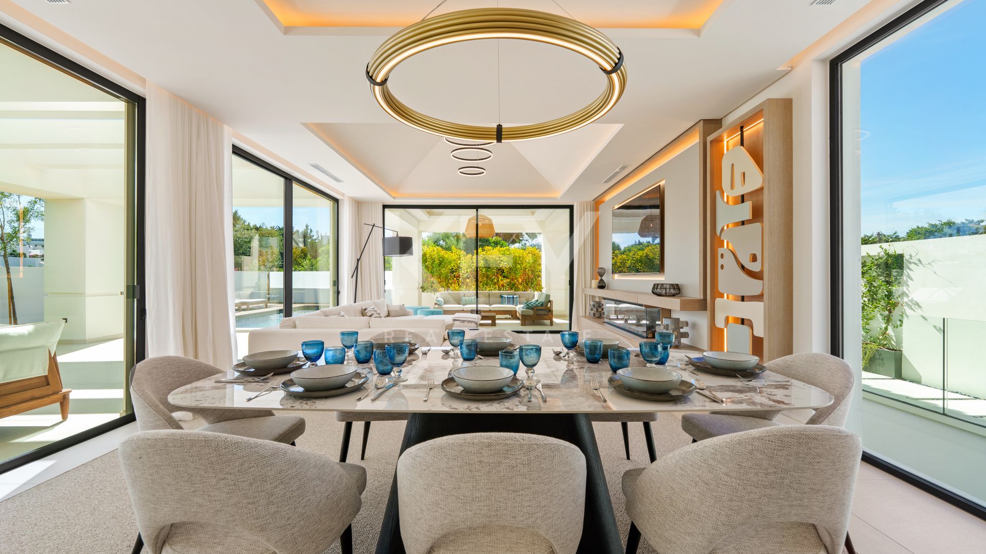 Inside, the villa follows a bright open-plan layout that is highly sought after in today’s luxury real estate market. Large floor-to-ceiling windows bring in natural light throughout the day and create a smooth connection between indoor and outdoor areas. The main living and dining space is centred around a custom media feature wall and flows directly into a designer kitchen fitted with integrated appliances and a striking wood-finish island. This configuration supports both everyday family life and entertaining, making it ideal for buyers who value style as much as functionality.