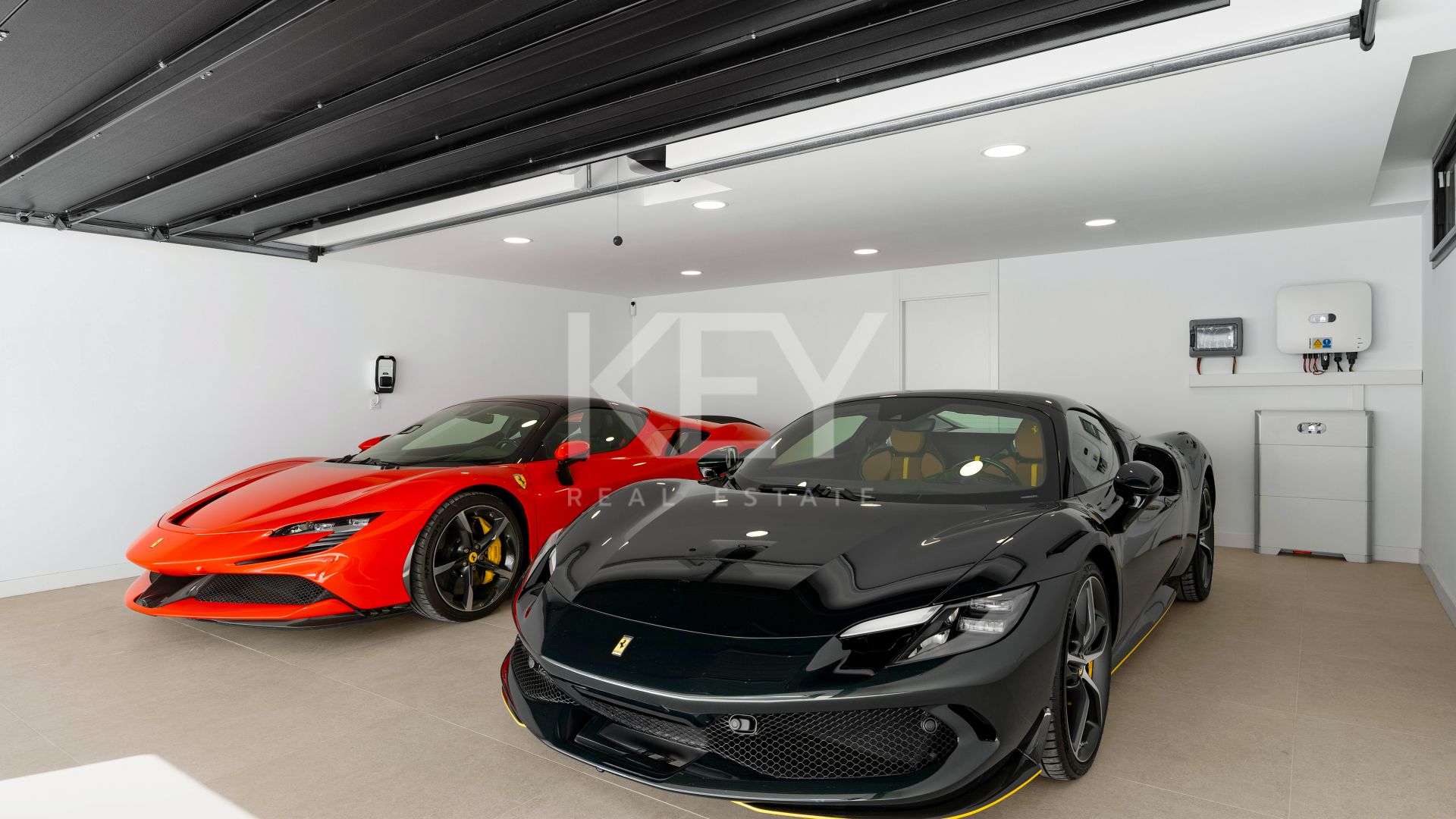 The lower level expands the home’s functionality with two further en suite bedrooms, a guest toilet, a cinema room for film nights, a utility room and a private garage with space for two vehicles. Modern conveniences such as a home automation system, underfloor aerothermal heating, solar energy panels and a feature fireplace enhance both comfort and sustainability, reflecting smart living standards.