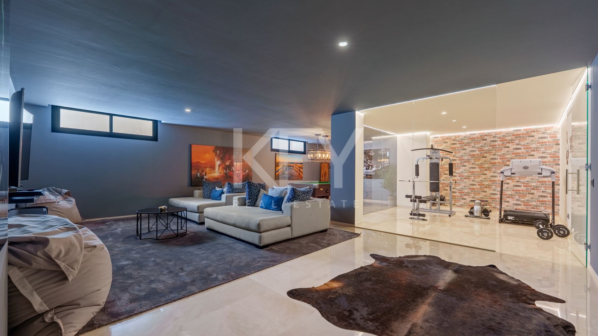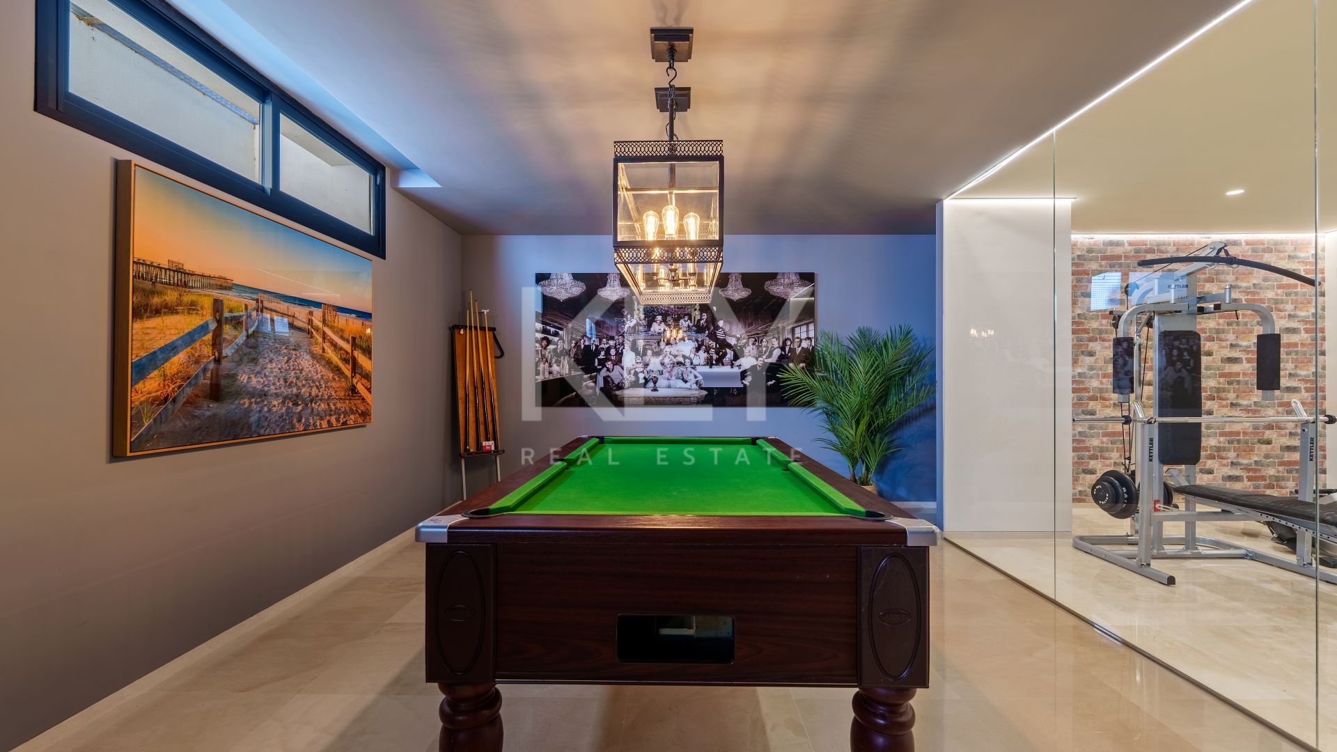 Leisure and wellbeing are central to the layout. A dedicated entertainment level includes a bar, billiards area, and relaxed lounge zone, ideal for hosting guests. Adjacent, a glass-fronted private gym with feature brickwork provides a motivating workout space without leaving home — an increasingly popular requirement among luxury villa buyers.