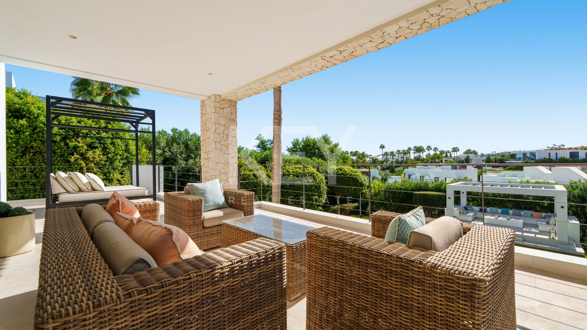 The landscaped garden frames the residence with manicured greenery and sculptural planting, while a shaded pergola lounge creates a natural transition between house and pool. The private swimming pool, bordered by elegant stone paving, becomes the visual heart of the exterior. Upstairs, a generous solarium terrace with jacuzzi offers open skies and a peaceful setting for sunbathing or evening relaxation — key features many international buyers seek when searching for property for sale in Nueva Andalucía.