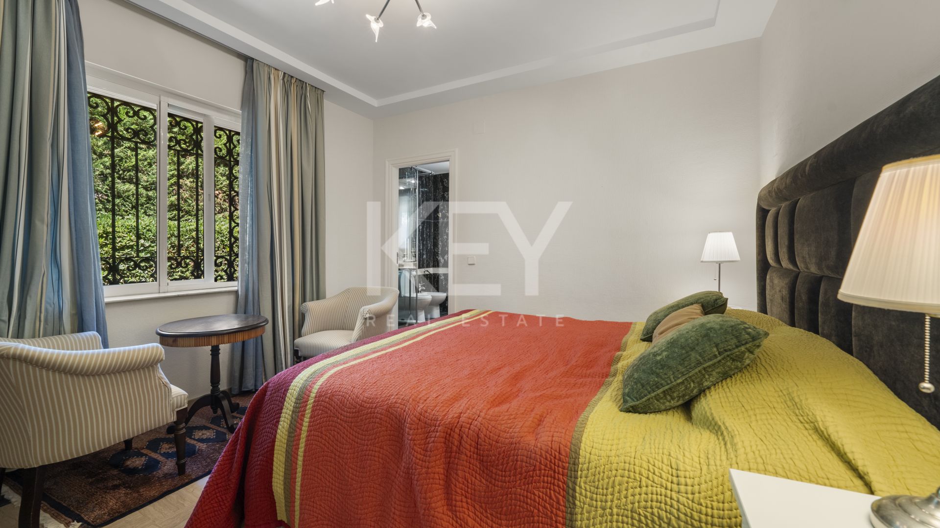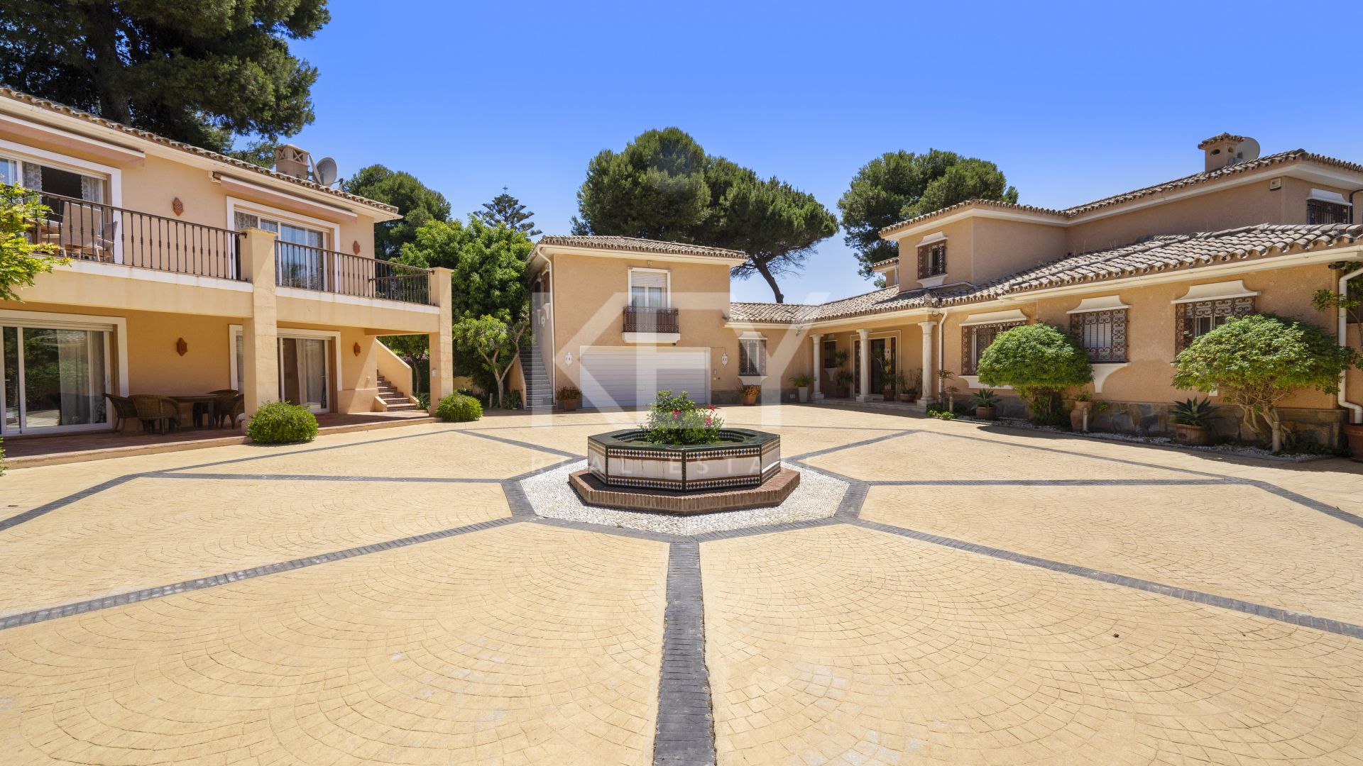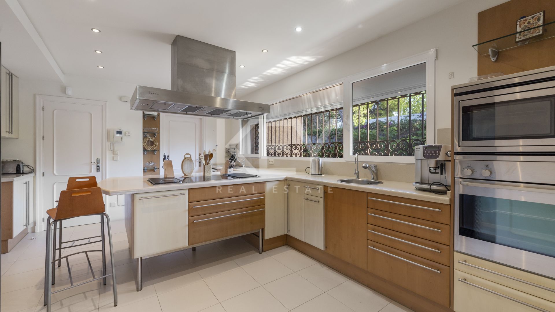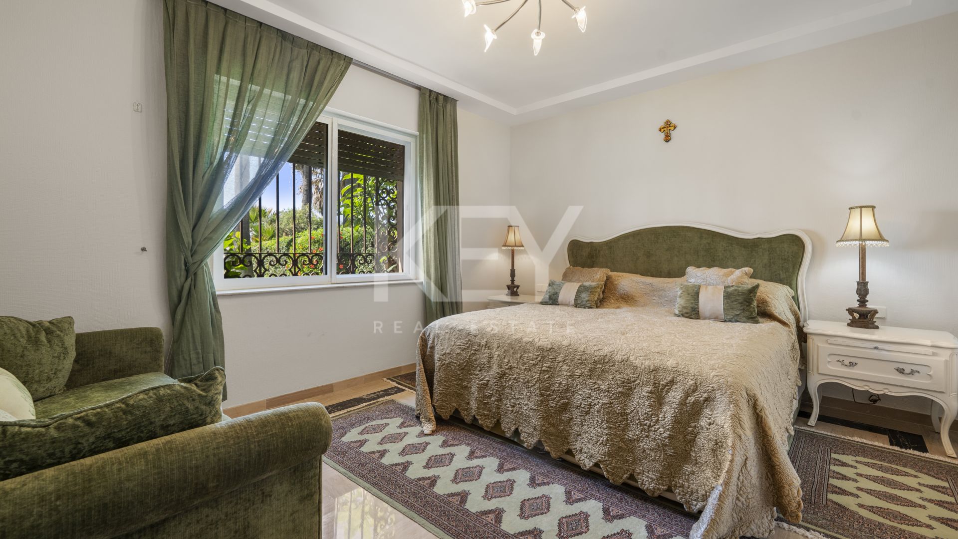 The outdoor areas are designed to fully embrace the Mediterranean lifestyle. A large swimming pool is set within mature gardens, complemented by open terraces, fruit trees, and dedicated leisure areas. A children’s play zone and a barbecue area create an ideal environment for outdoor living and entertaining. The property also benefits from a high-level security system and generous parking facilities, offering peace of mind and practicality.