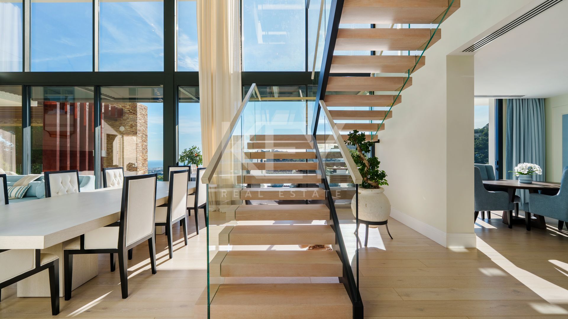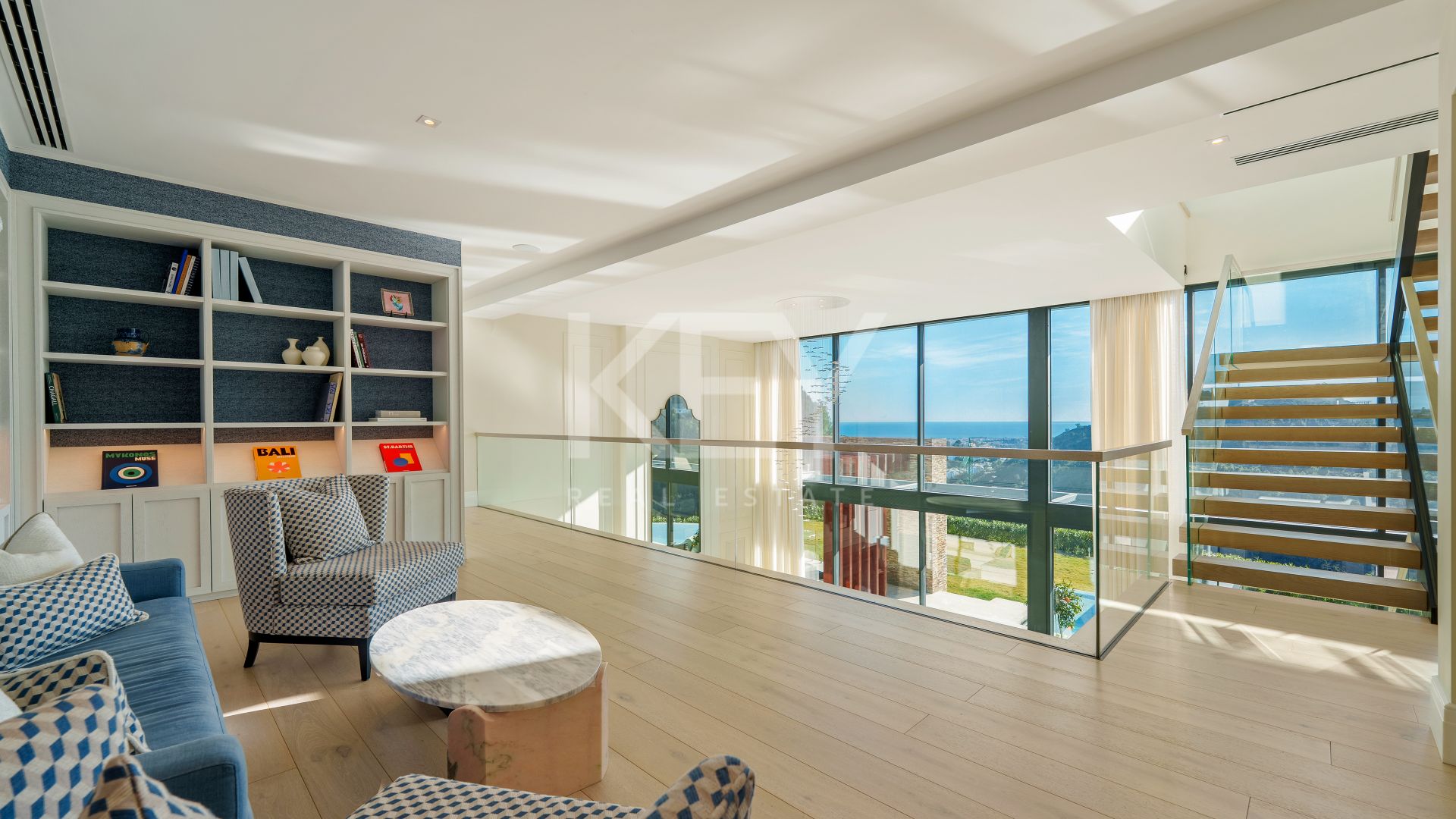 The architecture focuses on open-plan living with strong natural light and uninterrupted views. Expansive glazing, double-height volumes and seamless transitions between indoor and outdoor areas create a fluid layout designed for today’s lifestyle. A sleek designer kitchen connects to generous lounge spaces ideal for entertaining, while refined finishes such as natural stone, bespoke woodwork and warm flooring introduce texture and balance. Every bedroom has been planned with its own character, offering privacy and comfort while maintaining a cohesive contemporary design that reflects current trends in luxury real estate Marbella.