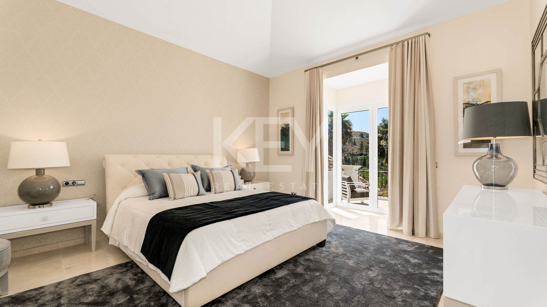 The main floor includes a double bedroom with garden views together with a versatile room currently used as a TV lounge, easily converted into an additional guest suite. Upstairs, three en-suite bedrooms offer private terraces with views of the mountains, garden, and sea. The master suite stands out for its spacious bathroom and elevated terrace overlooking the coastline, creating an atmosphere of comfort often searched under keywords such as private golf villa Costa del Sol or villa with panoramic sea views.