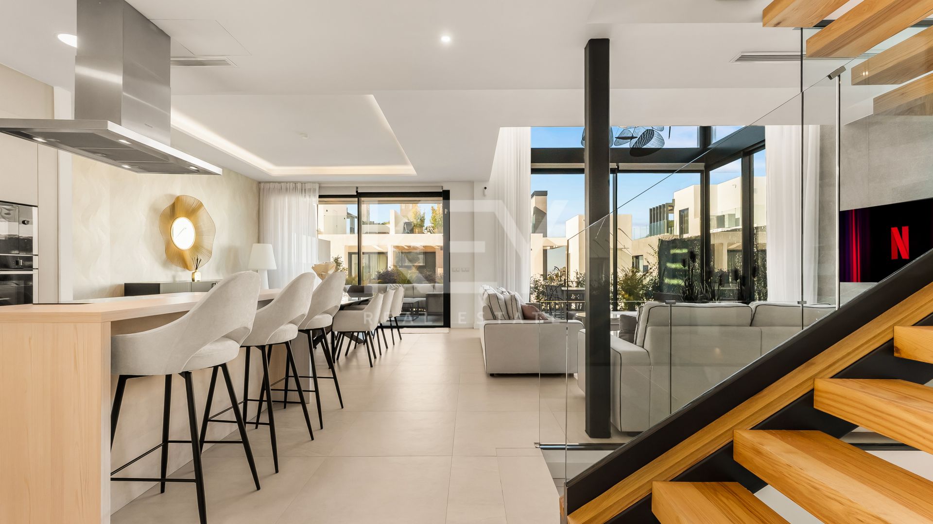 Located in the residential area of Rio Real in the eastern part of Marbella, this modern townhouse-style villa presents an attractive opportunity for buyers seeking a sea-view property in Marbella or a contemporary home close to golf courses, beaches, and all essential amenities. The home is arranged across several levels — basement, main floor, upper floor, and solarium — and features five bedrooms, each with its own en-suite bathroom, offering a comfortable layout suited to family living, second-home owners, or investors interested in the Marbella property market. Panoramic windows fill the interiors with natural light while opening up views of the Mediterranean Sea.