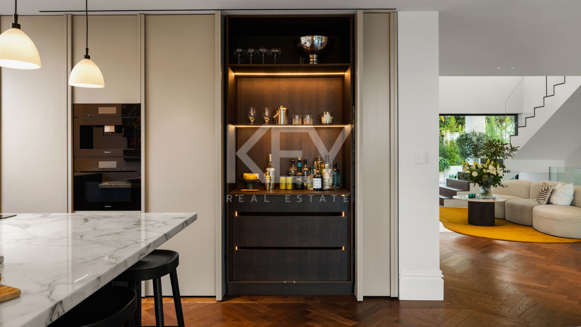 Outside, the landscaped garden and water feature set a calm tone from the moment you arrive. The heated saltwater swimming pool, outdoor kitchen, and bar area make the exterior spaces ideal for enjoying Marbella’s climate year-round. The design supports an indoor-outdoor lifestyle that many international buyers look for when searching for property in Marbella.
