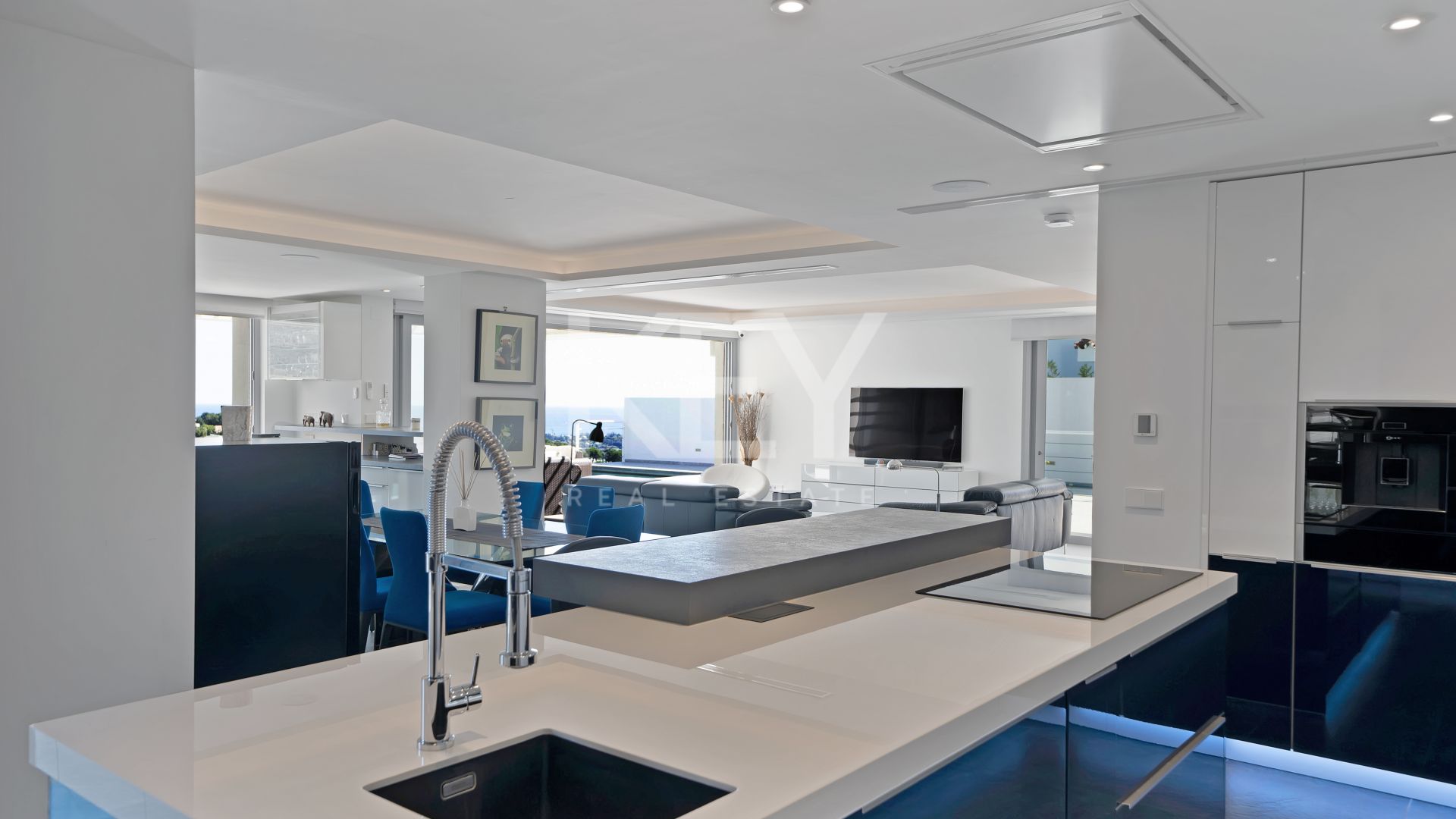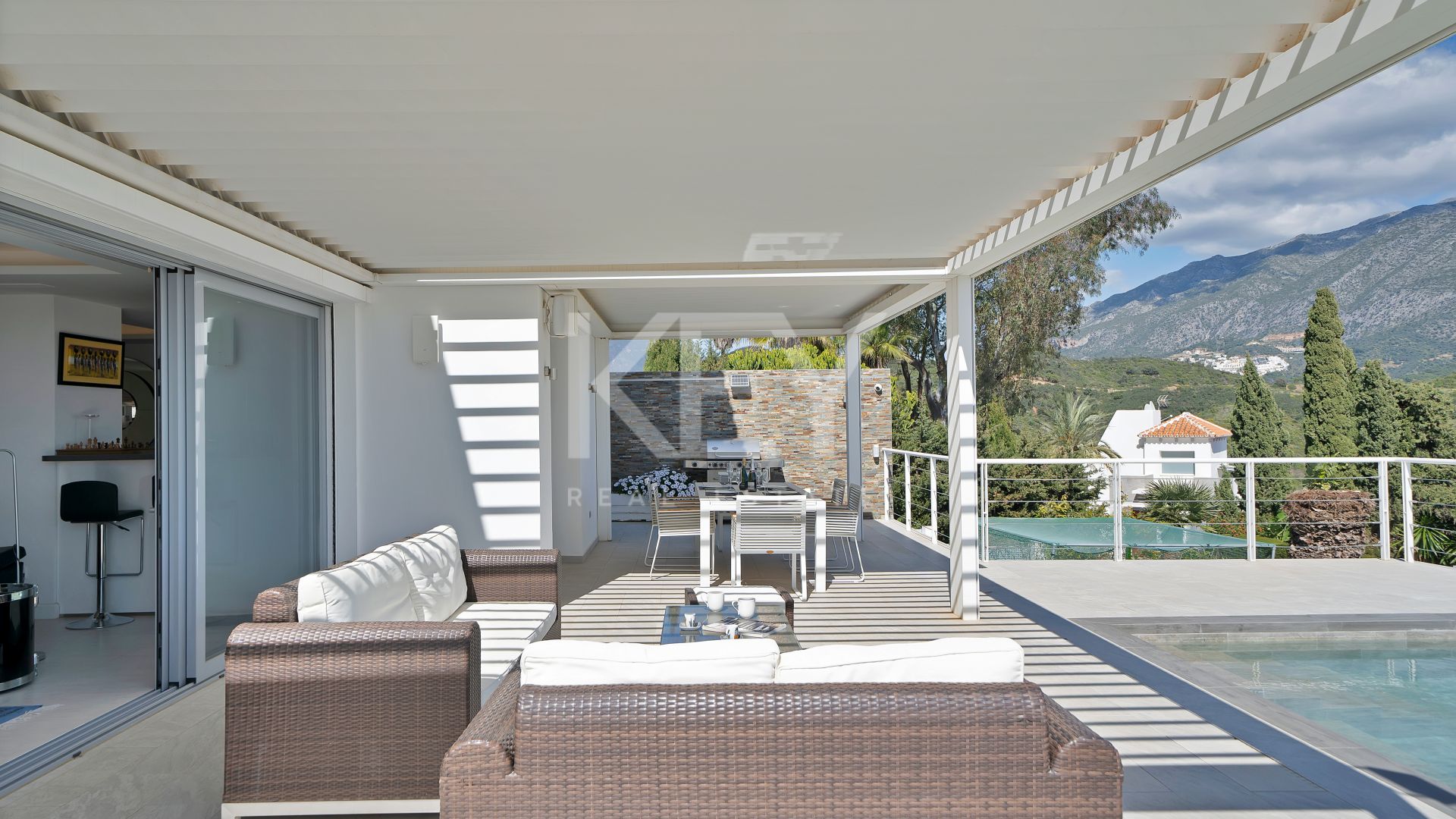 The home has been redesigned for bright, open living, with panoramic views and excellent natural light throughout the interior. It currently offers 4 bedrooms and 3 bathrooms, while the layout also allows the creation of extra bedrooms if a buyer needs more accommodation. The main floor brings together the living room, dining area and kitchen in one flowing space that feels practical for daily life and equally well suited to hosting family and guests. Large sliding doors connect the interior with an expansive terrace and a full-width swimming pool, creating the kind of indoor-outdoor lifestyle that makes Marbella villas for sale so consistently sought after. The kitchen has a central island, clean contemporary lines and premium appliances, combining visual impact with everyday functionality.