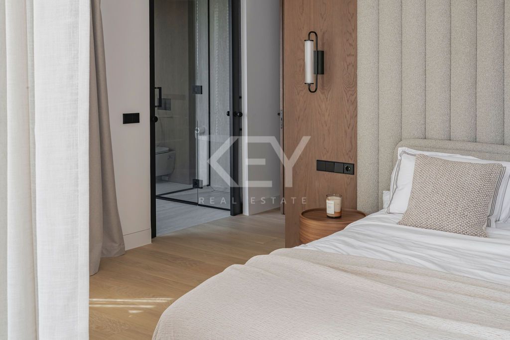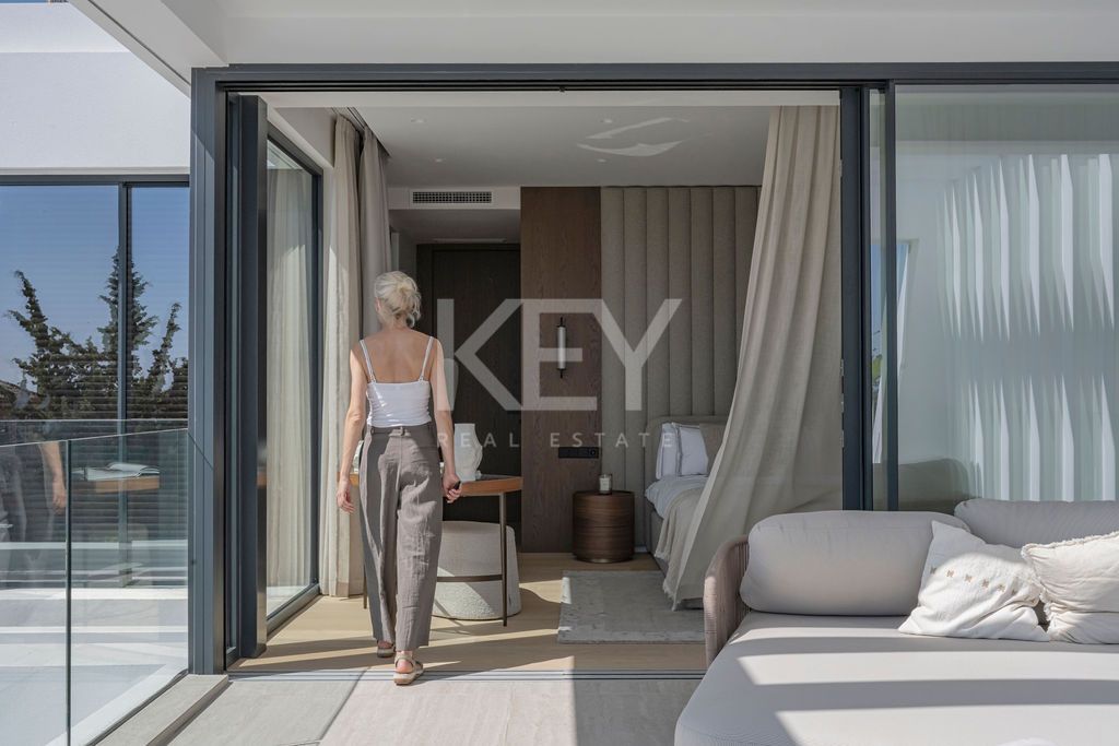 Inside, the villa features a bright open-plan layout with large floor-to-ceiling windows, allowing natural light to flow across the living and dining areas. The connection between indoor and outdoor spaces is seamless, a key element in modern luxury villas in Marbella. The property includes four en-suite bedrooms, with the main suite offering a private terrace and a well-designed bathroom focused on comfort and functionality.