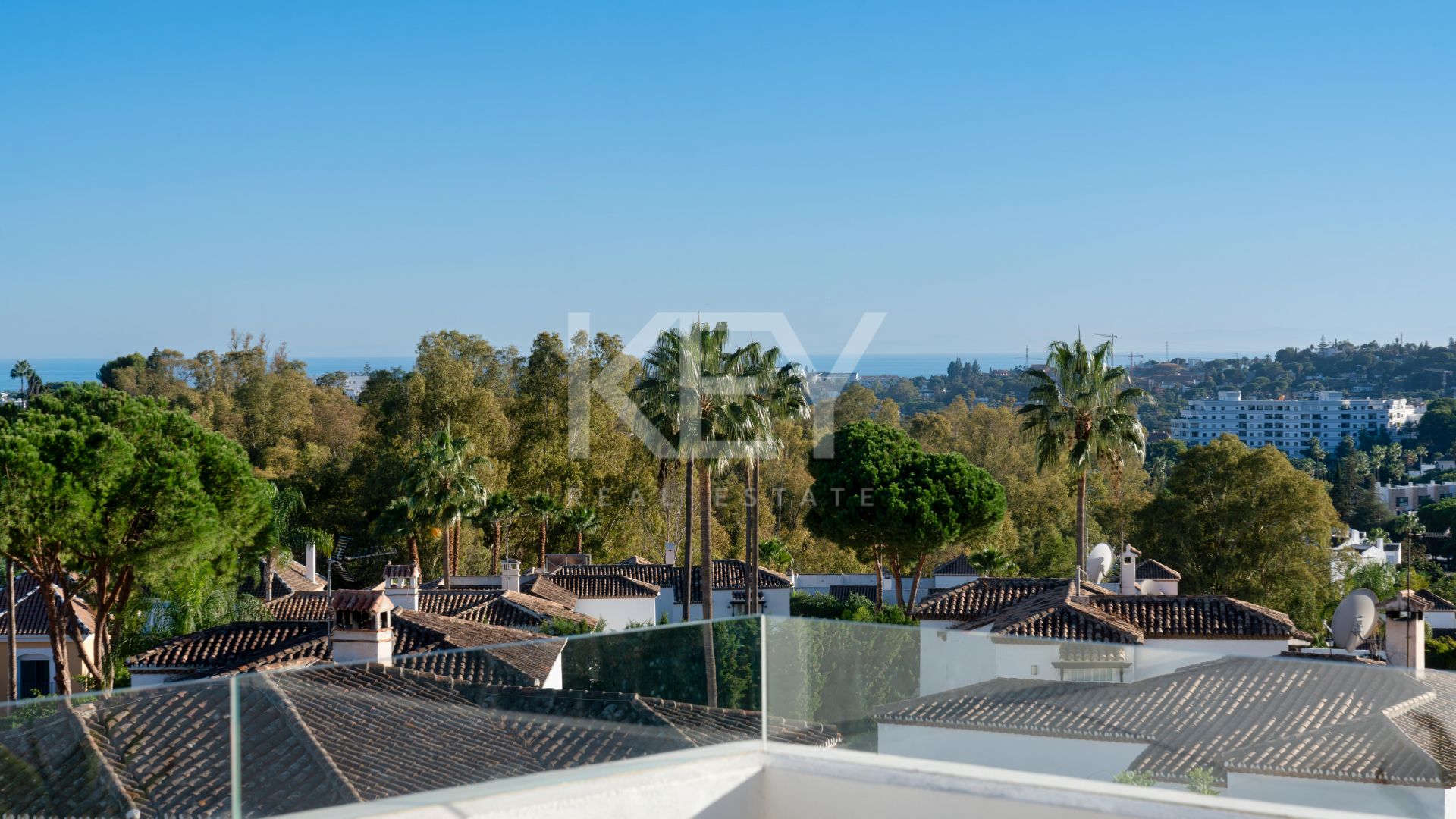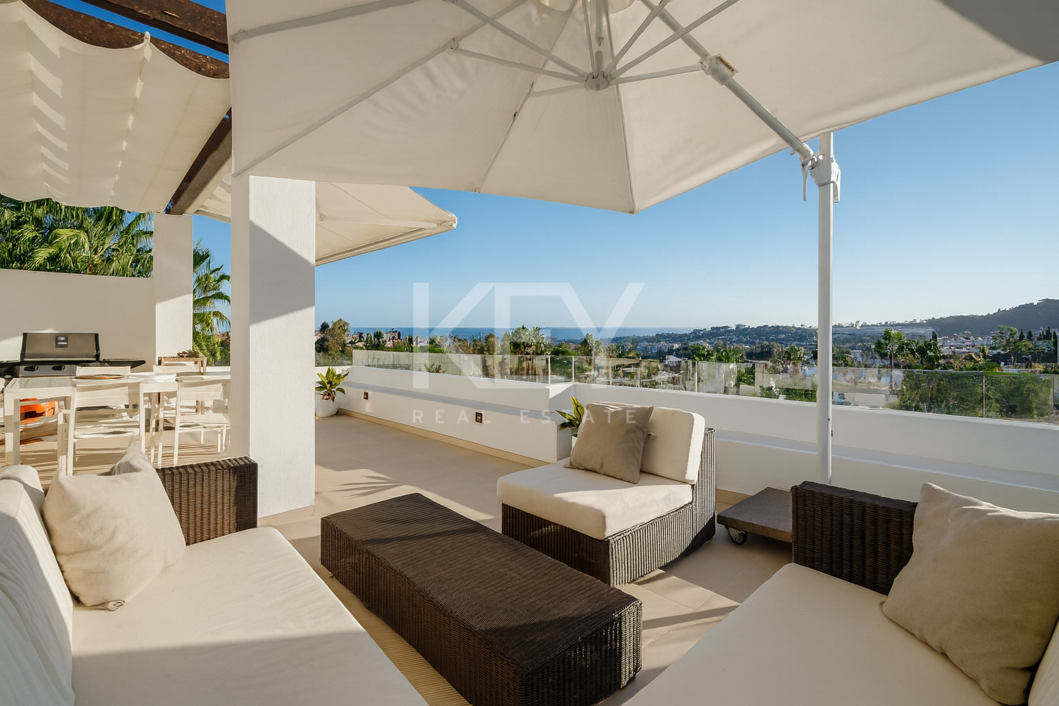 The exterior areas are a defining feature, with generous terraces designed for year-round use. The rooftop terrace offers panoramic views of Nueva Andalucía, La Concha mountain, and the Mediterranean Sea, making it a standout element for buyers searching for properties with sea views in Marbella. There is also the potential to adapt this space with a plunge pool or a private wellness area, increasing both lifestyle value and investment appeal.
