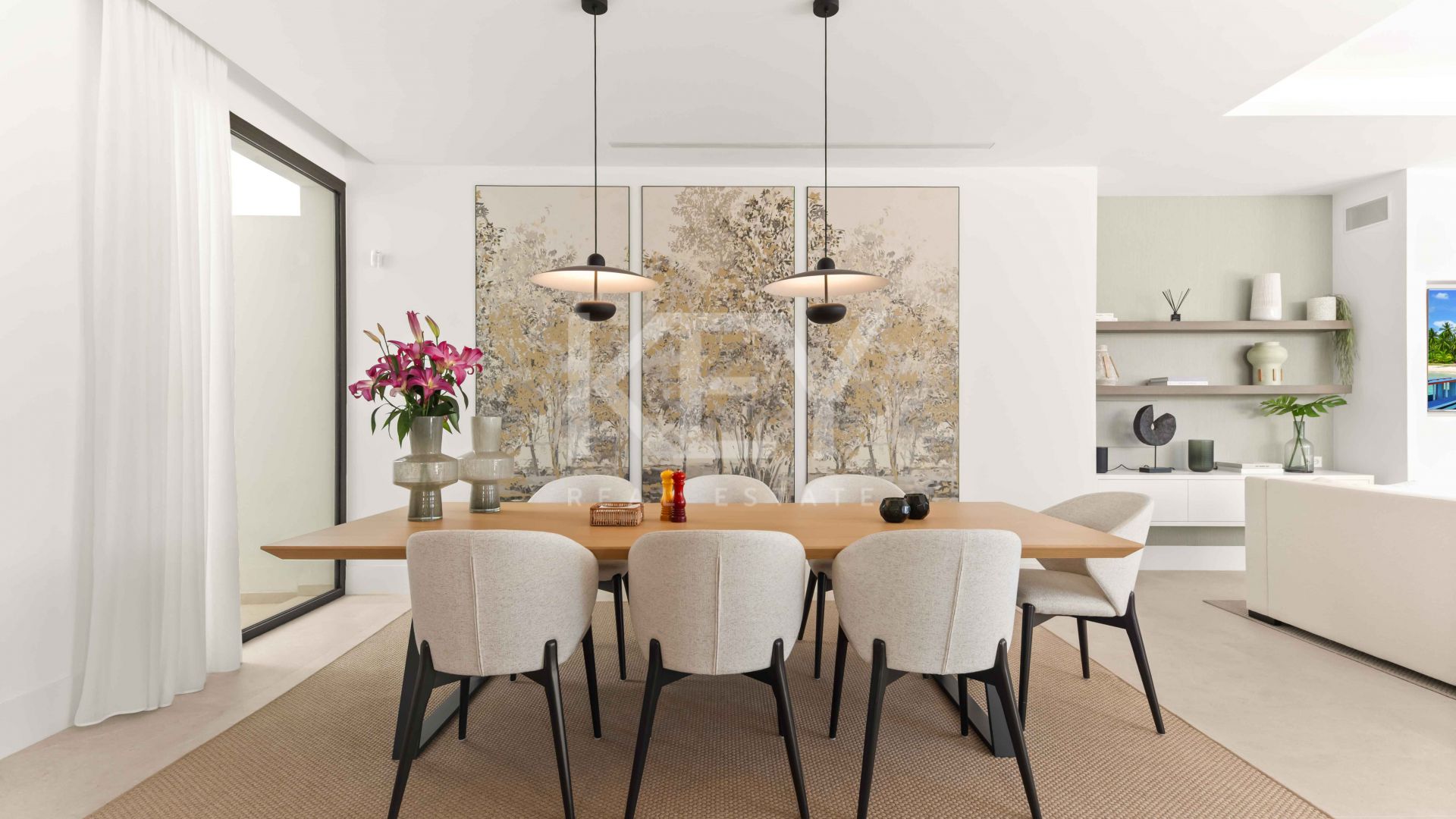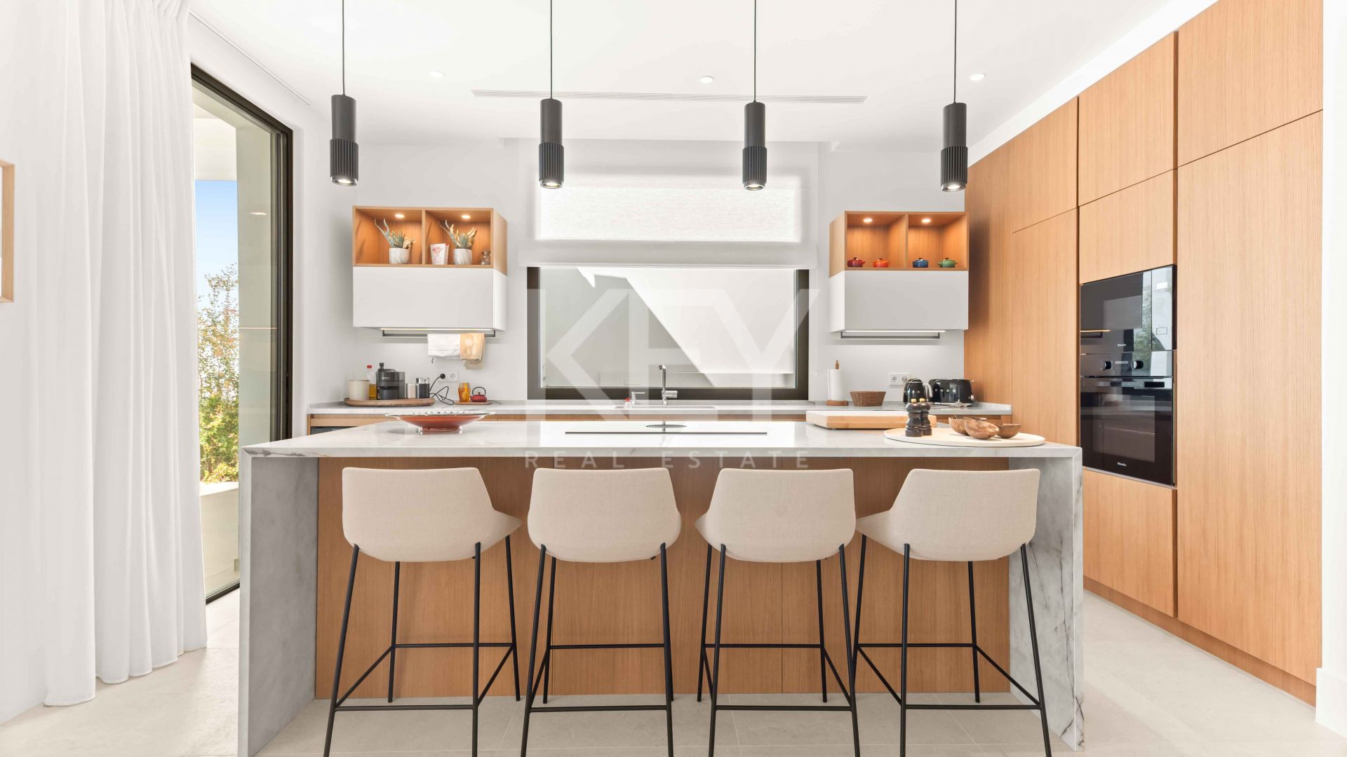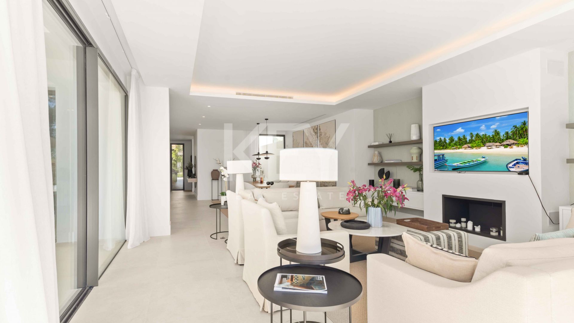 Inside, the main living space is designed as an open-plan layout that connects the lounge, dining area and fully equipped kitchen. Large sliding glass doors allow natural light to flow throughout the interior and create a direct transition to the outdoor terraces. The kitchen includes integrated appliances and a central island, supporting both everyday living and entertaining. The overall design focuses on functionality, clean aesthetics and a seamless indoor-outdoor connection, which is highly requested in modern villas in Marbella.