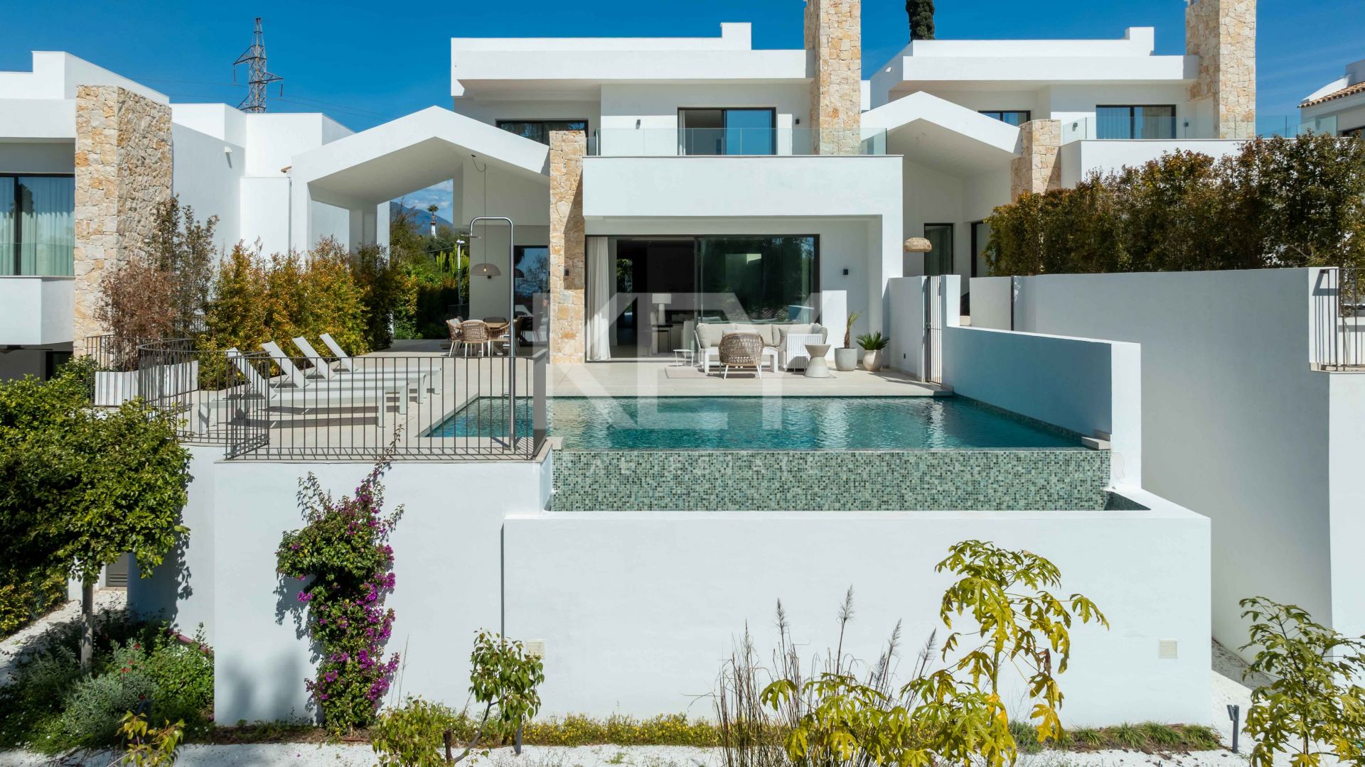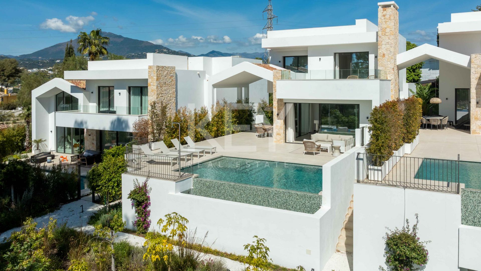 The villa presents a refined architectural composition, combining white geometric volumes with natural stone finishes. Its façade integrates naturally into the surroundings while maintaining a strong visual identity. Located close to golf courses, international schools, shops and restaurants, it offers both convenience and a high-quality residential environment, ideal for families and investors seeking property in Marbella with strong long-term value.