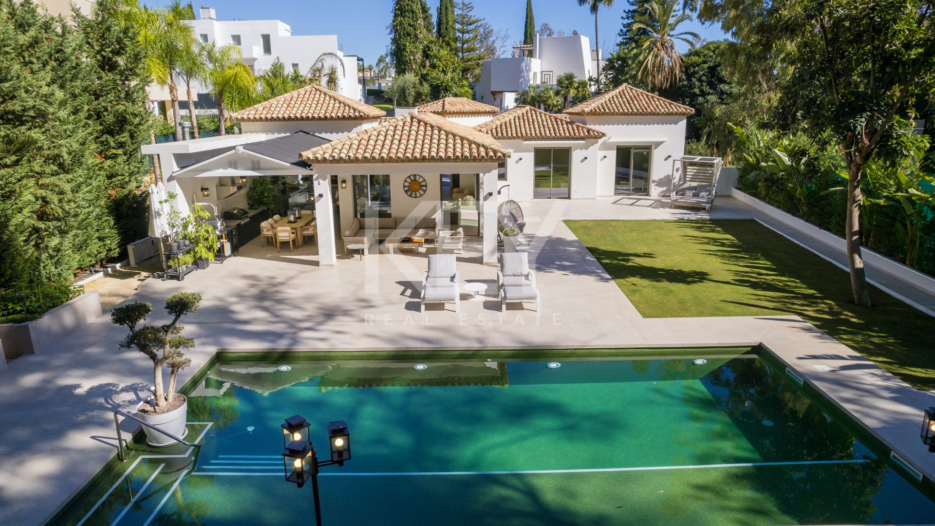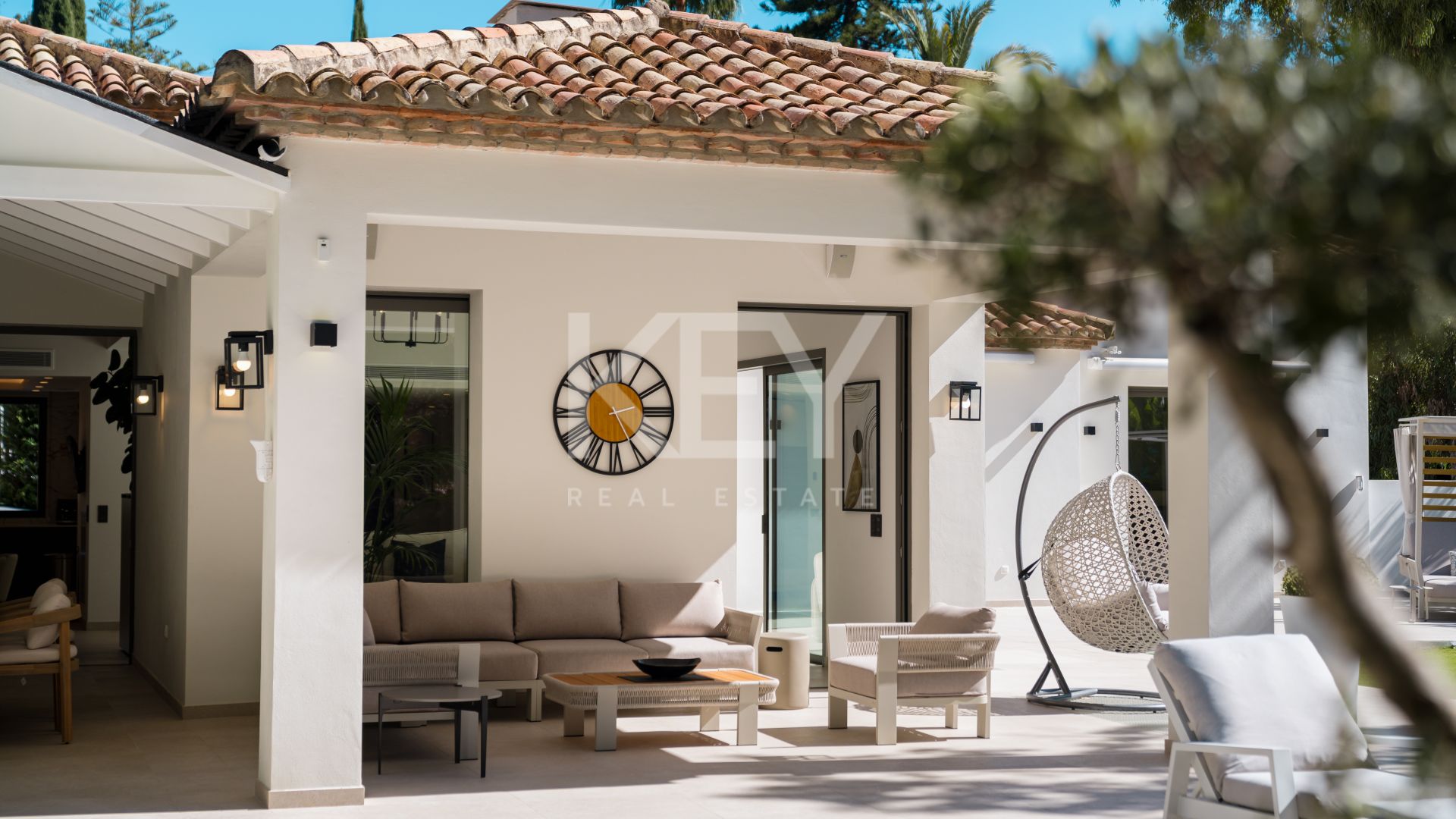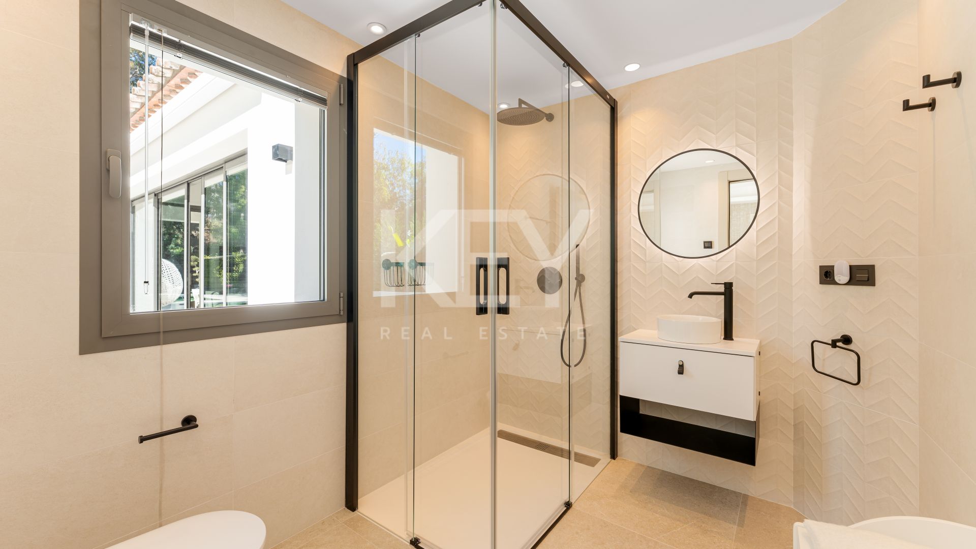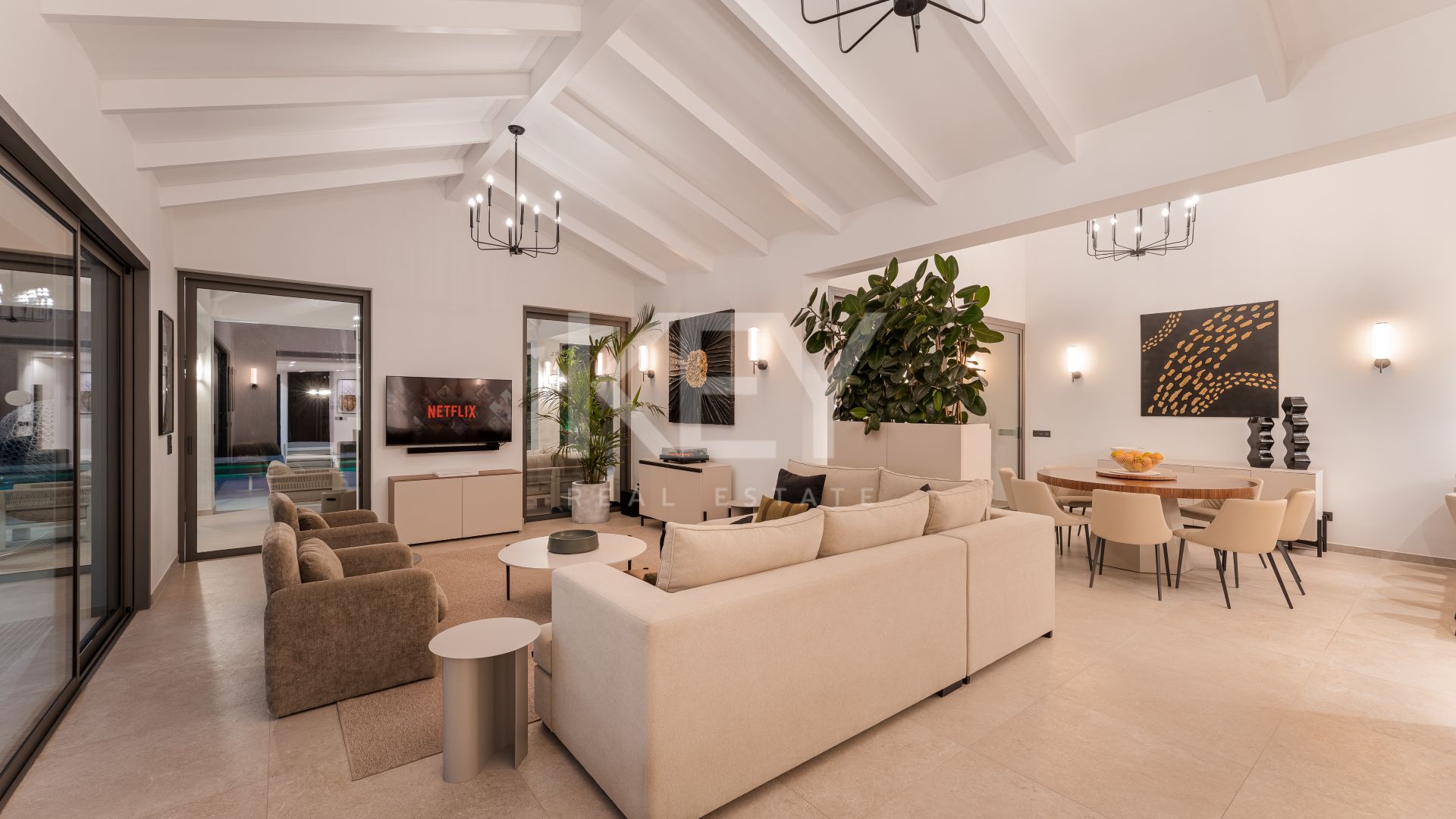 This contemporary five-bedroom villa for sale in Nueva Andalucía offers a refined approach to modern living in one of Marbella’s most sought-after residential areas. Fully renovated in 2025, the property combines clean architectural lines with functional design, creating a home that is both practical and visually striking. Positioned in the heart of the Golf Valley, it benefits from proximity to some of the most established golf courses on the Costa del Sol, making it an ideal choice for buyers searching for luxury property in Marbella near golf.