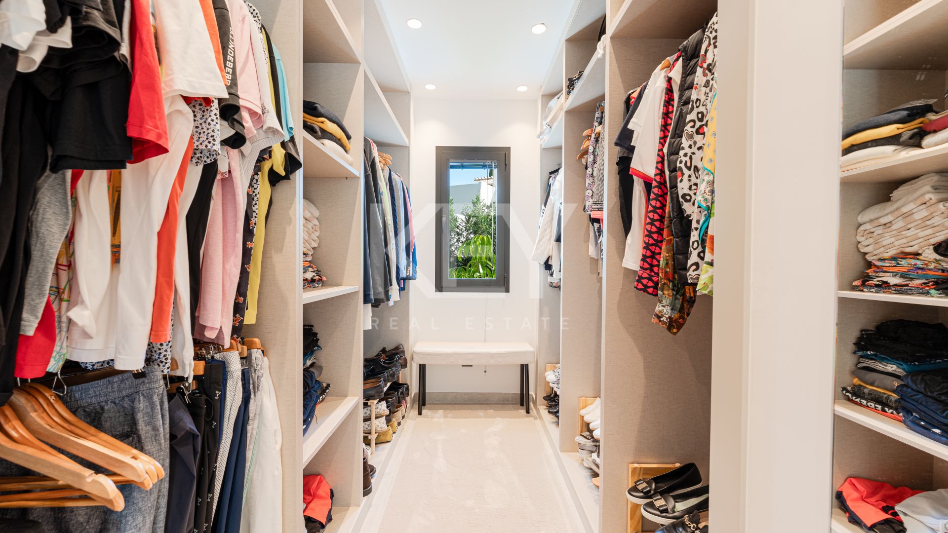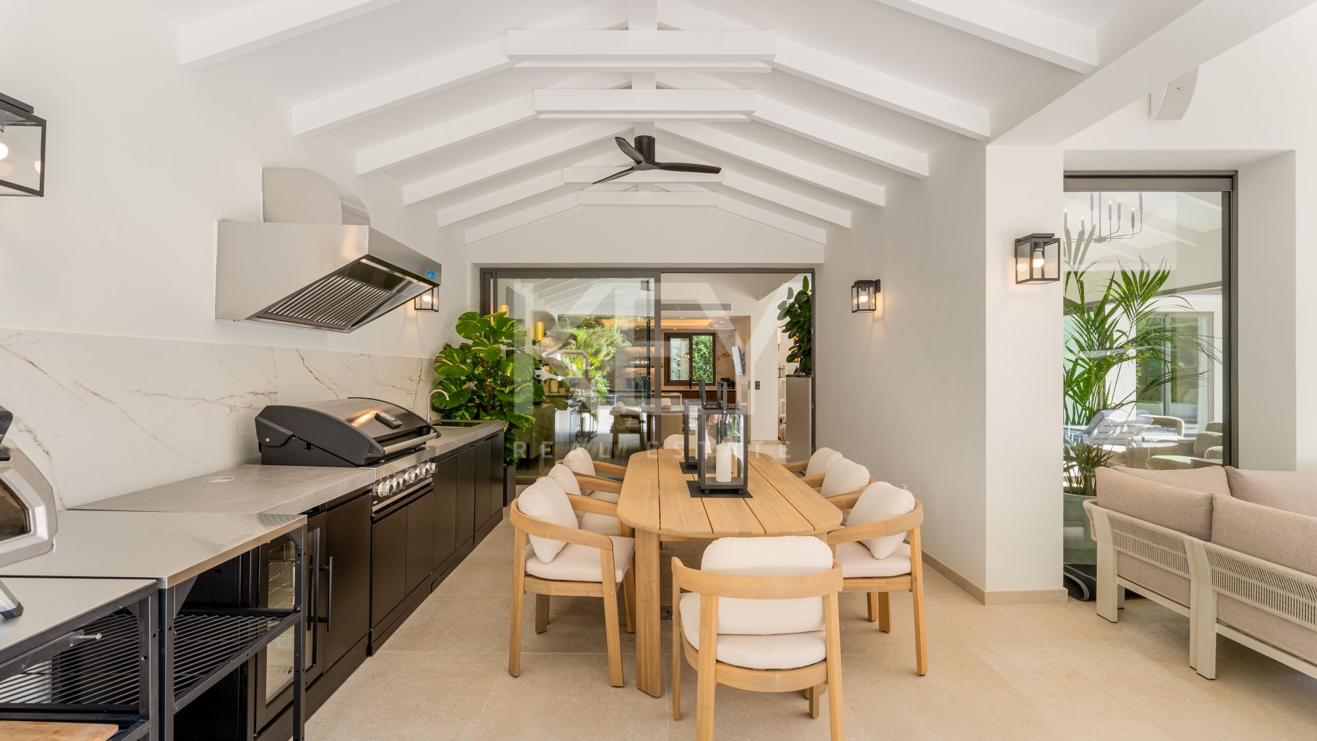 Outdoor spaces are designed for year-round use, featuring landscaped gardens, a private swimming pool prepared for heating, and multiple terraces for dining and relaxation. An outdoor kitchen and lounge areas make it easy to enjoy Marbella’s climate, while the layout ensures privacy without sacrificing openness.