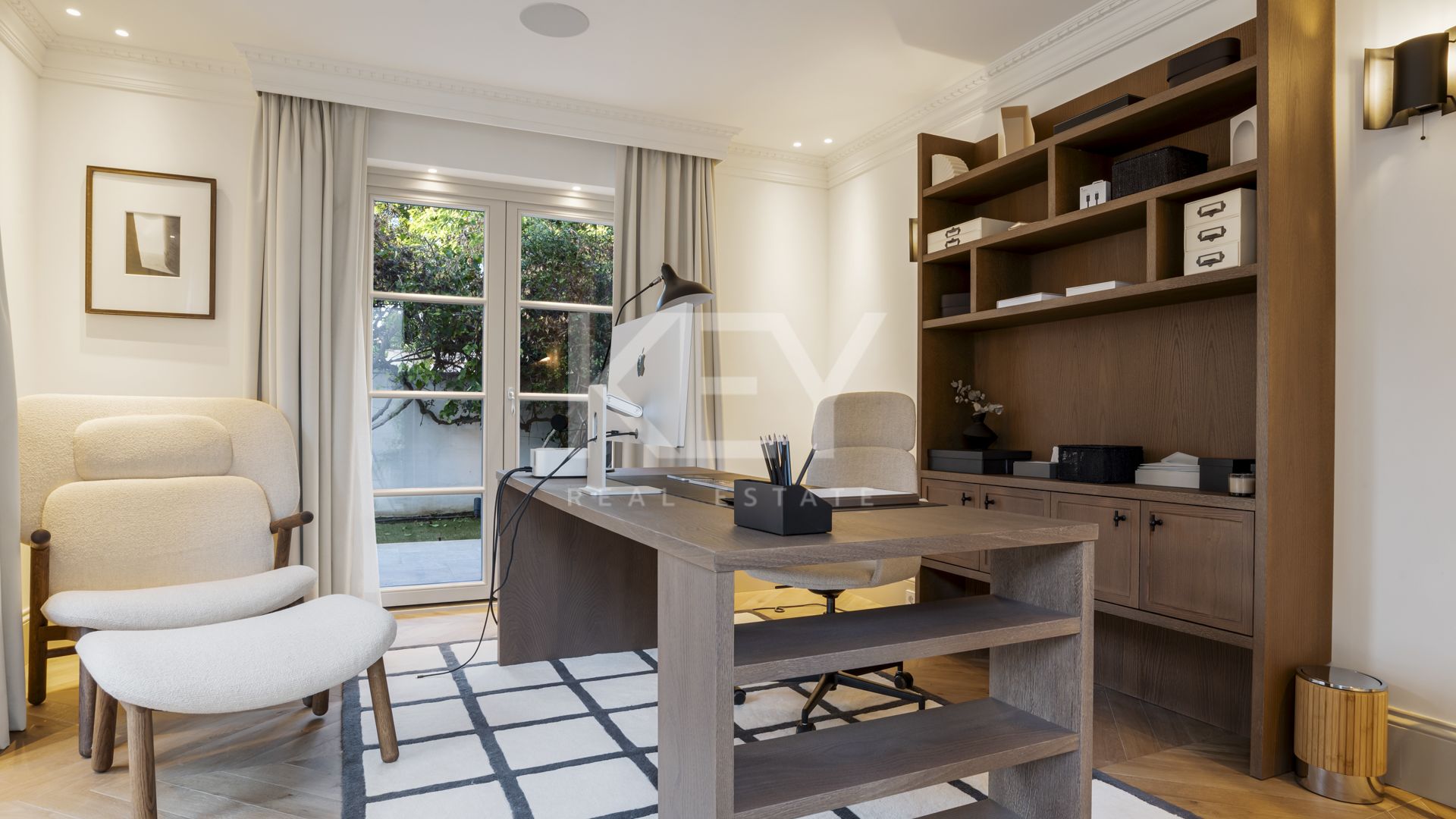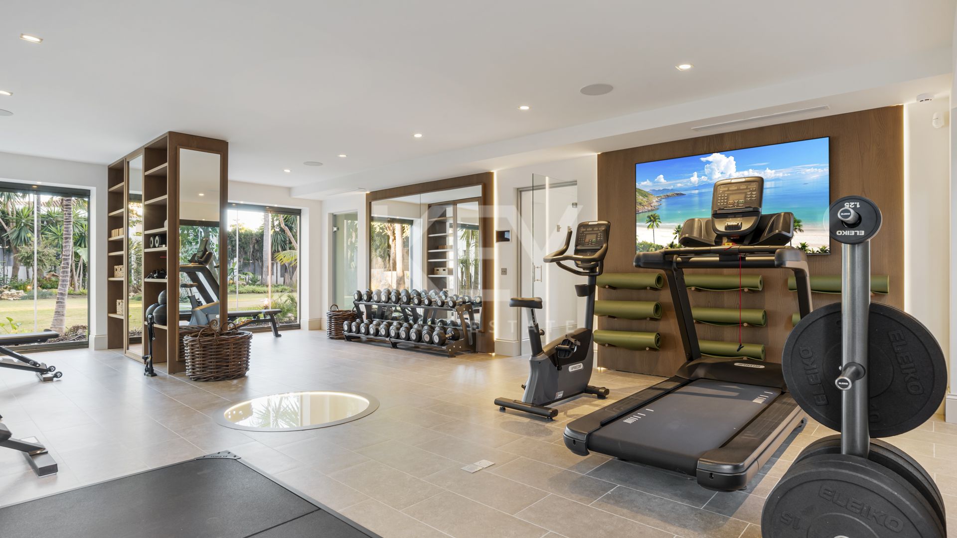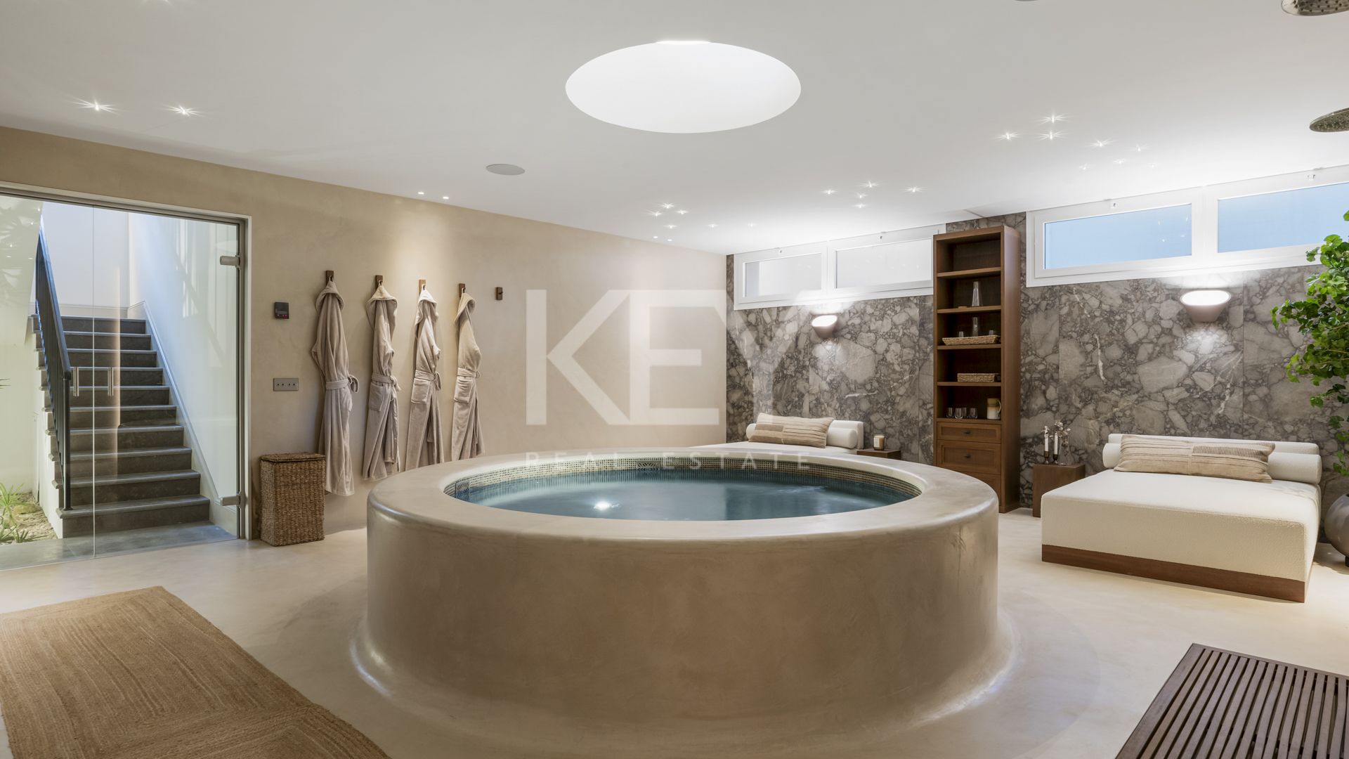 This luxury villa in Marbella is also equipped with features that respond to current lifestyle demands. A private home office provides a dedicated workspace, while a fully equipped gym and private spa area create a complete wellness environment within the property. These elements are integrated into the overall layout, ensuring a seamless living experience rather than isolated additions.