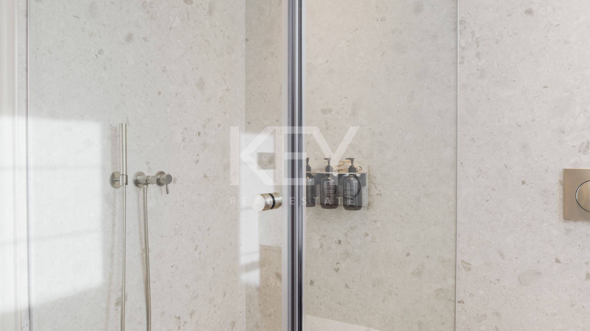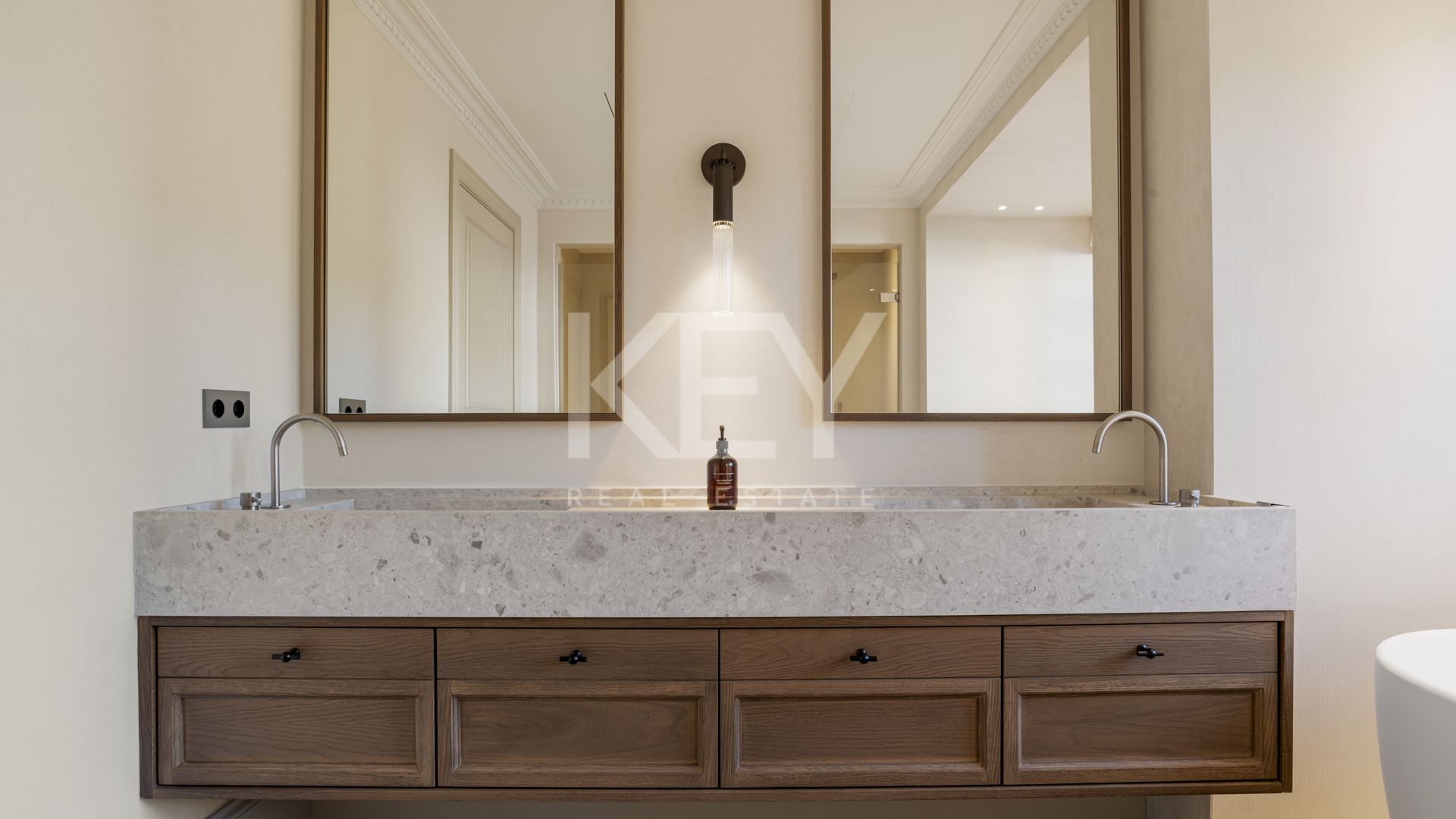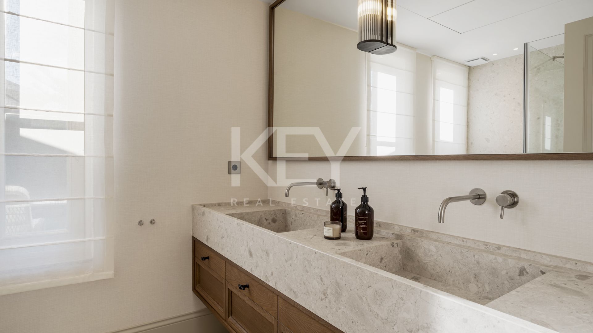 Inside, the property follows a consistent and practical design approach. The custom kitchen is built with usability in mind, offering a clean layout and high-quality finishes that support everyday living. The open-plan living and dining area benefits from generous ceiling heights and direct access to the terraces, allowing natural light to flow throughout the home while maintaining a sense of comfort and structure. Subtle materials and neutral tones contribute to a calm and balanced atmosphere.
