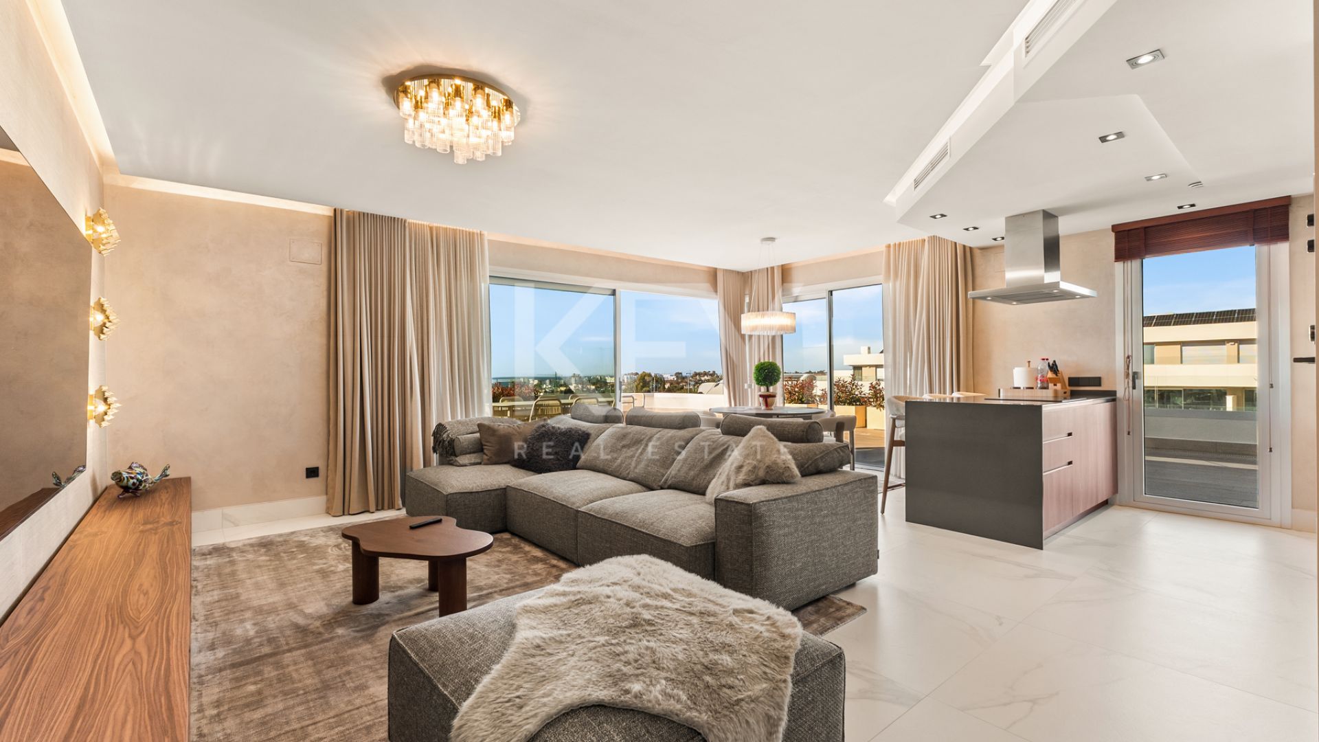 The property has been thoughtfully redesigned to create a more spacious three-bedroom layout, improving flow and usability compared to the original configuration. The interior offers a bright open-plan living and dining area that connects seamlessly with a fully equipped modern kitchen. Large floor-to-ceiling windows maximize natural light and open directly onto an expansive terrace, creating a strong indoor-outdoor connection that is highly sought after in Marbella real estate.